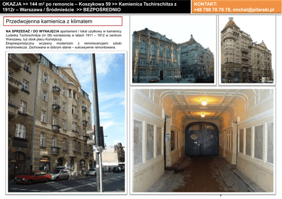 OKAZJA >> 144 m2 po remoncie – Koszykowa 59 >> Kamienica Tschirschitza z 1912r – Warszawa / Śródmieście >> BEZPOŚREDNIO KONTAKT: +48 790 78 76 78, [email protected] Przedwojenna kamienica z klimatem NA SPRZEDAŻ / DO WYNAJĘCIA apartament / lokal użytkowy w kamienicy Ludwika Tschirschnitza (nr 59) wzniesionej w latach 1911 – 1912 w centrum Warszawy, tuż obok placu Konstytucji. Ekspresjonistyczny wczesny modernizm z reminiscencjami sztuki średniowiecza. Zachowana w dobrym stanie – sukcesywnie remontowana. 1 OKAZJA >> 144 m2 po remoncie – Koszykowa 59 >> Kamienica Tschirschitza z 1912r – Warszawa / Śródmieście >> BEZPOŚREDNIO LOKALIZACJA – Warszawa >> Kloszykowa 59 Warszawa >> Koszykowa 59 Ulica została wytyczona w 1770 r. jako aleja placu gwiaździstego Na Rozdrożu - łączyła ten plac z rogatkami na dzisiejszym placu Zawiszy. Przecinała zarazem tereny tzw. Koszyków, czyli miejsca, w którym znajdowała się rezydencja królewska, później zamieniona na folwark, rozparcelowany w 1860 r. Ulica przez długi czas zwała się po prostu Koszyki (w mowie potocznej ciągle jeszcze kupuje się 'na Koszykach'); w 1885 r. zatwierdzono obecną formę KONTAKT: +48 790 78 76 78, [email protected] OKAZJA >> 144 m2 po remoncie – Koszykowa 59 >> Kamienica Tschirschitza z 1912r – Warszawa / Śródmieście >> BEZPOŚREDNIO INFORMACJE OGÓLNE Przeznaczenie: • apartament, luksusowe mieszkanie z klimatem • biuro w prestiżowej lokalizacji około 500m od dworca Warszawa Centralna • kancelarie etc KONTAKT: +48 790 78 76 78, [email protected] Informacje o lokalu: • centrum warszawy • IV piętro w zabytkowej kamienicy • obecna winda • lokal z dwoma wejściami – głównym (z bramy) i od podwórza (służbówka) • wysokość około 350 cm • dwa balkony (od ulicy Koszykowej i od podwórza) • Forma własności: własność (KW). CENA: • Wynajmu: 5800 PLN miesięcznie • Sprzedaży: 1.648.800 PLN (11.450 PLN / m2) Lokal po remoncie w 2007/2008 roku: • Drzwi i okna – zabytkowe – po renowacji • podłogi – panele + terakota • Łazienka po remoncie (kafelki) z oknem, pusta • Ogrzewanie gazowe z pieca dwufunkcyjnego w łazience. • Wymienione instalacje: elektryczna i wodnokanalizacyjna. • Lokal przystosowany na biuro: • wydzielone miejsce na serwerownie • peszle w ścianach: możliwość rozprowadzenia internetu, telefonów do każdego pomieszczenia OKAZJA >> 144 m2 po remoncie – Koszykowa 59 >> Kamienica Tschirschitza z 1912r – Warszawa / Śródmieście >> BEZPOŚREDNIO 1 KONTAKT: +48 790 78 76 78, [email protected] OKAZJA >> 144 m2 po remoncie – Koszykowa 59 >> Kamienica Tschirschitza z 1912r – Warszawa / Śródmieście >> BEZPOŚREDNIO 3 2 KONTAKT: +48 790 78 76 78, [email protected] OKAZJA >> 144 m2 po remoncie – Koszykowa 59 >> Kamienica Tschirschitza z 1912r – Warszawa / Śródmieście >> BEZPOŚREDNIO 4 KONTAKT: +48 790 78 76 78, [email protected] OKAZJA >> 144 m2 po remoncie – Koszykowa 59 >> Kamienica Tschirschitza z 1912r – Warszawa / Śródmieście >> BEZPOŚREDNIO 5 KONTAKT: +48 790 78 76 78, [email protected] OKAZJA >> 144 m2 po remoncie – Koszykowa 59 >> Kamienica Tschirschitza z 1912r – Warszawa / Śródmieście >> BEZPOŚREDNIO 6 7 8 KONTAKT: +48 790 78 76 78, [email protected] OKAZJA >> 144 m2 po remoncie – Koszykowa 59 >> Kamienica Tschirschitza z 1912r – Warszawa / Śródmieście >> BEZPOŚREDNIO 9 KONTAKT: +48 790 78 76 78, [email protected]