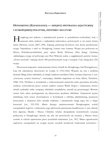 HONGKONG (XIANGGANG) — MIEJSCE SPOTKANIA AZJATYCKIEJ I EUROPEJSKIEJ POLITYKI, HISTORII I KULTURY H ongkong jest jednym z największych portów w południowo-wschodniej Azji, a zarazem także jednym z najbardziej malowniczo położonych w tej części świata miast (Morton, Lewis, 2007, 299). Zajmuje półwysep Kowloon oraz liczne przybrzeżne wyspy. Największe z nich to: Hongkong, Lantau oraz Lamma. Wyspa jest położona na Morzu Południowochińskim, przy ujściu Rzeki Perłowej (Zhu Jiang). Cieśniną oddzielającą wyspę od półwyspu jest Port Wiktorii, jeden z najgłębszych portów świata. „Nowe terytoria” zajmują około 200 przybrzeżnych wysp i wysepek. Cały okręg liczy 234 wyspy. Pierwszymi kupcami i misjonarzami, którzy dotarli do Hongkongu, byli Portugalczycy. Lata ich największej aktywności na wyspie to 1514-1662. Wiązała się ona z polityką dynastii Ming, która zakładała, że dzięki szlakom morskim Chiny zostaną włączone w tzw. „ówczesny system światowy”, otwierający chińskie imperium na świat (Mote, Twitchett, 1988, 333). Problem w kontaktach z cudzoziemcami stanowiła mało przydatna dworska etykieta, wykształcona przez system rządów cesarza Wanli. Kupcy i misjonarze, którzy chcieli zaskarbić sobie sympatię chińskich urzędników, musieli jej przestrzegać. Równie ważne było także posługiwanie się klasycznym językiem chińskim. Znajomość języka chińskiego była wręcz obowiązkowa w kontaktach z chińską administracją, ponieważ korzystanie z tłumacza było niemile widziane i umniejszało rangę tego, kto z niego korzystał (j.w., 333-335). Mimo dużego zainteresowania Hongkongiem wśród europejskich kupców i misjonarzy, jego głównymi partnerami handlowymi w tym okresie były Japonia, Manila i Macao. Chińskie władze skrupulatnie kontrolowały sytuację polityczną w Hongkongu. Starały się, aby nie powtórzyła się sytuacja z Macao, które zostało w całości opanowane przez jezuickich misjonarzy (j.w., 347). Mimo ograniczenia wpływów europejskich na wyspie jezuici uzyskali możliwość budowania kościołów i 25 Kultura — Historia — Globalizacja Nr 6 PAULINA PARCEWICZ Paulina Parcewicz , Hongkong (Xianggang)… prowadzenia działalności misyjnej. Nie mieli jednak praw politycznych, by móc rządzić i wprowadzać swoje prawa na wyspie (j.w., 348-350). Rola Hongkongu w polityce międzynarodowej rozpoczęła się w momencie, gdy na wyspie schronili się uciekający z Kantonu brytyjscy kupcy. Powodem ucieczki było zerwanie umów handlowych przez komisarza Lin Zexu w związku ze zbliżającą się wojną opiumową (Pepper, 1997, 685). W swoim założeniu Traktat nankiński z 1842 roku przekazywał wyspę na zawsze Wielkiej Brytanii. Z kolei na mocy traktatu z Tianjin z 1858 roku Wielka Brytania uzyskała dodatkowo jeszcze południową część półwyspu Kowloon (Polit, 2004, 286). W 1898 roku Brytyjczycy (biorący udział w wyścigach po koncesje) uzyskali od Chin umowę na 99-letnią dzierżawę terytoriów na północ od Kowloonu (Kajdański, 2005, 85). Całość zdobytego przez Wielką Brytanię obszaru została połączona w jeden system pod rządami kolonialnymi. Po dojściu do władzy komunistów w 1949 roku Hongkong i Macao zostały jedynymi chińskimi portami pod zachodnią kontrolą (Pepper, 1997, 300). Komuniści co prawda stwierdzili nieważność zawartych wcześniej (wymuszonych) kontraktów, ale zezwolili na działalność Hongkongu jako ważnego ośrodka handlu. Hongkong po 1949 roku stał się nie tylko miejscem ucieczki Chińczyków przed komunizmem, ale i przybrzeżną bazą ekonomiczną dla Chin, utrzymywaną przez uciekinierów, którzy dążyli do osłabienia embarga ONZ i starali się stworzyć szlaki handlowe z Chinami we wczesnych latach pięćdziesiątych (j. w., 301-304). Emigranci chińscy w Hongkongu liczyli w czasie II wojny światowej ok. 0,5 mln, w 1951 roku 2,25 mln, w 1981 roku 5,1 mln a w 1997 roku 6,3 mln osób. Na początku lat 80-tych eksport chiński do Hongkongu (również tranzytowy) stanowił — w zależności od szacunków — 30-40% całkowitego dochodu ChRL z handlu zagranicznego (j. w., 686). Obawa przed chińska wojna domową i niestabilność na granicach spowodowały, że Brytyjczycy po 1949 roku odłożyli plany nadania samorządności Hongkongowi. Chociaż zdawali sobie sprawę, że takie posunięcie polityczne jest konieczne, by pozyskać sympatię miejscowych elit finansowych. Generalnie — lokalny rząd był złożony z probrytyjsko nastawionych elit, głównie biznesowych, zarówno emigrantów, jak i lokalnych Chińczyków — antykomunistów. Najważniejsze urzędy były obsadzane jednak przez brytyjskiego gubernatora. 26 — kulturowy, polityczny i społeczny. Miała ona jednak własne szkoły i wydawnictwa Najważniejsza prochińska organizacja — Federacja Związków Zawodowych — w latach 80-tych liczyła nieco poniżej 200 tys. członków. Hongkong aż do schyłku XX wieku funkcjonował więc jako anomalia — kolonia nie będąca kolonią, antykomunistyczne miasto rozwijające się ekonomicznie dzięki kontaktom z Chinami. W latach 1982-1983 Hongkong musiał stawić czoło faktowi, że powrót do Chin stawał się wydarzeniem coraz bardziej realnym. Po wydarzeniach na placu Tiananmen w 1989 roku Hongkong miał coraz większe obawy przed powrotem do sytemu ChRL. We wrześniu 1982 roku Chiny formalnie zawiadamiały Wielką Brytanię, że do 1997 roku chcą zwrotu Hongkongu. W samym Hongkongu spowodowało to panikę — w ciągu roku dolar HK stracił 40 % wartości (j. w., 687). Pod wpływem niekorzystnych nastrojów panujących na wyspie czołowi przedstawiciele społeczeństwa Hongkongu szukali pomocy w Londynie. Do tej pory celem elit Hongkongu było stać się drugim Singapurem (uzyskać pełną niezależność) — teraz wydało się to już jednak niemożliwe. Próbowano, poprzez rozmowy z Londynem i Pekinem, przekonać Chińczyków, a