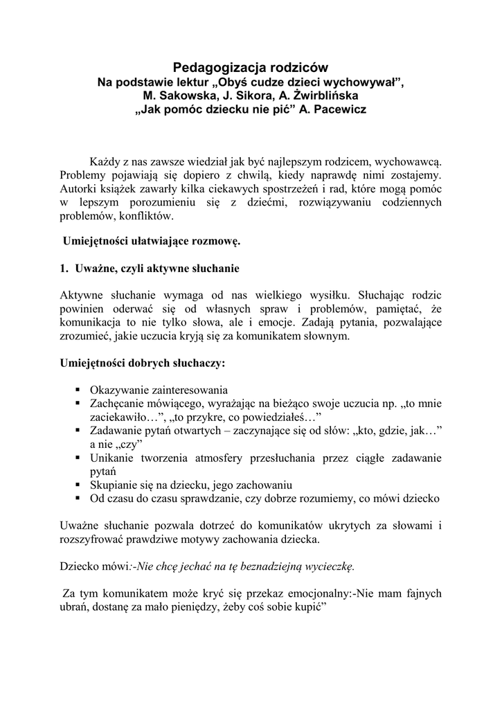 Pedagogizacja rodziców Na podstawie lektur „Obyś cudze dzieci wychowywał”, M. Sakowska, J. Sikora, A. Żwirblińska „Jak pomóc dziecku nie pić” A. Pacewicz Każdy z nas zawsze wiedział jak być najlepszym rodzicem, wychowawcą. Problemy pojawiają się dopiero z chwilą, kiedy naprawdę nimi zostajemy. Autorki książek zawarły kilka ciekawych spostrzeżeń i rad, które mogą pomóc w lepszym porozumieniu się z dziećmi, rozwiązywaniu codziennych problemów, konfliktów. Umiejętności ułatwiające rozmowę. 1. Uważne, czyli aktywne słuchanie Aktywne słuchanie wymaga od nas wielkiego wysiłku. Słuchając rodzic powinien oderwać się od własnych spraw i problemów, pamiętać, że komunikacja to nie tylko słowa, ale i emocje. Zadają pytania, pozwalające zrozumieć, jakie uczucia kryją się za komunikatem słownym. Umiejętności dobrych słuchaczy: Okazywanie zainteresowania Zachęcanie mówiącego, wyrażając na bieżąco swoje uczucia np. „to mnie zaciekawiło…”, „to przykre, co powiedziałeś…” Zadawanie pytań otwartych – zaczynające się od słów: „kto, gdzie, jak…” a nie „czy” Unikanie tworzenia atmosfery przesłuchania przez ciągłe zadawanie pytań Skupianie się na dziecku, jego zachowaniu Od czasu do czasu sprawdzanie, czy dobrze rozumiemy, co mówi dziecko Uważne słuchanie pozwala dotrzeć do komunikatów ukrytych za słowami i rozszyfrować prawdziwe motywy zachowania dziecka. Dziecko mówi:-Nie chcę jechać na tę beznadziejną wycieczkę. Za tym komunikatem może kryć się przekaz emocjonalny:-Nie mam fajnych ubrań, dostanę za mało pieniędzy, żeby coś sobie kupić” Dobrzy słuchacze upewniają się do intencji, uczuć i treści przekazu, aby móc dzięki temu uniknąć zniekształceń informacji. Kiedy słuchanie jest pozorne? Kiedy bardziej skupiamy się na tym, co chcemy sami powiedzieć i w efekcie nie zwracamy uwagi, co dziecko do nas mówi. Czekamy tylko na to, aby wejść mu w słowo i przedstawić nasz punkt widzenia. Słuchamy tylko to, co chcemy usłyszeć. Przerywamy dziecku wypowiedź i kończymy za niego, zniekształcając ją do własnych celów. Zadajemy pytania, by oceniać lub krytykować, np. „Kto cię do tego namówił?”, „Co to znaczy, że nie wiedziałeś?... 2. Zdolność przekazywania akceptacji. Akceptację przekazujemy w myśl zasady: ”akceptuję cię jakim jesteś, akceptuję twoje uczucia, nie akceptuję tylko twojego zachowania” Oto przykłady: Zachowanie dziecka: arogancja, podniesiony ton głosu. Reakcja rodzica: wypowiedź: „Rozumiem, że jesteś zły, ale nie podoba mi się, gdy mówisz w ten sposób.” Zawiera komunikat ukryty:” Rozumiem twoje uczucia, szanuję cię, choć nie mogę zaakceptować tego, co robisz”. Skutek: redukuje złość, ułatwia kontakt 3. Otwartość w wyrażaniu uczuć oraz informowanie o własnych potrzebach. Komunikacja, aby była skuteczna, musi być dwukierunkowa. Rodzic też ma emocje, również negatywne. Ukrywanie uczuć blokuje kontakt, gdyż dziecko odczytuje je jako fałsz i nieszczerość, poza tym tłumione uczucia muszą znaleźć gdzieś ujście – to Ne właśnie są przyczyną niekontrolowanych wybuchów złości, złośliwości, sarkazmu. Otwartość to bezpośrednie wyrażanie uczuć w odpowiedzi na zaistniałą sytuację „Tu i teraz” – reakcje są adekwatne do sytuacji, a przez to zrozumiałe dla dziecka. Wyładowanie to efekt nagromadzenia negatywnych uczuć – reakcje są przesadzone, niezrozumiałe, nieadekwatne do sytuacji. Zawierają wypowiedzi często nawiązujące do przeszłych sytuacji, np. „zawsze”, „nigdy”, „jak zwykle”. Osoba, na której wyładowuje się emocje czuje się atakowana, broni się. 4. Komunikaty JA Pozwalają one w otwarty sposób mówić o własnych emocjach i potrzebach. Zawierają trzy elementy: Informację o zachowaniu dziecka:” Kiedy bez słowa odszedłeś…” Opis skutków:” straciłam dużo czasu na szukanie cię.” Opis stanu uczuć:” …i bardzo się o ciebie martwiłam.” Wypowiedź zamiast charakteru informujący, co czuje rodzic. oceniającego dziecko, ma charakter Przykłady komunikatów JA i komunikatów TY Opis sytuacji 1. Dziecko przychodzi do rodzica ze swoim problemem. Rodzic w tej chwili źle się czuje, nie ma sił i ochoty rozmawiać z dzieckiem. Komunikat TY Komunikat JA - Daj mi spokój, nie - Bardzo boli mnie dziś zawracaj mi głowy. głowa, możemy porozmawiać o tym - Nie przeszkadzaj mi. później? - Znowu coś chcesz ode Jestem dziś w mnie? wyjątkowo złej formie i boję się, że nie jestem w stanie odpowiednio się skupić. Czy ta sprawa może poczekać? 2. Dziecko ma w pokoju Jesteś bałagan. bałaganiarz. okropny - Kiedy zostawiasz w pokoju bałagan, jestem zła, bo wtedy sprzątam - Jesteś leń, nic ci się nie za ciebie i tracę chce robić. mnóstwo czasu. - Kiedy zostawiasz w 3. Dziecko sklepie. biega w - Zachowujesz się jak dzikie zwierzę! Nie będzie wieczorem telewizji!! pokoju bałagan jest mi za ciebie wstyd i sprzątam za ciebie. - Nie lubię tego, co robisz. To przeszkadza sprzedawcom, kiedy biegasz między półkami. 4. Dziecko zostawiło na - Jesteś okropny, mam - Jestem wściekły, że dworze narzędzie i w cię dosyć! moja nowa piła efekcie zostało została na zewnątrz i uszkodzone. zardzewiała. - Oczekuję od ciebie, że kiedy pożyczasz moje narzędzia, będziesz je zwracał natychmiast i w dobrym stanie. 5. Dziecko nie zgasiło - Ile razy ci muszę światła po wyjściu z mówić, abyś zgasił łazienki. światło po wyjściu z łazienki!! - Denerwuję się, kiedy nie możesz zapamiętać, aby zgasić po sobie światło w łazience. Rozmawiaj z dzieckiem. Nie stosuj cenzury, nie unikaj tematów zakazanych. Twoje dziecko musi czuć, że może rozmawiać z tobą o wszystkim, począwszy od alkoholu czy seksu, a skończywszy na młodzieżowej modzie i piłce nożnej. Jeżeli zmieniasz temat albo się wśc