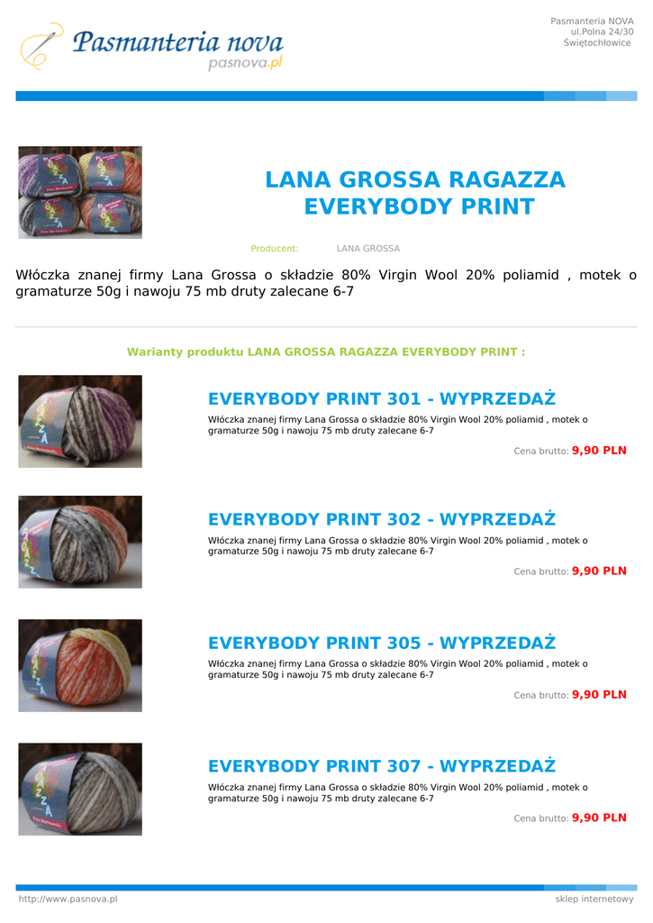 Pasmanteria NOVA ul.Polna 24/30 Świętochłowice LANA GROSSA RAGAZZA EVERYBODY PRINT Producent: LANA GROSSA Włóczka znanej firmy Lana Grossa o składzie 80% Virgin Wool 20% poliamid , motek o gramaturze 50g i nawoju 75 mb druty zalecane 6-7 Warianty produktu LANA GROSSA RAGAZZA EVERYBODY PRINT : EVERYBODY PRINT 301 - WYPRZEDAŻ Włóczka znanej firmy Lana Grossa o składzie 80% Virgin Wool 20% poliamid , motek o gramaturze 50g i nawoju 75 mb druty zalecane 6-7 Cena brutto: 9,90 PLN EVERYBODY PRINT 302 - WYPRZEDAŻ Włóczka znanej firmy Lana Grossa o składzie 80% Virgin Wool 20% poliamid , motek o gramaturze 50g i nawoju 75 mb druty zalecane 6-7 Cena brutto: 9,90 PLN EVERYBODY PRINT 305 - WYPRZEDAŻ Włóczka znanej firmy Lana Grossa o składzie 80% Virgin Wool 20% poliamid , motek o gramaturze 50g i nawoju 75 mb druty zalecane 6-7 Cena brutto: 9,90 PLN EVERYBODY PRINT 307 - WYPRZEDAŻ Włóczka znanej firmy Lana Grossa o składzie 80% Virgin Wool 20% poliamid , motek o gramaturze 50g i nawoju 75 mb druty zalecane 6-7 Cena brutto: http://www.pasnova.pl 9,90 PLN sklep internetowy