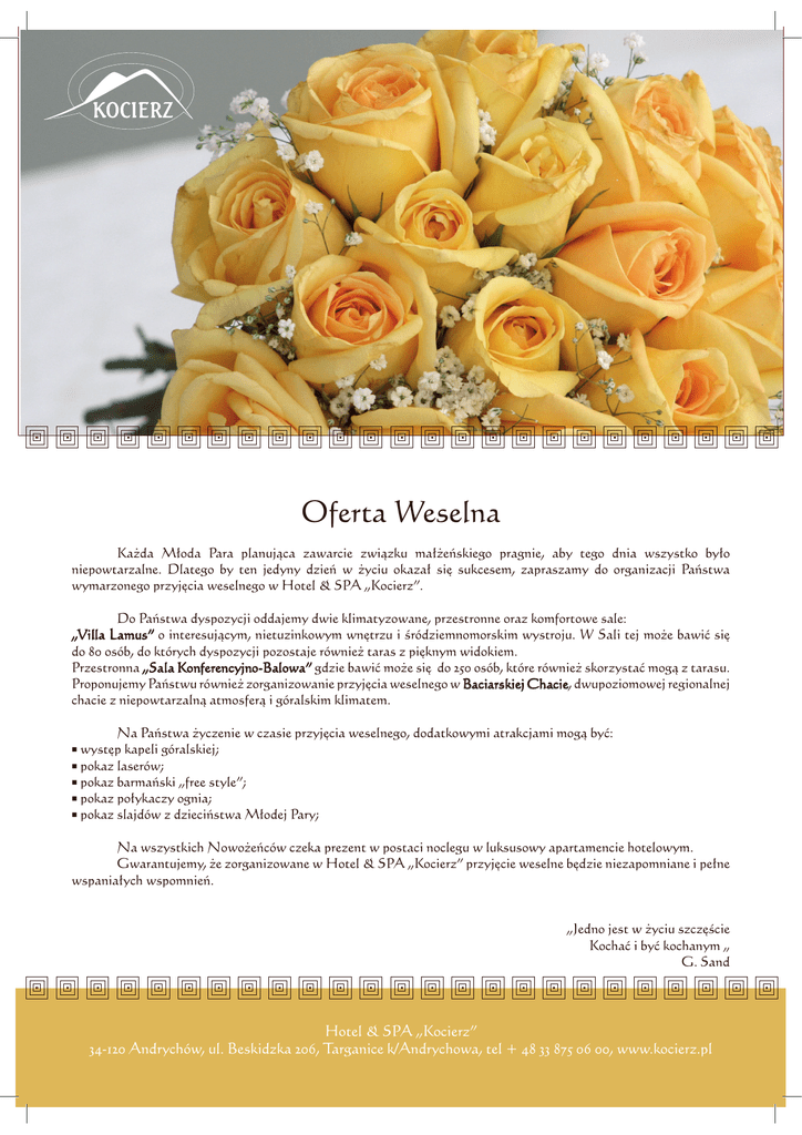 Oferta Weselna KaŜda Młoda Para planująca zawarcie związku małŜeńskiego pragnie, aby tego dnia wszystko było niepowtarzalne. Dlatego by ten jedyny dzień w Ŝyciu okazał się sukcesem, zapraszamy do organizacji Państwa wymarzonego przyjęcia weselnego w Hotel & SPA „Kocierz”. Do Państwa dyspozycji oddajemy dwie klimatyzowane, przestronne oraz komfortowe sale: „Villa Lamus” o interesującym, nietuzinkowym wnętrzu i śródziemnomorskim wystroju. W Sali tej moŜe bawić się do 80 osób, do których dyspozycji pozostaje równieŜ taras z pięknym widokiem. Przestronna „Sala Konferencyjno-Balowa” gdzie bawić moŜe się do 250 osób, które równieŜ skorzystać mogą z tarasu. Proponujemy Państwu równieŜ zorganizowanie przyjęcia weselnego w Baciarskiej Chacie, dwupoziomowej regionalnej chacie z niepowtarzalną atmosferą i góralskim klimatem. Na Państwa Ŝyczenie w czasie przyjęcia weselnego, dodatkowymi atrakcjami mogą być: występ kapeli góralskiej; pokaz laserów; pokaz barmański „free style”; pokaz połykaczy ognia; pokaz slajdów z dzieciństwa Młodej Pary; Na wszystkich NowoŜeńców czeka prezent w postaci noclegu w luksusowy apartamencie hotelowym. Gwarantujemy, Ŝe zorganizowane w Hotel & SPA „Kocierz” przyjęcie weselne będzie niezapomniane i pełne wspaniałych wspomnień. „Jedno jest w Ŝyciu szczęście Kochać i być kochanym „ G. Sand Hotel & SPA „Kocierz” 34-120 Andrychów, ul. Beskidzka 206, Targanice k/Andrychowa, tel + 48 33 875 06 00, www.kocierz.pl
