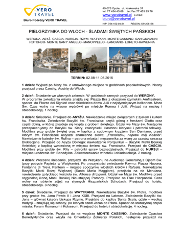 45-075 Opole, ul. Krakowska 37 tel. 77 454 45 69 tel./fax 77 453 95 76 www.verotravel.pl e-mail: Biuro PodróŜy VERO TRAVEL [email protected] NIP: 754-152-04-24 REGON: 531208198 PIELGRZYMKA DO WŁOCH - ŚLADAMI ŚWIĘTYCH PAŃSKICH WERONA- ASYś- CASCIA- NURSJA- RZYM- WATYKAN- MONTE CASSINO- SAN GIOVANNI ROTONDO- MONTE SANT' ANGELO- MANOPPELLO - LANCIANO- LORETO-RAWENNA TERMIN: 02.08-11.08.2015 1 dzień: Wyjazd po Mszy św. z umówionego miejsca w godzinach popołudniowych. Nocny przejazd przez Czechy, Austrię do Włoch. 2 dzień: Śniadanie we własnych zakresie. W godzinach rannych przyjazd do WERONY. W programie zwiedzania miasta znajdą się: Piazza Bra z okazałym rzymskim Amfiteatrem, spacer do Piazza dei Signiori oraz dziedziniec domu Julii z najsłynniejszym balkonem. Msza Św. Czas wolny na własne wędrówki po mieście Romea i Julii. Wyjazd na nocleg i obiadokolację. 1 nocleg. 3 dzień: Śniadanie. Przejazd do ASYśU. Nawiedzenie miejsc związanych z Ŝyciem i kultem św. Franciszka. Zwiedzenie Bazyliki św. Franciszka: część górną z freskami Giotta oraz część dolną, w której znajduje się krypta z grobem świętego. Udział we Mszy św. Następnie przespacerujemy do Bazyliki św. Klary, załoŜycielki klasztoru klarysek i patronki telewizji. Modlitwa przy grobie świętej oraz w kaplicy z cudownym krzyŜem San Damiano, przed którym św. Franciszek usłyszał znamienne słowa; „Franciszku, napraw mój Kościół”. Nawiedzenie katedry św. Rufina – patrona miasta i męczennika za wiarę za czasów cesarza Dioklecjana. Przejazd do AsyŜu Dolnego: nawiedzenie Porcjunkuli – Bazyliki Matki Boskiej Anielskiej z kaplicą wzniesioną w miejscu śmierci św. Franciszka. Przejazd do CASCIA. Modlitwa przy grobie św. Rity – patronki spraw beznadziejnych. Przejazd do NURSJI – miejsca urodzenia św. Benedykta. Zakwaterowanie w hotelu i obiadokolacja. 2 nocleg. 4 dzień: Wczesne śniadanie, przejazd do Watykanu na Audiencje Generalną z Ojcem Sw. (przy pobycie PapieŜa w Watykanie). Po uroczystości zwiedzanie Rzymu: Piazza Navona, Fontanna di Trevi, Panteon – miejsce spoczynku włoskich królów i Rafaela. Nawiedzenie Bazyliki Matki BoŜej Większej (Santa Maria Maggiore), przejścia na via Merulana, nawiedzenie gotyckiego kościoła św. Alfonsa di Liguori. Udział we Mszy św. Modlitwa przed oryginalną ikoną Matki Boskiej Nieustającej Pomocy. Przejście na Plac Hiszpański. Czas wolny na robienie zdjęć na słynnych Hiszpańskich Schodach. Przejazd do hotelu, obiadokolacja. 3 nocleg. 5 dzień: Śniadanie. Przejazd do WATYKANU. Nawiedzenie Bazyliki św. Piotra, modlitwa przy grobie św. Jana Pawła II i Jana XXIII. Przejazd na Lateran. Zwiedzenie Bazyliki św. Jana – głównej katedry biskupa Rzymu. Przejście do kaplicy Santa Scala, gdzie – według tradycji – znajdują się schody, po których szedł Jezus do Piłata. Spacer do staroŜytnej części miasta: Forum Romanum i Koloseum. Przejazd do hotelu i obiadokolację. 4 nocleg. 6 dzień: Śniadanie. Przejazd do na wzgórze MONTE CASSINO. Zwiedzanie Opactwa Benedyktynów oraz wizyta na Cmentarzu śołnierzy Polskich, następnie przejazd na 45-075 Opole, ul. Krakowska 37 tel. 77 454 45 69 tel./fax 77 453 95 76 www.verotravel.pl e-mail: Biuro PodróŜy VERO TRAVEL [email protected] NIP: 754-152-04-24 REGON: 531208198 Półwysep Gargano, zakwaterowanie w San Giovanni Rotondo, czas wolny na indywidualną modlitwę. 5 nocleg 7 dzień: Śniadanie. Przejazd na MONTE SANT' ANGELO – jednego z najsłynniejszych sanktuariów w chrześcijańskim świecie, gdzie znajduje się Niebiańska Bazylika – świadek zjawień św. Michała Archanioła. Następnie powrót do SAN GIOVANNI ROTONDO. Nawiedzenie miejsc związanych z Ŝyciem i działalnością św. Ojca Pio. Modlitwa przed łaskami słynącym obrazem Matki BoŜej Łaskawej, przy którym Ojciec Pio przez 40 lat odprawiał Msze św., nawiedzenie nowej bazyliki z kryptą zawierającą relikwie świętego. Udział we Mszy św. i Drodze KrzyŜowej. Czas na prywatną modlitwę i zakup pamiątek. Obiadokolacja i 6 nocleg. 8 dzień: Śniadanie. Przejazd do LANCIANO – miejsca niezwykłego cudu eucharystycznego z relikwią Krwi i Ciała Pańskiego. Następnie przejazd do MANOPPELLO – miejsca, gdzie według tradycji znajduje się chusta ze Świętym Obliczem powstałym na skutek nadzwyczajnego promieniowania. Modlitwa przed słynną relikwią nazywaną potocznie Chustą Weroniki. Przejazd do LORETO – jednego z najsłynniejszych sanktuariów maryjnych w Europie. Nawiedzenie Świętego Domku z cudowną figurą Matki Boskiej Loretańskiej. Modlitwa na polskim cmentarzu, na których spoczywają Ŝołnierze biorący udział w szeregach gen. Andersa podczas II wojny światowej. Czas wolny na prywatną modlitwę i zakup pamiątek. Zakwaterowanie w hotelu, obiadokolacja i 7 nocleg. 9 dzień: Śniadanie. Udział we Mszy św. Przejazd do RAWENNY. Zwiedzanie mozaik Kościoła San Vitale oraz Zona Dantesca, spacer do centrum misteczka. Po południu wyjazd w drogę powrotną do kraju. 10 dzień: Przyjazd w godzinach popołudniowych. CENA: 1780 zł Świadczenia: - przejazd komfortowym autokarem (wc, barek, dvd, klimatyzacja); - 7 noclegów w hotelach***/**, pokoje 2- 3 osobowe z łazienkami; - wyŜywienie 2x dziennie- 7 śniadań, 7 obiadokolacji, - opieka pilota- przewodnika na całej trasie; - opieka duchowa kapłana; - ubezpieczenie NNW, KL, CP (choroby przewlekłe) SIGNAL IDUNA S.A. - pakiet pielgrzyma : chusta, identyfikator, śpiewnik, obrazek pamiątkowy. Cena nie zawiera: Biletów wstępu do zwiedzanych obiektów, lokalnych przewodników i słuchawek tzw. Audio guidy - łącznie ok. 45 Euro oraz napojów do obiadokolacji. ZAPISY: W kancelarii Parafialnej w godzinach: 15.30-17.30 w poniedziałek, wtorek i środę, 08.3011.00 w czwartek i piątek lub telefonicznie u Ks. Michała Wali: 662 131 620 . Przy zapisie konieczna wpłata 200 zł, kolejny raty zostaną podane na s