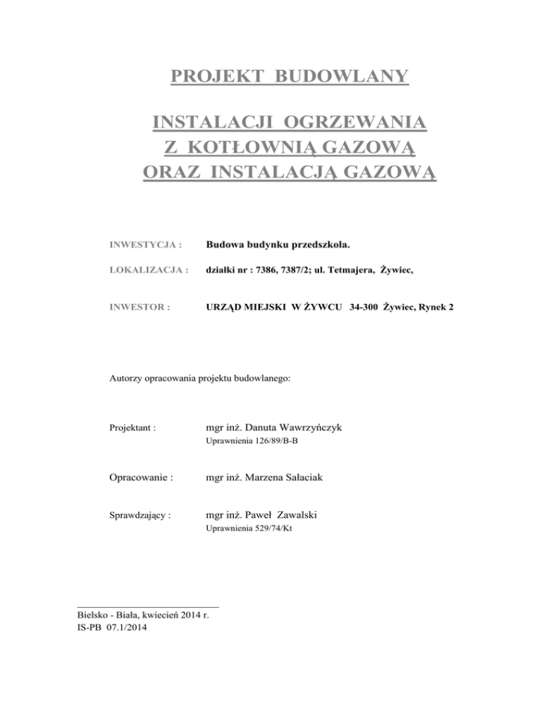 PROJEKT BUDOWLANY INSTALACJI OGRZEWANIA Z KOTŁOWNIĄ GAZOWĄ ORAZ INSTALACJĄ GAZOWĄ INWESTYCJA : Budowa budynku przedszkola. LOKALIZACJA : działki nr : 7386, 7387/2; ul. Tetmajera, Żywiec, INWESTOR : URZĄD MIEJSKI W ŻYWCU 34-300 Żywiec, Rynek 2 Autorzy opracowania projektu budowlanego: Projektant : mgr inż. Danuta Wawrzyńczyk Uprawnienia 126/89/B-B Opracowanie : mgr inż. Marzena Sałaciak Sprawdzający : mgr inż. Paweł Zawalski Uprawnienia 529/74/Kt __________________________ Bielsko - Biała, kwiecień 2014 r. IS-PB 07.1/2014 BUDYNEK PRZEDSZKOLA W ŻYWCU PRZY UL. TETMAJERA PROJEKT BUDOWLANY INSTALACJI SANITARNYCH – INSTALACJA OGRZEWANIA ___________________________________________________________________________________________________________________ ZAWARTOŚĆ OPRACOWANIA CZĘŚĆ OPISOWA 1. DANE OGÓLNE ..................................................................................................................................3 1.1. Temat i zakres opracowania ..........................................................................................................3 1.2. Podstawa opracowania ..................................................................................................................3 2. ZAŁOŻENIA PROJEKTOWE ............................................................................................................3 3. OBLICZENIA CIEPLNE ....................................................................................................................4 3.1. Temperatury ogrzewanych pomieszczeń ......................................................................................4 3.2. Charakterystyka przegród budowlanych .....................................................................................4 3.3. Bilans ciepła .................................................................................................................................4 3.3.1. Straty ciepła przez przegrody budowlane .............................................................................4 3.3.2. Zapotrzebowanie ciepła dla podgrzania powietrza wentylacyjnego ....................................9 3.3.3. Zapotrzebowanie ciepła dla podgrzania wody użytkowej....................................................9 3.3.4. Łączne zapotrzebowanie ciepła .............................................................................................10 4. INSTALACJE OGRZEWANIA ........................................................................................................10 4.1. Instalacja ogrzewania podłogowego ..........................................................................................10 4.2. Instalacja ogrzewania grzejnikowego ........................................................................................10 4.3. Instalacja zasilająca wężownice w zasobnikach c.w.u. ............................................................11 4.4. Instalacja czynnika grzewczego dla wentylacji.......................................................................11 4.5. Regulacja ilości ciepła...............................................................................................................12 4.6. Montaż instalacji ogrzewania ....................................................................................................12 4.7. Izolacja instalacji ogrzewania ...................................................................................................13 4.8. Odbiór instalacji ogrzewania .....................................................................................................13 5. INSTALACJA SOLARNA ................................................................................................................13 6. ŹRÓDŁO CIEPŁA – KOTŁOWNIA ................................................................................................14 6.1. Instalacja technologiczna kotłowni ...........................................................................................14 6.2. Zabezpieczenie instalacji przed wzrostem ciśnienia ...............................................................14 6.3. Odprowadzenie spalin ................................................................................................................15 6.4. Wymagania dla pomieszczenia kotłowni .................................................................................15 6.5. Montaż kotłowni ........................................................................................................................15 7. INSTALACJA GAZOWA .................................................................................................................16 7.1. Zapotrzebowanie gazu................................................................................................................16 7.2. Instalacja gazowa .......................................................................................................................17 7.3. System Detekcji Gazu ................................................................................................................17 8. CHARAKTERYSTYKA ENERGETYCZNA WRAZ Z ANALIZĄ ALTERNATYWNYCH ŹRÓDEŁ ..............................................................................................................................................18 9. UWAGI OGÓLNE .............................................................................................................................18 10. OŚWIADCZENIE PROJEKTANTA I SPRAWDZAJĄCEGO ......................................................19 ZAŁĄCZNIKI Załącznik nr 1 . Charakterystyka energetyczna wraz z analizą alternatywnych źródeł Kserokopie uprawnień projektowych oraz przynależności do Izby Projektanta i Sprawdzającego CZĘŚĆ RYSUNKOWA Rys. nr OG/01 Rys. nr OG/02 Rys. nr OG/03 Rys. nr OG/04 Rys. nr OG/05 Rys. nr OG/06 ____________________ IS-PB 07.1 /2014 Instalacja ogrzewania i gazowa. Rzut parteru. Instalacja ogrz
