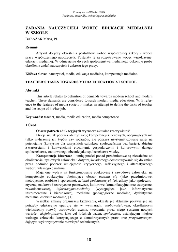 Trendy ve vzdělávání 2009 Technika, materiály, technologie a didaktika ZADANIA NAUCZYCIELI WOBEC EDUKACJI MEDIALNEJ W SZKOLE BAŁAŻAK Marta, PL Resumé Artykuł dotyczy określenia postulatów wobec współczesnej szkoły i wobec pracy współczesnego nauczyciela. Postulaty te są rozpatrywane wobec współczesnej edukacji medialnej. W odniesieniu do cech społeczeństwa medialnego dokonuje próby określenia zadań nauczyciela i zakresu jego pracy. Klíčova slova: nauczyciel, media, edukacja medialna, kompetencje medialne. TEACHER’S TASKS TOWARDS MEDIA EDUCATION AT SCHOOL Abstrakt This article relates to definition of demands towards modern school and modern teacher. These demands are considered towards modern media education. With reference to the features of media society it makes an attempt to define the tasks of teacher and the scope of his/her job. Key words: teacher, media, media education, media competence. 1 Ǘvod Obszar potrzeb edukacyjnych wyznacza aktualna rzeczywistość. Dzieje się tak poprzez identyfikację kompetencji kluczowych, obejmujących nie tylko wyliczenie ich typów czy rodzajów, ale poprzez usystematyzowane rangi na potencjalne (korzystne dla wszystkich członków społeczeństwa bez barier), zbieżne z wartościami i konwencjami etycznymi, gospodarczymi i kulturowymi danego społeczeństwa, traktowanego obecnie jako społeczeństwa wiedzy. Kompetencje kluczowe – umiejętności ponad przedmiotowe są niezależne od okoliczności życiowych człowieka i dotyczą świadomego dostosowywanie się do zmian przez podmiot poprzez umiejętność krytycznego, refleksyjnego i alternatywnego wyboru własnego działania. Mają one wpływ na funkcjonowanie edukacyjne i zawodowe człowieka, na kompetencje edukacyjne obejmujące obszar uczenia się (jako przedmiotowe, metodyczne, osobiste i społeczne), działań podstawowych (określany jako społecznoetyczne, naukowe i teoretyczno-poznawcze, kulturowe, komunikacyjne oraz estetyczne, zawodoznawcze), informacyjno-medialny (występujące jako informatyczne instrumentalne i kierunkowe), medialne (pedagogiczne medialne, dydaktyczne medialne, osobiste medialne) [1]. Wszelkie zmiany organizacji kształcenia, określające aktualnie pojawiające się potrzeby edukacyjne upatruje się w wymiarach: osobowościowym, określającym wielostronny rozwój osobowości ucznia, tworzenia przez niego systemu nowych wartości; aksjologicznym, jako cel ludzkich dążeń; społecznym, ustalającym miejsce wolnego człowieka korzystającego z demokratycznych praw oraz pragmatycznym, dającym wykorzystywanie rozwiązań technicznych. 18 Trendy ve vzdělávání 2009 Technika, materiály, technologie a didaktika Kompetencje kluczowe uzupełniane są przez kompetencje generyczne, oderwane od konkretnych przedmiotów, jak: komunikacja, rozwiązywanie problemów, rozumowanie, zdolności przywódcze, kreatywność, motywacja, praca zespołowa, umiejętność uczenia się. 2 Postulaty wobec pracy współczesnego nauczyciela Nowoczesna szkoła nie musi oznaczać idealnego, modelowego wyposażenia placówki, gotowego do podjęcia pracy w najnowszych technologiach i technikach. Jej cechy wywodzą się raczej ze sposobów podejmowanej pracy pedagogicznej. Nowoczesność szkoły to nowoczesne metody pracy. „Nowi uczniowie” potrzebują kształcenia przez „nowych nauczycieli” w „nowych ośrodkach socjalizacyjnych” o wysokim potencjale innowacyjnym, które przygotowywać ich będą do funkcjonowania w różnego typu organizacjach. „Nowi nauczyciele” również muszą wykazywać się szeregiem kompetencji, np.: znajomości języków obcych, sprzętu komputerowego, szeroko pojętej kultury medialnej, zagadnień ze świata nowych technologii i telekomunikacji. Muszą ciągle aktualizować swoją wiedzę i umiejętności praktyczne [2]. Obrazem takiej szkoły jest podjęcie przez nauczyciela pracy polegającej na dostarczaniu bieżącej informacji, które posłużą pracy pedagogicznej, pomaganie dzieciom w nauce a nie samo przekazywanie im gotowych wiadomości. W obliczu nowych wyzwań wobec pracy nauczyciela zmianie uległy funkcje szkoły z nastawionych na kształtowanie sprawności instrumentalnych, elementarnych, specjalistycznych, intelektualnych, oferowanie świata wartości i dopuszczalnej ideologii wyznaczającej życie społeczne, przygotowanie do życia społecznego, według przyjętego lub narzuconego wzorca. Nowe funkcje obejmują pomaganie uczniom w rozumnym kierowaniu własnym rozwojem i przy dokonywaniu wyborów życiowych, dawanie różnych propozycje wyboru wartościowego modelu życia, samorealizacji, samokształcenia, świadomego życia w środowisku lokalnym [3]. Przemiany szkoły nakładają na nią postulat innowacyjności. Może on dotyczyć zmian funkcji, jakie pełni wobec państwa, zmian operacyjnych zadań organizacji wyznających jako zmiany treści oraz metod nauczania oraz zmian wewnętrznej struktury organizacji. Europejskie dokumenty oświatowe stawiają nauczyciela w roli promotora wszelkich zmian, orędownika nowych treści i trendów, jakie otaczają i docierają do uczestników procesu kształcenia. Sam system oświaty musi być oparty o nowe wyobrażenia przyszłości, o przewidywania sytuacji, jaka nastąpi za kilkadziesiąt lat. Jest to wynikiem jego obowiązków pedagogicznych dotyczących przygotowania uczniów do dorosłego życia. Nastawienie nauczyciela do pracy polegającej na realizowaniu i wdrażaniu idei kompetencji kluczowych polega nie tylko na wyposażaniu uczniów w wiedzę czy umiejętności samokształceniowe, ale na przygotowaniu ich do samodzielnego kierowania rozwojem swojej osobowości, do podejmowania wartościowych celów i żądań życiowych. W takim ustawieniu pojawia się wizja nauczyciela oczekiwanego w szkole, gotowego (mogącego) podjąć współczesne wyzwania [4]. Współczesny nauczyciel stoi przed szczególnym zadaniem, odmiennym od dotychczas wyznaczanych, a związan