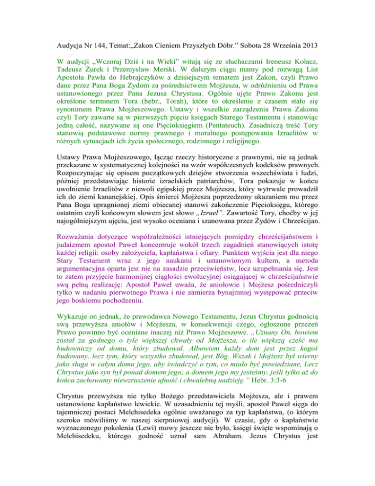 Audycja Nr 144, Temat:„Zakon Cieniem Przyszłych Dóbr.” Sobota 28 Września 2013 W audycji „Wczoraj Dziś i na Wieki” witają się ze słuchaczami Ireneusz Kołacz, Tadeusz Żurek i Przemysław Merski. W dalszym ciągu mamy pod rozwagą List Apostoła Pawła do Hebrajczyków a dzisiejszym tematem jest Zakon, czyli Prawo dane przez Pana Boga Żydom za pośrednictwem Mojżesza, w odróżnieniu od Prawa ustanowionego przez Pana Jezusa Chrystusa. Ogólnie ujęte Prawo Zakonu jest określone terminem Tora (hebr., Torah), które to określenie z czasem stało się synonimem Prawa Mojżeszowego. Ustawy i wszelkie zarządzenia Prawa Zakonu czyli Tory zawarte są w pierwszych pięciu księgach Starego Testamentu i stanowiąc jedną całość, nazywane są one Pięcioksięgiem (Pentateuch). Zasadniczą treść Tory stanowią podstawowe normy prawnego i moralnego postępowania Izraelitów w różnych sytuacjach ich życia społecznego, rodzinnego i religijnego. Ustawy Prawa Mojżeszowego, łącząc rzeczy historyczne z prawnymi, nie są jednak przekazane w systematycznej kolejności na wzór współczesnych kodeksów prawnych. Rozpoczynając się opisem początkowych dziejów stworzenia wszechświata i ludzi, później przedstawiając historie izraelskich patriarchów, Tora pokazuje w końcu uwolnienie Izraelitów z niewoli egipskiej przez Mojżesza, który wytrwale prowadził ich do ziemi kananejskiej. Opis śmierci Mojżesza poprzedzony ukazaniem mu przez Pana Boga upragnionej ziemi obiecanej stanowi zakończenie Pięcioksięgu, którego ostatnim czyli końcowym słowem jest słowo „Izrael”. Zawartość Tory, choćby w jej najogólniejszym ujęciu, jest wysoko oceniana i szanowana przez Żydów i Chrześcijan. Rozważania dotyczące współzależności istniejących pomiędzy chrześcijaństwem i judaizmem apostoł Paweł koncentruje wokół trzech zagadnień stanowiących istotę każdej religii: osoby założyciela, kapłaństwa i ofiary. Punktem wyjścia jest dla niego Stary Testament wraz z jego naukami i ustanowionym kultem, a metoda argumentacyjna oparta jest nie na zasadzie przeciwieństw, lecz uzupełniania się. Jest to zatem przyjęcie harmonijnej ciągłości ewolucyjnej osiągającej w chrześcijaństwie swą pełną realizację: Apostoł Paweł uważa, że aniołowie i Mojżesz pośredniczyli tylko w nadaniu pierwotnego Prawa i nie zamierza bynajmniej występować przeciw jego boskiemu pochodzeniu. Wykazuje on jednak, że prawodawca Nowego Testamentu, Jezus Chrystus godnością swą przewyższa aniołów i Mojżesza, w konsekwencji czego, ogłoszone przezeń Prawo powinno być oceniane inaczej niż Prawo Mojżeszowe. „Uznany On, bowiem został za godnego o tyle większej chwały od Mojżesza, o ile większą cześć ma budowniczy od domu, który zbudował. Albowiem każdy dom jest przez kogoś budowany, lecz tym, który wszystko zbudował, jest Bóg. Wszak i Mojżesz był wierny jako sługa w całym domu jego, aby świadczyć o tym, co miało być powiedziane, Lecz Chrystus jako syn był ponad domem jego; a domem jego my jesteśmy, jeśli tylko aż do końca zachowamy niewzruszenie ufność i chwalebną nadzieję.” Hebr. 3:3-6 Chrystus przewyższa nie tylko Bożego przedstawiciela Mojżesza, ale i prawem ustanowione kapłaństwo lewickie. W uzasadnieniu tej myśli, apostoł Paweł sięga do tajemniczej postaci Melchisedeka ogólnie uważanego za typ kapłaństwa, (o którym szeroko mówiliśmy w naszej sierpniowej audycji). W czasie, gdy o kapłaństwie wyznaczonego pokolenia (Lewi) mowy jeszcze nie było, księgi święte wspominają o Melchisedeku, którego godność uznał sam Abraham. Jezus Chrystus jest Arcykapłanem z tej nie przewidzianej prawem linii rodowej. Na wielu miejscach dają temu wyraz natchnieni Autorowie. Czerpiąc obficie z tekstów ksiąg Starego Testamentu, apostoł Paweł wywodzi obszernie genezę kapłaństwa Jezusa Chrystusa, Twórcy Nowego Przymierza, aby zakończyć podniosłym stwierdzeniem odnośnie Jego wyższości nad kapłaństwem lewickim. „Takiego to przystało nam mieć arcykapłana, świętego, niewinnego, nieskalanego, odłączonego od grzeszników i wywyższonego nad niebiosa; Który nie musi codziennie, jak inni arcykapłani, składać ofiar najpierw za własne grzechy, następnie za grzechy ludu; uczynił to, bowiem raz na zawsze, gdy ofiarował samego siebie. Albowiem zakon ustanawia arcykapłanami ludzi, którzy podlegają słabościom, lecz słowo przysięgi, która przyszła później niż zakon, ustanowiło syna doskonałego na wieki.” Hebr. 7:26-28 Tej arcykapłańskiej godności odpowiada i złożona ofiara. Tu już nie chodzi o urządzenia zewnętrzne: przybytek, święte naczynia, krew ofiar obmywającą skalanych, ale o najdostojniejszą ofiarę złożoną raz po wszystkie czasy: „Lecz Chrystus, który się zjawił jako arcykapłan dóbr przyszłych, wszedł przez większy i doskonalszy przybytek, nie ręką zbudowany, to jest nie z tego stworzonego świata pochodzący, Wszedł raz na zawsze do świątyni nie z krwią kozłów i cielców, ale z własną krwią swoją, dokonawszy wiecznego odkupienia. Bo jeśli krew kozłów i wołów oraz popiół z jałowicy przez pokropienie uświęcają skalanych i przywracają cielesną czystość, O ileż bardziej krew Chrystusa, który przez Ducha wiecznego ofiarował samego siebie bez skazy Bogu, oczyści sumienie nasze od martwych uczynków, abyśmy mogli służyć Bogu żywemu. I dlatego jest On pośrednikiem nowego przymierza, ażby gdy poniesiona została śmierć dla odkupienia przestępstw popełnionych za pierwszego przymierza, ci, którzy są powołani, otrzymali obiecane dziedzictwo wieczne.” Hebr. 9:11-15 Tekst powyższy przepełniony wspomnieniami zwyczajów kultowych w jerozolimskiej świątyni daje apostołowi Pawłowi okazję do sformułowania stanowiska, co do ich wartości. Czyni to w pełnym treści zdaniu. „Albowiem zakon, zawierając w sobie tylko c