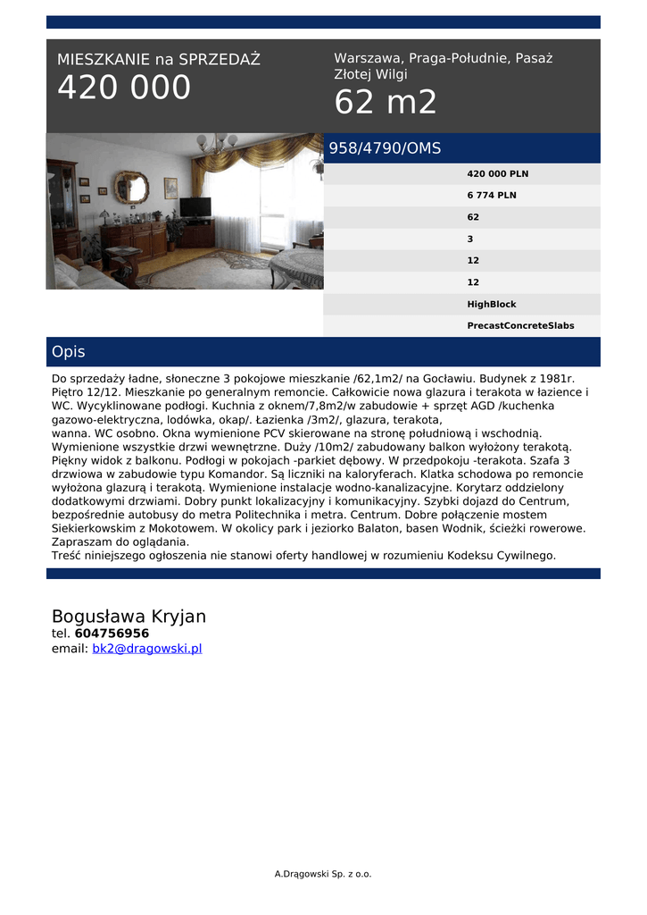 MIESZKANIE na SPRZEDAŻ 420 000 Warszawa, Praga-Południe, Pasaż Złotej Wilgi 62 m2 958/4790/OMS 420 000 PLN 6 774 PLN 62 3 12 12 HighBlock PrecastConcreteSlabs Opis Do sprzedaży ładne, słoneczne 3 pokojowe mieszkanie /62,1m2/ na Gocławiu. Budynek z 1981r. Piętro 12/12. Mieszkanie po generalnym remoncie. Całkowicie nowa glazura i terakota w łazience i WC. Wycyklinowane podłogi. Kuchnia z oknem/7,8m2/w zabudowie + sprzęt AGD /kuchenka gazowo-elektryczna, lodówka, okap/. Łazienka /3m2/, glazura, terakota, wanna. WC osobno. Okna wymienione PCV skierowane na stronę południową i wschodnią. Wymienione wszystkie drzwi wewnętrzne. Duży /10m2/ zabudowany balkon wyłożony terakotą. Piękny widok z balkonu. Podłogi w pokojach -parkiet dębowy. W przedpokoju -terakota. Szafa 3 drzwiowa w zabudowie typu Komandor. Są liczniki na kaloryferach. Klatka schodowa po remoncie wyłożona glazurą i terakotą. Wymienione instalacje wodno-kanalizacyjne. Korytarz oddzielony dodatkowymi drzwiami. Dobry punkt lokalizacyjny i komunikacyjny. Szybki dojazd do Centrum, bezpośrednie autobusy do metra Politechnika i metra. Centrum. Dobre połączenie mostem Siekierkowskim z Mokotowem. W okolicy park i jeziorko Balaton, basen Wodnik, ścieżki rowerowe. Zapraszam do oglądania. Treść niniejszego ogłoszenia nie stanowi oferty handlowej w rozumieniu Kodeksu Cywilnego. Bogusława Kryjan tel. 604756956 email: [email protected] A.Drągowski Sp. z o.o. Powered by TCPDF (www.tcpdf.org)