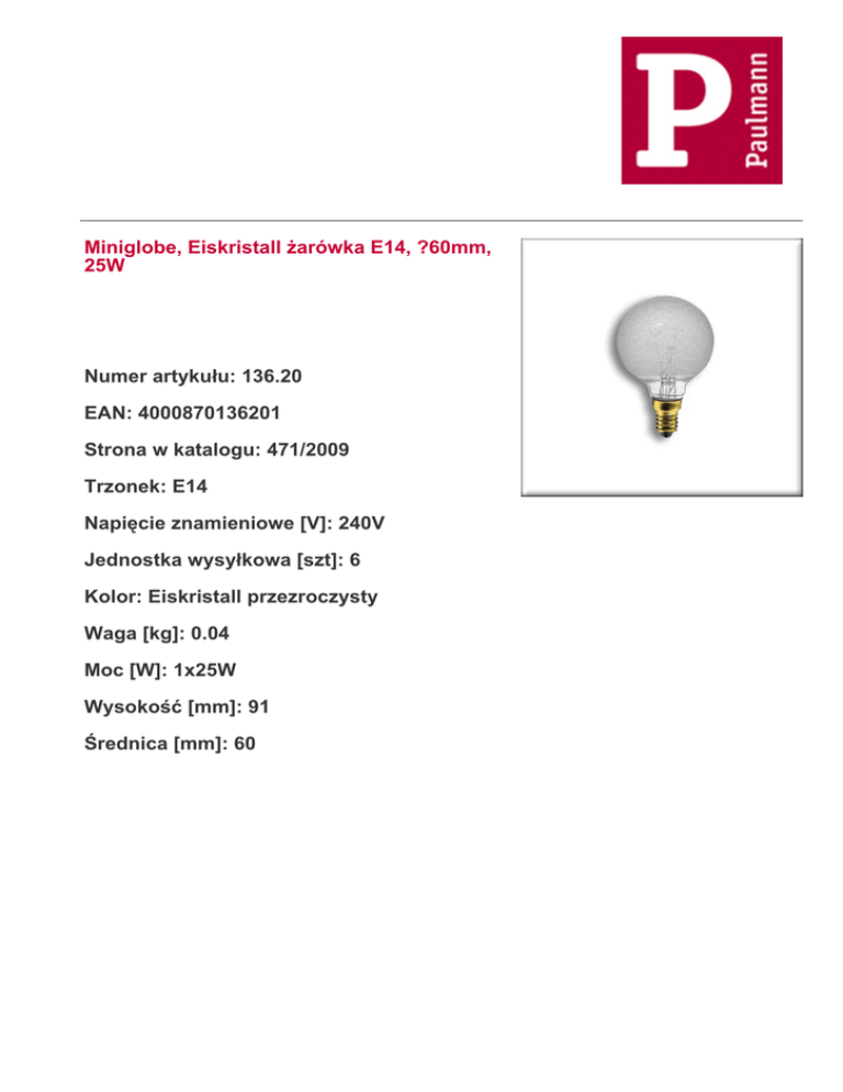 Miniglobe, Eiskristall żarówka E14, ?60mm, 25W Numer artykułu: 136.20 EAN: 4000870136201 Strona w katalogu: 471/2009 Trzonek: E14 Napięcie znamieniowe [V]: 240V Jednostka wysyłkowa [szt]: 6 Kolor: Eiskristall przezroczysty Waga [kg]: 0.04 Moc [W]: 1x25W Wysokość [mm]: 91 Średnica [mm]: 60