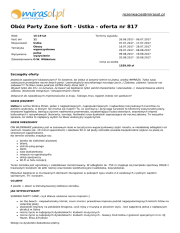 [email protected] Obóz Party Zone Soft - Ustka - oferta nr 817 Wiek 15-19 lat Ilość dni 11 26.06.2017 - 06.07.2017 Miejscowość Ustka 07.07.2017 - 17.07.2017 Tematyka Obozy wypoczynkowe 18.07.2017 - 28.07.2017 Wyżywienie pełne wyżywienie 09.08.2017 - 19.08.2017 Zakwaterowanie O.W. Włókniarz Terminy wyjazdu: 29.07.2017 - 08.08.2017 20.08.2017 - 30.08.2017 Cena za osobę 1539.00 zł Szczegóły oferty Jesteście zapalonymi klubowiczami? To świetnie, bo Ustka w sezonie letnim to jedna, wielka IMPREZA. Tylko tutaj zobaczycie prawdziwe nocne beach party i zasmakujecie wyczekanego nocnego życia ;) Zabawa, zabawa i jeszcze raz zabawa!!!! To Was czeka podczas USTKA Party Zone Soft ;) Wyjazd tylko dla 15+ co oznacza, że bawić się będziecie tylko wśród rówieśników i starszaków :). Gwarantowana ekstra zabawa, doskonała integracja i niezapomniane chwile. Dołączcie do największych imprezowiczów w kraju. Takiego mixu nigdzie indziej nie spotkacie! GDZIE JEDZIEMY Ustka to Letnia Stolica Polski, jeden z najpiękniejszych, najpopularniejszych i najbardziej rozrywkowych kurortów na polskim wybrzeżu, w którym nie można się nudzić! To, co zachwyca i przyciąga turystów to kilometry piaszczystej plaży, strzeżone kąpieliska, tętniąca życiem nadmorska promenada, oszałamiająca liczba otwartych, sezonowych imprez kulturalnych i rozrywkowych (koncerty, turnieje, festiwale) oraz dyskoteki zapraszające do nocnej zabawy. To wszystko sprawia, że Ustka to najlepszy wybór na Wasz wakacyjny wypoczynek. GDZIE MIESZKAMY OW WŁÓKNIARZ położony jest w sosnowym lesie w turystyczno-wypoczynkowej części miasta, w niedalekiej odległości od centrum miasta (ok. 10 minut spacerkiem) i zaledwie 50 m od plaży (ośrodek posiada bezpośrednie zejście na plażę ze strzeżonym kąpieliskiem). Na terenie ośrodka znajduje się: boisko do siatkówki plażowej bilard, stół do ping-ponga darts sala dyskotekowa miejsce na ognisko/grilla sklep spożywczy Wi-Fi w holu recepcji. Teren ośrodka jest ogrodzony i całodobowo monitorowany. W odległości ok. 750 m znajduje się kompleks sportowy ORLIK z trawiastym boiskiem do piłki nożnej oraz boisko wielofunkcyjne (siatkówka, koszykówka). Mieszkać będziecie w murowanych domkach (bungalow) w pokojach typu studio 2-4 osobowych z pełnym węzłem sanitarnym, TV i tarasem. CO JEMY 3 posiłki + deser w klimatyzowanej stołówce ośrodka. JAK WYPOCZYWAMY SUMMER PARTY CAMP, czyli Wasze ulubione nocne imprezki ;) on the beach - niepowtarzalny klimat, szum morza i prawdziwa impreza pośród najpopularniejszych letnich hitów na usteckiej plaży dyskoteki-imprezy na pokładzie Dragona, czyli rejsy z muzyką w pirackim stylu - bez wątpienia jedna z najlepszych atrakcji w Ustce nocne życie w najlepszych dyskotekach i klubach muzycznych nocne życie w najlepszych dyskotekach i klubach muzycznych - Galaxy Club Ustka z gościem specjalnym m.in. DJ Hazer, Eliza &Trybson Wstęp na dyskoteki dodatkowo płatny. + LETNI CHILLOUT Poza zajęciami tematycznymi też można fajnie spędzić czas! Czeka na Was zbiór najciekawszych aktywności z programu „Wakacje na luzie”. Ilość zajęć dla poszczególnych programów realizowana będzie w zależności od czasu i możliwości. RELAX NA LUZAKU beach and water fun: plażowanie i kąpiele w morzu poznawanie uroków najbardziej znanego kurortu wybrzeża: wizyta w porcie, wejście na molo, którego strzeże „Ustecka Syrenka”, spacer po Starym Mieście i nadmorską promenadą o różnej porze dnia i nocy Ustka Film Festival: wspólne oglądanie najlepszych polskich i zagranicznych hitów na dużym ekranie party grill z kiełbaskami plener party: udział w letnich imprezach plenerowych (koncertach, zawodach, pokazach), np.: Namioty sferyczne na plaży: nowa jakość plażowania w wyjątkowym miejscu na plaży w Ustce z wyjątkowymi ludźmi. Gra w siatkówkę, skimboarding, jedyna taka bitwa na śnieżki na plaży!, letnia muzyka z głośników czy plażowanie w cieniu namiotów. Dwa imponujące namioty, szum morza i ognistoczerwony zachód słońca - po prostu musicie tam być! Lech Fire Festiwal: coroczna najbardziej kolorowa i wystrzałowa impreza w Polsce, która odbywa się w okolicach pierwszego weekendu lipca. Najlepsi specjaliści z firm pirotechnicznych zaprezentują profesjonalny spektakl światła i dźwięku. Pokazom sztucznych ogni towarzyszą koncerty znanych gwiazd. Finał Mistrzostw Polski w Beach Soccera : od kilku lat na przełomie lipca i sierpnia odbywają się pokazy plażowej piłki nożnej z udziałem gwiazd sportu i celebrytów. „Nbar on the Beach Ustka” : impreza taneczna dla młodzieży z udziałem czołowych, europejskich DJ-ów. Impreza odbywa się na plaży w połowie lipca. Syrelanlia: oficjalne obchody Święta Miasta (około 15 sierpnia), któremu towarzyszą liczne koncerty nie tylko w morskim klimacie. Mistrzostwa Polski w wypłukiwaniu bursztynu i wybory „Bursztynowej Miss”: cykliczna impreza odbywająca się w połowie sierpnia I KILKA INNYCH ROZRYWEK gokartem przez Ustkę: miła odmiana od codziennych spacerów, śmigaj gokartami rowerowymi na specjalnie wydzielonych ścieżkach rowerowo-gokartowcyh (ok 10 zł/os) Ustka Word Cup 2016: karciane lub piłkarskie rozgrywki drużynowe BUT Kadra vs Obozowicze. To Wy zdecydujecie w czym rywalizować będziecie nocna gra terenowa z dreszczykiem: wcielicie się w postać detektywa i za pomocą wskazówek rozwiążecie zagadkę tajemniczego zniknięcia Kierownika obozu projekt zgrabna sylwetka: aqua aerobik w morzu (tylko dla chętnych), freisbee, crazy ping-pong, gra w bilard, siatkówka, ringo karaoke na profesjonalnym sprzęcie WYCIECZKA W CENIE Piesza wycieczka do „Bunkrów Bluchera”, tajemniczej Usteckiej Twierdzy z czasów II wojny światowej położonej tuż przy zachodnim falochronie portowym, zobaczycie, m.in.: podziemna galeria z ciekawą ekspozycją prezentującą mundury, broń, wyposażenie bunkrów (telefo