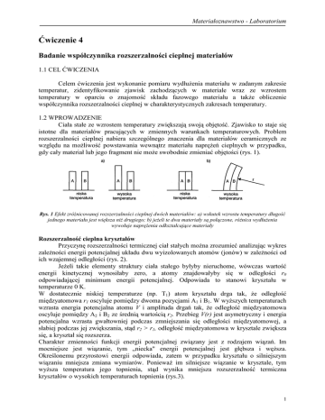 Materiałoznawstwo - Laboratorium Ćwiczenie 4 Badanie współczynnika rozszerzalności cieplnej materiałów 1.1 CEL ĆWICZENIA Celem ćwiczenia jest wykonanie pomiaru wydłuŜenia materiału w zadanym zakresie temperatur, zidentyfikowanie zjawisk zachodzących w materiale wraz ze wzrostem temperatury w oparciu o znajomość składu fazowego materiału a takŜe obliczenie współczynnika rozszerzalności cieplnej w charakterystycznych zakresach temperatury. 1.2 WPROWADZENIE Ciała stałe ze wzrostem temperatury zwiększają swoją objętość. Zjawisko to staje się istotne dla materiałów pracujących w zmiennych warunkach temperaturowych. Problem rozszerzalności cieplnej nabiera szczególnego znaczenia dla materiałów ceramicznych ze względu na moŜliwość powstawania wewnątrz materiału napręŜeń cieplnych w przypadku, gdy cały materiał lub jego fragment nie moŜe swobodnie zmieniać objętości (rys. 1). Rys. 1 Efekt zróŜnicowanej rozszerzalności cieplnej dwóch materiałów: a) wskutek wzrostu temperatury długość jednego materiału jest większa niŜ drugiego; b) jeŜeli te dwa materiały są połączone, róŜnica wydłuŜenia wywołuje napręŜenia odkształcające materiały Rozszerzalność cieplna kryształów Przyczynę rozszerzalności termicznej ciał stałych moŜna zrozumieć analizując wykres zaleŜności energii potencjalnej układu dwu wyizolowanych atomów (jonów) w zaleŜności od ich wzajemnej odległości (rys. 2). JeŜeli takie elementy struktury ciała stałego byłyby nieruchome, wówczas wartość energii kinetycznej wynosiłaby zero, a atomy znajdowałyby się w odległości r0 odpowiadającej minimum energii potencjalnej. Odpowiada to stanowi kryształu w temperaturze 0 K. W dostatecznie niskiej temperaturze (np. T1) atom kryształu drga tak, Ŝe odległość międzyatomowa r1 oscyluje pomiędzy dwoma pozycjami A1 i B1. W wyŜszych temperaturach wzrasta energia potencjalna atomu V i amplituda drgań tak, Ŝe odległość międzyatomowa oscyluje pomiędzy A2 i B2 ze średnią wartością r2. Przebieg V(r) jest asymetryczny i energia potencjalna wzrasta gwałtowniej podczas zmniejszania się odległości międzyatomowej, a słabiej podczas jej zwiększania, stąd r2 > r1, odległość międzyatomowa w krysztale zwiększa się, a kryształ się rozszerza. Charakter zmienności funkcji energii potencjalnej związany jest z rodzajem wiązań. Im mocniejsze jest wiązanie, tym „niecka" energii potencjalnej jest głębsza i węŜsza. Określonemu przyrostowi energii odpowiada, zatem w przypadku kryształu o silniejszym wiązaniu mniejsza zmiana wymiarów. PoniewaŜ im silniejsze wiązanie w krysztale, tym wyŜsza temperatura jego topnienia, stąd wynika mniejsza rozszerzalność termiczna kryształów o wysokich temperaturach topnienia (rys.3). 1 Materiałoznawstwo - Laboratorium Rys. 2. Energia potencjalna w funkcji odległości pomiędzy dwoma atomami Właściwość rozszerzania się ciał stałych izotropowych pod wpływem temperatury opisuje się przez podanie liniowego współczynnika rozszerzalności cieplnej α zdefiniowanego jako stosunek wydłuŜenia względnego ∆l/lo do przyrostu temperatury ∆T wywołującego przyrost Jedynie kryształy naleŜące do układu regularnego rozszerzają się jednakowo we wszystkich kierunkach (izotropia rozszerzalności). JeŜeli z kryształu regularnego wytniemy kulę, zachowa ona swój kształt kulisty po ogrzaniu lub ochłodzeniu. Rys.3. ZaleŜność pomiędzy współczynnikiem rozszerzalności liniowej α w 25°C i temperaturą topnienia metali Rozszerzalności cieplnej kryształów o niŜszej symetrii niŜ dla układu regularnego nie moŜna ująć skalarnym równaniem (anizotropia rozszerzalności), lecz na miejsce ε = α ·∆T naleŜy wprowadzić tensor εik, a współczynnik α zastąpić wielkością α ik spełniającą równanie: [εik] = [αik] · ∆T (3) 2 Materiałoznawstwo - Laboratorium gdzie: i, k = l, 2, 3 (i - kierunek w układzie współrzędnych prostokątnych; k - kierunek wyróŜnionej osi krystalograficznej). Równanie to wyraŜa liniową zaleŜność pomiędzy tensorem odkształceń i skalarem, jakim jest temperatura. Współczynnik proporcjonalności jest w tym przypadku tensorem [αik] określającym deformację kryształu przy wzroście temperatury o 1°C. W układach krystalograficznych, w których jedna z osi jest wyróŜniona, ale dwie prostopadłe do niej są względem siebie symetrycznie równowaŜne (układ tetragonalny, trygonalny i heksagonalny), powierzchnia kuli po ogrzaniu będzie elipsoidą obrotową (rys.4a). W kryształach, które nie mają dwu osi krystalograficznie równowaŜnych (układ rombowy, jednoskośny, trójskośny), kula po ogrzaniu zamieni się w elipsoidę trójosiową (rys.4b). Rys. 4. Powierzchnia kuli wydętej z kryształu po ogrzaniu: a) elipsoida obrotowa; b) elipsoida trójosiową Współczynniki rozszerzalności liniowej wzdłuŜ kierunków osi krystalograficznych nazywamy głównymi współczynnikami i oznaczamy jako α1, α 2, α 3. W przypadku kryształów o niŜszej symetrii moŜe zajść przypadek, Ŝe współczynniki dla róŜnych kierunków krystalograficznych róŜnią się znakiem, co oznacza, Ŝe wydłuŜeniu jednej osi towarzyszy skrócenie drugiej (tab. 1). W przypadku polikryształów, gdzie wymiary próbki materiału we wszystkich kierunkach są znacznie większe od rozmiarów faz tworzących materiał, a kierunki faz tworzących materiał rozmieszczone są w materiale przypadkowo, materiał moŜe być traktowany jako izotropowy i opisywany jednym współczynnikiem rozszerzalności liniowej. Dla materiałów polikrystalicznych anizotropowych naleŜy określić wielkości współczynników rozszerzalności w kierunkach zorientowanych w stosunku do geometrii wyrobu. Tabela 1. Liniowa rozszerzalność kryształów w zaleŜności od kierunku krystalograficznego Kryształ Układ Temperatura [°C] Aragonit CaCO3 rombowy 20÷40 α ·