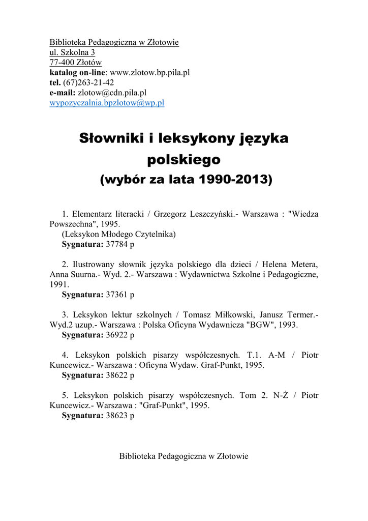 Biblioteka Pedagogiczna w Złotowie ul. Szkolna 3 77-400 Złotów katalog on-line: www.zlotow.bp.pila.pl tel. (67)263-21-42 e-mail: [email protected] [email protected] Słowniki i leksykony języka polskiego (wybór za lata 1990-2013) 1. Elementarz literacki / Grzegorz Leszczyński.- Warszawa : "Wiedza Powszechna", 1995. (Leksykon Młodego Czytelnika) Sygnatura: 37784 p 2. Ilustrowany słownik języka polskiego dla dzieci / Helena Metera, Anna Suurna.- Wyd. 2.- Warszawa : Wydawnictwa Szkolne i Pedagogiczne, 1991. Sygnatura: 37361 p 3. Leksykon lektur szkolnych / Tomasz Miłkowski, Janusz Termer.Wyd.2 uzup.- Warszawa : Polska Oficyna Wydawnicza "BGW", 1993. Sygnatura: 36922 p 4. Leksykon polskich pisarzy współczesnych. T.1. A-M / Piotr Kuncewicz.- Warszawa : Oficyna Wydaw. Graf-Punkt, 1995. Sygnatura: 38622 p 5. Leksykon polskich pisarzy współczesnych. Tom 2. N-Ż / Piotr Kuncewicz.- Warszawa : "Graf-Punkt", 1995. Sygnatura: 38623 p Biblioteka Pedagogiczna w Złotowie 6. Literatura i nauka o języku / red. Andrzej Zdzisław Makowiecki ; aut. Włodzimierz Appel.- Warszawa : Wydawnictwa Szkolne i Pedagogiczne, 1995. (Encyklopedia Szkolna) Sygnatura: 37779 p 7. Mały słownik gwary krajeńskiej / Jowita Kęcińska.- Złotów-Wielki Buczek : Oddział Zrzeszenia Kaszubsko-Pomorskiego, 2004. Sygnatura: 40876 pr, 40877 pr 8. Myślę więc jestem : aforyzmy, maksymy, sentencje / aut. wyb., opr. Czesława Glensk, Joachim Glensk.- Wyd.2.- Opole : Antyk, 1991. Sygnatura: 36631 p 9. Ortograficzny słownik języka polskiego / red. Andrzej Markowski ; Maria Derkacz-Strybel, Dorota Adamiec, Aleksandra Grzyb, Ewa Rudnicka.- Warszawa : "Wilga", 2000. Sygnatura: 39427 p 10. Praktyczny słownik współczesnej polszczyzny. T. 1-50 / red. Halina Zgółkowa - Poznań : Wydawnictwo "Kurpisz", 1994-2003. 11. Praktyczny słownik wyrazów bliskoznacznych / Witold Paweł Cienkowski.- Warszawa : "BGW", 1993. Sygnatura: 36829 p 12. Przysłowia są... na wszystko : słownik / wybór i oprac. Dobrosława Świerczyńska.- Wyd. 2 zm.- Warszawa : Wydawnictwo Naukowe PWN, 2009. Sygnatura: 44001 p 13. Słowniczek gwar Poznania i Wielkopolski : 1111 wyrazów i połączeń wyrazowych / Anna Piotrowicz, Małgorzata WitaszekSamborska.- Poznań : Fundacja Patria, 2009. Sygnatura: 43630 p 14. Słownik antonimów i homonimów / Jerzy Syjud.- Wyd. 2.- Katowice : Videograf II, 2008. Sygnatura: 44000 p Biblioteka Pedagogiczna w Złotowie 15. Słownik eponimów czyli wyrazów odimiennych / Władysław Kopaliński.- Wyd.2.- Warszawa : Wydawnictwo Naukowe PWN, 2004. (Seria "Z Krukiem") Sygnatura: 41201 p 16. Słownik etymologiczny języka polskiego / Wiesław Boryś.- Kraków : Wydaw. Literackie, 2008. Sygnatura: 43323 p 17. Słownik gwary młodzieżowej / Magdalena Dziurda, Piotr Choroba.Toruń: Literat, [2013]. Sygnatura: 45163 18. Słownik gwary młodzieżowej / oprac. Anna Jendrzejek, Justyna Pastwa.- Toruń : Wydawnictwo Literat, 2006. Sygnatura: 44661 p 19. Słownik nowych gatunków i zjawisk literackich / Paulina PotrykusWoźniak.- Warszawa ; Bielsko-Biała : Wydaw. Szkolne PWN : ParkEdukacja, 2010. Sygnatura: 43543 p 20. Słownik ortograficzny języka polskiego wraz z zasadami pisowni i interpunkcji / red. Mieczysław Szymczak.- Wyd. 17.- Warszawa, 1994. Sygnatura: 37493 p 21. Słownik ortograficzny współczesnej polszczyzny : z zasadami pisowni i interpunkcji : zawiera najnowsze orzeczenia KKJKJ PAN / Piotr Zbróg.- Kielce : MAC Edukacja, 2002. Sygnatura: 40657 p 22. Słownik paronimów czyli wyrazów mylonych / Małgorzata Kita, Edward Polański ; red. Radosław Pawelec.- Wyd. 2.- Warszawa : Wydawnictwo Naukowe PWN, 2008. Sygnatura: 44426 p 23. Słownik pisarzy i lektur : dla szkół podstawowych / Tomasz Januszewski.- Warszawa : "Delta W-Z", [1994]. Sygnatura: 37603 p Biblioteka Pedagogiczna w Złotowie 24. Słownik polskich przekleństw i wulgaryzmów / Maciej Grochowski.Wyd. 2, 2 dodruk.- Warszawa : Wydawnictwo Naukowe PWN SA, 2003. Sygnatura: 41962 p 25. Słownik poprawnej polszczyzny PWN / oprac. Lidia Drabik, Elżbieta Sobol.- Warszawa : Wydawnictwo Naukowe PWN, 2004. Sygnatura: 41407 p 26. Słownik przysłów : przysłownik / Katarzyna Kłosińska.- Poznań : Publicat, 2011. Sygnatura: 44293 p 27. Słownik przysłów czyli przysłownik : pochodzenie znaczenie zastosowanie / Katarzyna Kłosińska.- Warszawa : "Świat Książki", 2004. Sygnatura: 41431 p 28. Słownik wyrazów kłopotliwych / Mirosław Bańko, Maria Krajewska.- Warszawa : Wydaw. Naukowe PWN, 1994. (Słowniki Języka Polskiego) Sygnatura: 40124 p 29. Słownik wyrazów obcych i zwrotów obcojęzycznych / Władysław Kopaliński.- Wyd. 12.- Warszawa : "Wiedza Powszechna", 1994. Sygnatura: 37621 p 30. 1. Słownik wyrazów obcych i zwrotów obcojęzycznych / Władysław Kopaliński.- Wyd. 27.- Warszawa : Muza SA, 2001. Sygnatura: 39886 p 31. Słownik wyrazów obcych PWN.- Wyd. 27.- Warszawa : Państwowe Wydawnictwo Naukowe, 1993. Sygnatura: 37492 p 32. Słownik wyrazów obcych PWN. - Wyd. 26 popr. i uzup.- Warszawa : Państwowe Wydawnictwo Naukowe, 1991. Sygnatura: 36695 p 33. Szkolny słownik motywów literackich / Barbara Drabarek, Jacek Falkowski, Izabella Rowińska.- Wyd. 4 dodruk 15.- Warszawa : "Kram", 2004. Sygnatura: 41205 p Biblioteka Pedagogiczna w Złotowie 34. Szkolny słownik nauki o języku / Jan Malczewski.- Warszawa : Polska Oficyna Wydaw. "BGW", 1993. Sygnatura: 40125 p 35. Szkolny słownik synonimów / Witold Cienkowski.- Warszawa : "Graf-Punkt", 1993. Sygnatura: 37471 p 36. Wielki słownik skrótów i skrótowców / Piotr Müldner-Nieckowski.Wrocław : Wydawnictwo Europa Sp. z o.o., 2006. (Słowniki 21 Wieku) Sygnatura: 42219 p 37. Wielki słownik wyrazów bliskoznacznych PWN / red. Mirosław Bańko.- Warszawa : Wydawnictwo Naukowe PWN, 2005. Sygnatura: 41346 p 38. Wielki słownik wyrazów obcych i trudnych / Andrzej Markowski, Radosław Robert Pawelec ; red. Agnieszka Kornaszewska.- Warszawa : "Wilga", 2001. Sygnatura: 39426 p 39. Wycze