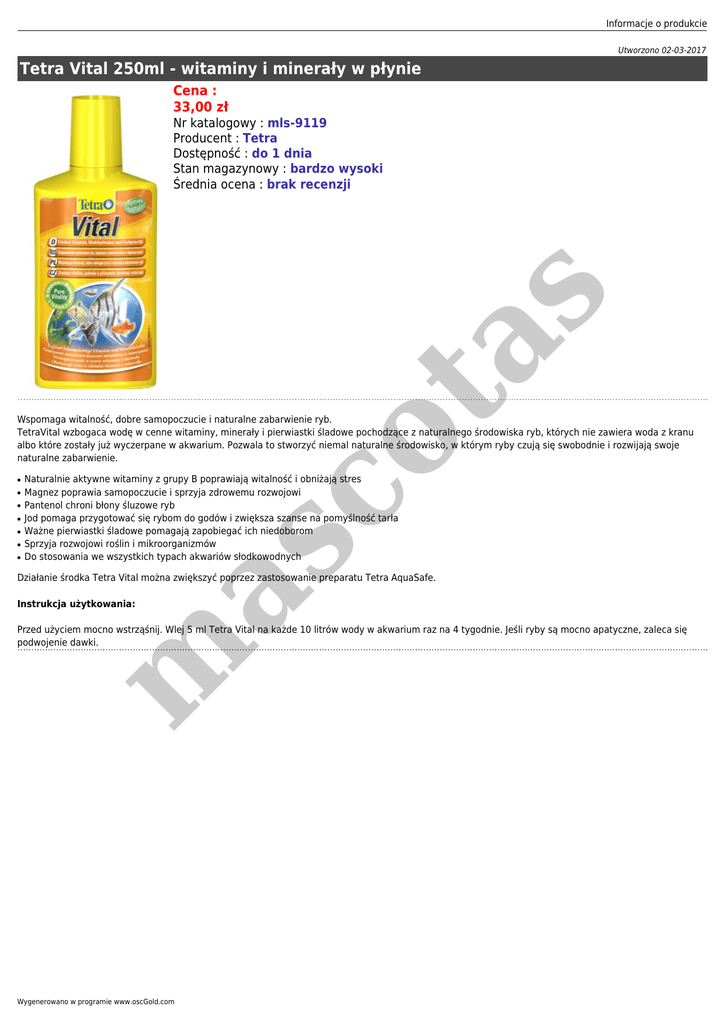 Informacje o produkcie Utworzono 02-03-2017 Tetra Vital 250ml - witaminy i minerały w płynie Cena : 33,00 zł co ta s Nr katalogowy : mls-9119 Producent : Tetra Dostępność : do 1 dnia Stan magazynowy : bardzo wysoki Średnia ocena : brak recenzji Wspomaga witalność, dobre samopoczucie i naturalne zabarwienie ryb. TetraVital wzbogaca wodę w cenne witaminy, minerały i pierwiastki śladowe pochodzące z naturalnego środowiska ryb, których nie zawiera woda z kranu albo które zostały już wyczerpane w akwarium. Pozwala to stworzyć niemal naturalne środowisko, w którym ryby czują się swobodnie i rozwijają swoje naturalne zabarwienie. ● ● ● ● ● ● Naturalnie aktywne witaminy z grupy B poprawiają witalność i obniżają stres Magnez poprawia samopoczucie i sprzyja zdrowemu rozwojowi Pantenol chroni błony śluzowe ryb Jod pomaga przygotować się rybom do godów i zwiększa szanse na pomyślność tarła Ważne pierwiastki śladowe pomagają zapobiegać ich niedoborom Sprzyja rozwojowi roślin i mikroorganizmów Do stosowania we wszystkich typach akwariów słodkowodnych m as ● Działanie środka Tetra Vital można zwiększyć poprzez zastosowanie preparatu Tetra AquaSafe. Instrukcja użytkowania: Przed użyciem mocno wstrząśnij. Wlej 5 ml Tetra Vital na każde 10 litrów wody w akwarium raz na 4 tygodnie. Jeśli ryby są mocno apatyczne, zaleca się podwojenie dawki. Wygenerowano w programie www.oscGold.com