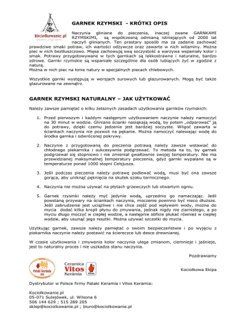 GARNEK RZYMSKI - KRÓTKI OPIS Naczynia gliniane do pieczenia, inaczej zwane GARNKAMI RZYMSKIMI, są współczesną odmianą istniejących od 2000 lat naczyń glinianych. Ten prastary sposób ma za zadanie zachować prawdziwe smaki potraw, ich wartości odżywcze oraz zawarte w nich witaminy. Można piec w nich beztłuszczowo. Mięsa zachowują swą soczystość a warzywa wspaniały kolor i smak. Potrawy przygotowywane w tych garnkach są lekkostrawne i naturalne, bardzo zdrowe. Garnki rzymskie są wspaniałe szczególnie dla osób lubiących żyć w zgodzie z naturą. Można w nich piec na łonie natury w specjalnych piecach chlebowych. Wszystkie garnki występują w wersjach surowych lub glazurowanych. Mogą być także glazurowane na zewnątrz. GARNEK RZYMSKI NATURALNY – JAK UŻYTKOWAĆ Należy zawsze pamiętać o kilku żelaznych zasadach użytkowania garnków rzymskich: 1. Przed pierwszym i każdym następnym użytkowaniem naczynie należy namoczyć na 30 minut w wodzie. Gliniane ścianki nasiąkają wodą, by potem „odparować” ją do potrawy, dzięki czemu jedzenie jest bardziej soczyste. Wilgoć zawarta w ściankach naczynia nie pozwoli na pękanie. Można namoczyć nalewając wodę do środka garnka i odwróconej pokrywy. 2. Naczynie z przygotowaną do pieczenia potrawą należy zawsze wstawiać do chłodnego piekarnika i sukcesywnie podgrzewać. To metoda na to, by garnek podgrzewał się stopniowo i nie zmieniał gwałtownie swojej temperatury. Nie ma przewidzianej maksymalnej temperatury pieczenia, gdyż garnki wypalane są w temperaturze ponad 1000 stopni Celsjusza. 3. Jeśli podczas pieczenia należy potrawę podlewać wodą, musi być ona zawsze gorąca, aby uniknąć pęknięcia na skutek szoku termicznego. 4. Naczynia nie można używać na płytach grzewczych lub otwartym ogniu. 5. Garnek rzysmki należy myć jedynie wodą, uprzednio go namaczając. Jeśli powstaną przywary na ściankach naczynia, moczenie powinno być nieco dłuższe. Jeśli zabrudzenie jest uciążliwe i nie chce zejść pod wpływem wody, można do mycia dodać kilka kropli płynu do zmywania, jednak nigdy nie ziarnistego, a po myciu długo moczyć w ciepłej wodzie, a następnie obficie płukać również w ciepłej wodzie, aby usunąć jego resztki. Można używać szczotki do mycia. Użytkując garnek, zawsze należy pamiętać o swoim bezpieczeństwie i po wyjęciu z piekarnika naczynie należy postawić na ściereczce lub desce drewnianej. W czasie użytkowania i zmywania kolor naczynia ulega zmianom, ciemnieje i jaśnieje, jest to naturalny proces i nie uszkadza stanu naczynia. Pozdrawiamy Kociołkowa Ekipa Dystrybutor w Polsce firmy Pataki Keramia i Vitos Keramia: Kociołkowanie.pl 05-071 Sulejówek, ul. Wilsona 6 506 144 629 ; 515 289 205 [email protected] ; [email protected]