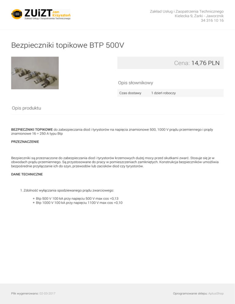 Zakład Usług i Zaopatrzenia Technicznego Kielecka 9, Żarki - Jaworznik 34 316 10 16 Bezpieczniki topikowe BTP 500V Cena: 14,76 PLN Opis słownikowy Czas dostawy 1 dzień roboczy Opis produktu BEZPIECZNIKI TOPIKOWE do zabezpieczania diod i tyrystorów na napięcia znamionowe 500, 1000 V prądu przemiennego i prądy znamionowe 16 ÷ 250 A typu Btp PRZEZNACZENIE Bezpieczniki są przeznaczone do zabezpieczania diod i tyrystorów krzemowych dużej mocy przed skutkami zwarć. Stosuje się je w obwodach prądu przemiennego. Są przystosowane do pracy w pomieszczeniach zamkniętych. Konstrukcja bezpieczników umożliwia bezpośrednie przyłączanie ich do szyn, przewodów lub zacisków diod czy tyrystorów. DANE TECHNICZNE 1. Zdolność wyłączania spodziewanego prądu zwarciowego: Btp 500 V 100 kA przy napięciu 500 V max cos =0,13 Btp 1000 V 100 kA przy napięciu 1100 V max cos =0,10 Plik wygenerowano: 02-03-2017 Oprogramowanie sklepu: AptusShop Zakład Usług i Zaopatrzenia Technicznego Kielecka 9, Żarki - Jaworznik 34 316 10 16 Parametry Proszę o wybranie natężenia prądu [A] 100 A (+ 18,45 PLN), 160 A (+ 34,44 PLN), 16A, 20 A, 200 A (+ 49,20 PLN), 25 A (+ 1,23 PLN), 250 A (+ 71,34 PLN), 32 A (+ 7,38 PLN), 40 A (+ 28,29 PLN), 50 A (+ 8,61 PLN), 63 A (+ 13,53 PLN), 80 A (+ 15,99 PLN) Proszę o wybranie natężenia prądu [A] 100 A (+ 19,68 PLN), 125 A (+ 19,68 PLN), 16 A, 160 A (+ 56,58 PLN), 20 A (+ 1,23 PLN), 200 A (+ 105,78 PLN), 25 A (+ 4,92 PLN), 250 A (+ 130,38 PLN), 32 A (+ 13,53 PLN), 40 A (+ 9,84 PLN), 50 A (+ 1,23 PLN), 63 A (+ 19,68 PLN), 80 A (+ 31,98 PLN) Plik wygenerowano: 02-03-2017 Powered by TCPDF (www.tcpdf.org) Oprogramowanie sklepu: AptusShop