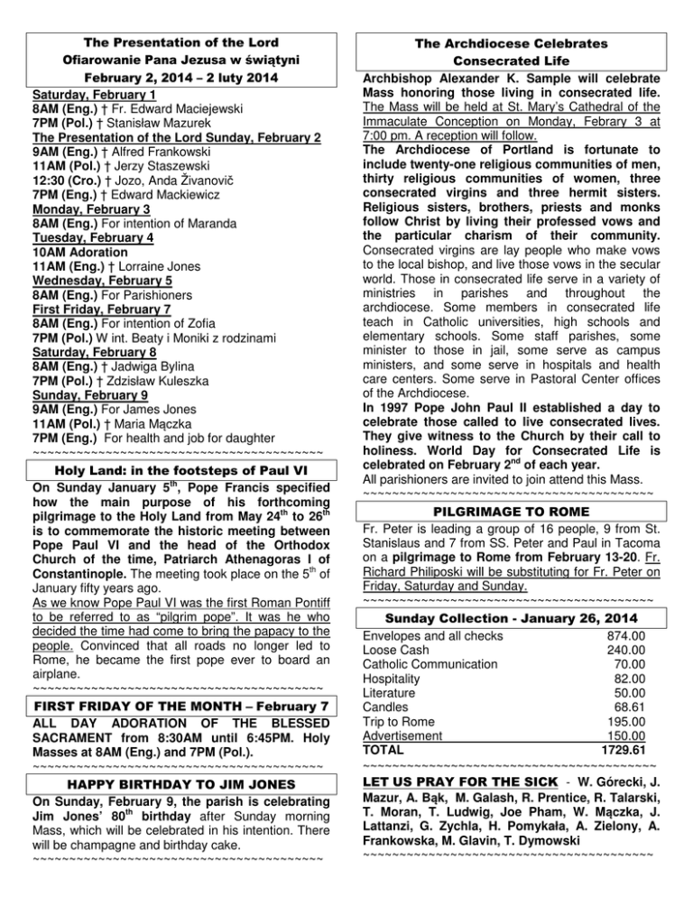The Presentation of the Lord Ofiarowanie Pana Jezusa w świątyni February 2, 2014 – 2 luty 2014 Saturday, February 1 8AM (Eng.) † Fr. Edward Maciejewski 7PM (Pol.) † Stanisław Mazurek The Presentation of the Lord Sunday, February 2 9AM (Eng.) † Alfred Frankowski 11AM (Pol.) † Jerzy Staszewski 12:30 (Cro.) † Jozo, Anda Živanovič 7PM (Eng.) † Edward Mackiewicz Monday, February 3 8AM (Eng.) For intention of Maranda Tuesday, February 4 10AM Adoration 11AM (Eng.) † Lorraine Jones Wednesday, February 5 8AM (Eng.) For Parishioners First Friday, February 7 8AM (Eng.) For intention of Zofia 7PM (Pol.) W int. Beaty i Moniki z rodzinami Saturday, February 8 8AM (Eng.) † Jadwiga Bylina 7PM (Pol.) † Zdzisław Kuleszka Sunday, February 9 9AM (Eng.) For James Jones 11AM (Pol.) † Maria Mączka 7PM (Eng.) For health and job for daughter ~~~~~~~~~~~~~~~~~~~~~~~~~~~~~~~~~~~~~~~~ Holy Land: in the footsteps of Paul VI On Sunday January 5th, Pope Francis specified how the main purpose of his forthcoming pilgrimage to the Holy Land from May 24th to 26th is to commemorate the historic meeting between Pope Paul VI and the head of the Orthodox Church of the time, Patriarch Athenagoras I of Constantinople. The meeting took place on the 5th of January fifty years ago. As we know Pope Paul VI was the first Roman Pontiff to be referred to as “pilgrim pope”. It was he who decided the time had come to bring the papacy to the people. Convinced that all roads no longer led to Rome, he became the first pope ever to board an airplane. ~~~~~~~~~~~~~~~~~~~~~~~~~~~~~~~~~~~~~~~~ FIRST FRIDAY OF THE MONTH – February 7 ALL DAY ADORATION OF THE BLESSED SACRAMENT from 8:30AM until 6:45PM. Holy Masses at 8AM (Eng.) and 7PM (Pol.). ~~~~~~~~~~~~~~~~~~~~~~~~~~~~~~~~~~~~~~~~ HAPPY BIRTHDAY TO JIM JONES On Sunday, February 9, the parish is celebrating Jim Jones’ 80th birthday after Sunday morning Mass, which will be celebrated in his intention. There will be champagne and birthday cake. ~~~~~~~~~~~~~~~~~~~~~~~~~~~~~~~~~~~~~~~~ The Archdiocese Celebrates Consecrated Life Archbishop Alexander K. Sample will celebrate Mass honoring those living in consecrated life. The Mass will be held at St. Mary’s Cathedral of the Immaculate Conception on Monday, Febrary 3 at 7:00 pm. A reception will follow. The Archdiocese of Portland is fortunate to include twenty-one religious communities of men, thirty religious communities of women, three consecrated virgins and three hermit sisters. Religious sisters, brothers, priests and monks follow Christ by living their professed vows and the particular charism of their community. Consecrated virgins are lay people who make vows to the local bishop, and live those vows in the secular world. Those in consecrated life serve in a variety of ministries in parishes and throughout the archdiocese. Some members in consecrated life teach in Catholic universities, high schools and elementary schools. Some staff parishes, some minister to those in jail, some serve as campus ministers, and some serve in hospitals and health care centers. Some serve in Pastoral Center offices of the Archdiocese. In 1997 Pope John Paul II established a day to celebrate those called to live consecrated lives. They give witness to the Church by their call to holiness. World Day for Consecrated Life is celebrated on February 2nd of each year. All parishioners are invited to join attend this Mass. ~~~~~~~~~~~~~~~~~~~~~~~~~~~~~~~~~~~~~~~~ PILGRIMAGE TO ROME Fr. Peter is leading a group of 16 people, 9 from St. Stanislaus and 7 from SS. Peter and Paul in Tacoma on a pilgrimage to Rome from February 13-20. Fr. Richard Philiposki will be substituting for Fr. Peter on Friday, Saturday and Sunday. ~~~~~~~~~~~~~~~~~~~~~~~~~~~~~~~~~~~~~~~~ Sunday Collection - January 26, 2014 Envelopes and all checks 874.00 Loose Cash 240.00 Catholic Communication 70.00 Hospitality 82.00 Literature 50.00 Candles 68.61 Trip to Rome 195.00 Advertisement 150.00 TOTAL 1729.61 ~~~~~~~~~~~~~~~~~~~~~~~~~~~~~~~~~~~~~~~~ LET US PRAY FOR THE SICK - W. Górecki, J. Mazur, A. Bąk, M. Galash, R. Prentice, R. Talarski, T. Moran, T. Ludwig, Joe Pham, W. Mączka, J. Lattanzi, G. Zychla, H. Pomykała, A. Zielony, A. Frankowska, M. Glavin, T. Dymowski ~~~~~~~~~~~~~~~~~~~~~~~~~~~~~~~~~~~~~~~~ DZIEŃ ŻYCIA KONSEKROWANEGO Poniedziałek, 3 lutego o godz. 19:00 Msza św. z Arcybiskupem Alexandrem K. Sample w Katedrze Najśw. Maryi Panny ~~~~~~~~~~~~~~~~~~~~~~~~~~~~~~~~~~~~~~~~ OFIAROWANIE PAŃSKIE Matki Bożej Gromnicznej Celebrujemy dzisiaj święto Ofiarowania Pańskiego, święto światła. Uroczyste poświęcenie świec, które są niesione w procesji, odbywa sie od X wieku. To święto jest zapowiedzią Świąt Paschalnych, a świece, które dziś trzymamy w rękach, kierują naszą myśl ku Wielkiej Nocy, kiedy to ze świecami idziemy za Chrystusem – Światłem, symbolizującym przez paschał. Światło zostanie postawione na świeczniku, aby oświetlało świątynię i każdego z nas. W ten sposób objawia się swoistość święta Ofiarowania: nawiązuje ono zarazem do Bożego Narodzenia i Wielkanocy. Paląca się świeca to znak ofiary – wyrzekającej się wszystkiego z miłości do Boga. Świeca może więc być symbolem życia poświęconego Bogu i ludzom, czyli życia konsekrowanego. W święto Ofiarowania Pańskiego w Kościele obchodzony jest Światowy Dzień Życia Konsekrowanego. ~~~~~~~~~~~~~~~~~~~~~~~~~~~~~~~~~~~~~~ EKUMENIZM Każdy chrześcijanin wezwany jest do tego, aby wnieść swój wkład na drodze ku pełnej jedności wyznawców Chrystusa. Może on odpowiedzieć na to wezwanie w różnych formach: reforma kościołów, odnowa teologiczna, dialog miłości, ekumenizm duchowy i ekumenizm pastoralny. Dialog miłości jest trzecią drogą ku zjednoczeniu, które poprzez braterstwo, aprobatę i wzajemną miłość wnosi wkład w usunięcie uprzedzeń i nieufności, jakie narosły w ciagu długich wieków, oraz przyczynia się 