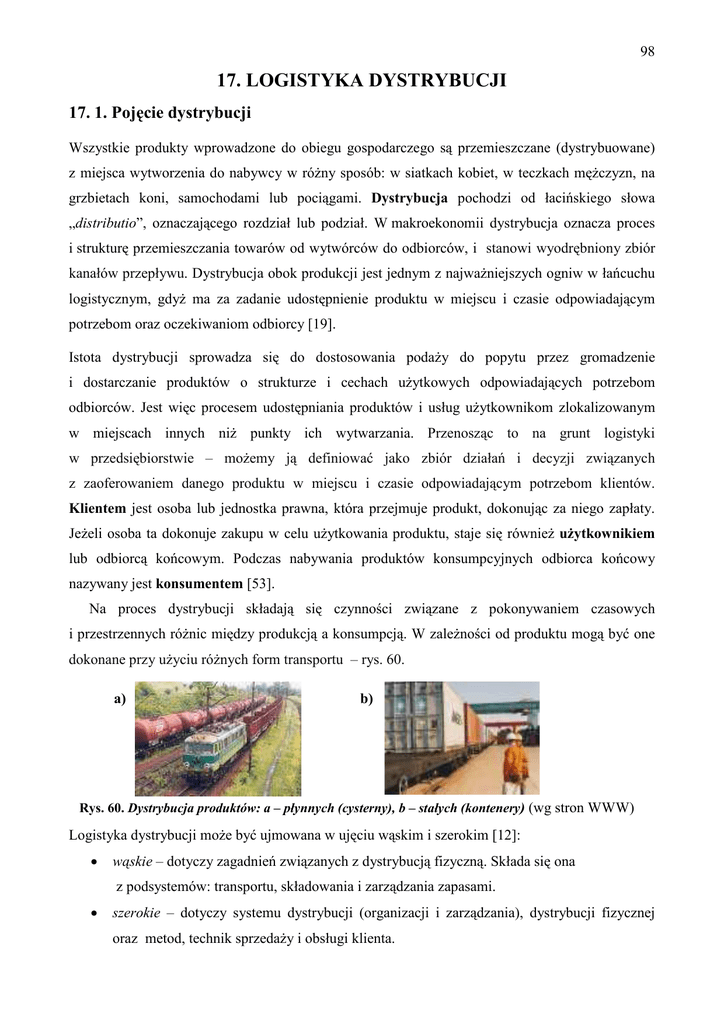 98 17. LOGISTYKA DYSTRYBUCJI 17. 1. Pojęcie dystrybucji Wszystkie produkty wprowadzone do obiegu gospodarczego są przemieszczane (dystrybuowane) z miejsca wytworzenia do nabywcy w róŜny sposób: w siatkach kobiet, w teczkach męŜczyzn, na grzbietach koni, samochodami lub pociągami. Dystrybucja pochodzi od łacińskiego słowa „distributio”, oznaczającego rozdział lub podział. W makroekonomii dystrybucja oznacza proces i strukturę przemieszczania towarów od wytwórców do odbiorców, i stanowi wyodrębniony zbiór kanałów przepływu. Dystrybucja obok produkcji jest jednym z najwaŜniejszych ogniw w łańcuchu logistycznym, gdyŜ ma za zadanie udostępnienie produktu w miejscu i czasie odpowiadającym potrzebom oraz oczekiwaniom odbiorcy [19]. Istota dystrybucji sprowadza się do dostosowania podaŜy do popytu przez gromadzenie i dostarczanie produktów o strukturze i cechach uŜytkowych odpowiadających potrzebom odbiorców. Jest więc procesem udostępniania produktów i usług uŜytkownikom zlokalizowanym w miejscach innych niŜ punkty ich wytwarzania. Przenosząc to na grunt logistyki w przedsiębiorstwie – moŜemy ją definiować jako zbiór działań i decyzji związanych z zaoferowaniem danego produktu w miejscu i czasie odpowiadającym potrzebom klientów. Klientem jest osoba lub jednostka prawna, która przejmuje produkt, dokonując za niego zapłaty. JeŜeli osoba ta dokonuje zakupu w celu uŜytkowania produktu, staje się równieŜ uŜytkownikiem lub odbiorcą końcowym. Podczas nabywania produktów konsumpcyjnych odbiorca końcowy nazywany jest konsumentem [53]. Na proces dystrybucji składają się czynności związane z pokonywaniem czasowych i przestrzennych róŜnic między produkcją a konsumpcją. W zaleŜności od produktu mogą być one dokonane przy uŜyciu róŜnych form transportu – rys. 60. a) b) Rys. 60. Dystrybucja produktów: a – płynnych (cysterny), b – stałych (kontenery) (wg stron WWW) Logistyka dystrybucji moŜe być ujmowana w ujęciu wąskim i szerokim [12]: • wąskie – dotyczy zagadnień związanych z dystrybucją fizyczną. Składa się ona z podsystemów: transportu, składowania i zarządzania zapasami. • szerokie – dotyczy systemu dystrybucji (organizacji i zarządzania), dystrybucji fizycznej oraz metod, technik sprzedaŜy i obsługi klienta. 99 17.2. Funkcje i zadania dystrybucji Podstawowe zadanie dystrybucji to dostarczenie klientom poŜądanych przez nich produktów do miejsc, w których chcą je nabyć, w odpowiadającym im czasie, na uzgodnionych warunkach i po akceptowanej przez nich cenie. Istotą dystrybucji fizycznej jest przepływ produktów od producenta do konsumenta. Jest to więc praktyczna realizacja wypracowanej w procesie planowania strategii dystrybucji. Główne jej cele to zagwarantowanie nabywcom satysfakcjonującego poziomu obsługi i minimalizacja kosztów. Realizowane jest to poprzez odpowiednie kanały – rys. 61 [19]. DYSTRYBUCJA Kanały dystrybucji Dystrybucja fizyczna -rodzaj, struktura, liczba, -współuczestnicy kanału, -instytucje wspomagające przepływ strumieni rynkowych. -obsługa zamówień, -transport -uŜytkowanie magazynów, -utrzymywanie zapasów. -przepustowość kanału -efekty -poziom obsługi dystrybucyjnej -koszty Zadania Ocena Rys. 61. Powiązanie elementów dystrybucji w przedsiębiorstwie (wg A. Czubały [19]) Zadania logistyki w dystrybucji mogą być dzielone pomiędzy uczestników kanału dystrybucji. Powstaje jednak kwestia, kto będzie je wykonywał, kto będzie za nie płacił, i kto będzie je koordynował. Sposób dzielenia funkcji w kanale dystrybucji wpływa na kompozycję marketingu mix w zakładzie przemysłowym, wysokość marŜy przyznawanej pośrednikom i sposób kalkulacji cen produktów. Zadania związane z kształtowaniem obrotu pomiędzy jednostkami gospodarczymi i klientami produktów nazywa się funkcjami dystrybucji. Funkcje dystrybucji polegają na niwelowaniu rozbieŜności między ofertą tworzoną przez producentów, a zapotrzebowaniem zgłaszanym przez nabywców, dotyczącym rodzaju towaru, czasu, miejsca, ilości czy asortymentu. W literaturze wyróŜnia się dwie grupy funkcji [87]: • koordynacyjne – zmierzające do zrównowaŜenia podaŜy z popytem, obejmują uzgodnienia i podejmowanie decyzji dotyczących wielkości produkcji i ekonomicznego jej podziału w procesie dystrybucji, oraz tworzenie i organizowanie procesu informacyjnego podporządkowanego tym decyzjom. Koordynacja podaŜy i popytu odbywa się w trakcie wykonywania takich czynności, jak: sortowanie, kompletowanie, asortymentacja, itp. • organizacyjne – związane z techniczną manipulacją produktami. Głównym składnikiem jest techniczna manipulacja towarem, która moŜe być dokonywana przez producenta lub handel. Warunkiem wypełnienia funkcji organizacyjnych jest dysponowanie odpowiednimi środkami technicznymi, przede wszystkim magazynami i środkami transportu. Środki te stanowią materialną podstawę funkcji organizacyjnych. 100 17.3. Misja logistyki dystrybucji Osiągnięcie wysokiej jakości dystrybucji zaleŜy od rozpoznania potrzeb i wymagań kaŜdego rodzaju nabywców. Bardzo waŜną czynnością jest przewidzenie wysokości popytu, bez którego firma nie osiągnie szybkiego wzrostu sprzedaŜy, gdyŜ nagłe zachwiania popytu będą to uniemoŜliwiały. Szybkie realizowanie zamówień klientów oraz dobór sprawnych i efektywnych kanałów dystrybucji, to kluczowe aspekty logistyki, prowadzące do osiągnięcia załoŜonego celu firmy. Z samej istoty logistyki wynika, Ŝe jest ona sztuką przemieszczania, w tym znaczeniu, Ŝe zarządzanie nią ma zapewnić jednoczesne spełnienie trzech kryteriów [19]: • dostawy szybkiej i w terminie, • po moŜliwie minimalnym koszcie, • z optymalną jakością obsługi klienta (nadawcy i odbiorcy), przy róŜnym stopniu róŜnorodności dostarczanych produktów, usług i informacji, róŜnej wielkości partii, r