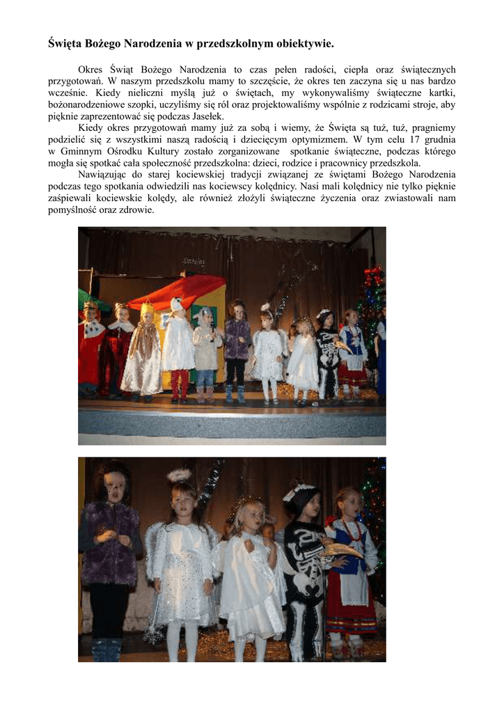 Święta Bożego Narodzenia w przedszkolnym obiektywie. Okres Świąt Bożego Narodzenia to czas pełen radości, ciepła oraz świątecznych przygotowań. W naszym przedszkolu mamy to szczęście, że okres ten zaczyna się u nas bardzo wcześnie. Kiedy nieliczni myślą już o świętach, my wykonywaliśmy świąteczne kartki, bożonarodzeniowe szopki, uczyliśmy się ról oraz projektowaliśmy wspólnie z rodzicami stroje, aby pięknie zaprezentować się podczas Jasełek. Kiedy okres przygotowań mamy już za sobą i wiemy, że Święta są tuż, tuż, pragniemy podzielić się z wszystkimi naszą radością i dziecięcym optymizmem. W tym celu 17 grudnia w Gminnym Ośrodku Kultury zostało zorganizowane spotkanie świąteczne, podczas którego mogła się spotkać cała społeczność przedszkolna: dzieci, rodzice i pracownicy przedszkola. Nawiązując do starej kociewskiej tradycji związanej ze świętami Bożego Narodzenia podczas tego spotkania odwiedzili nas kociewscy kolędnicy. Nasi mali kolędnicy nie tylko pięknie zaśpiewali kociewskie kolędy, ale również złożyli świąteczne życzenia oraz zwiastowali nam pomyślność oraz zdrowie. Po kolędnikach scenę zajęła najstarsza przedszkolna grupa „Słoneczka”, która zaprezentowała zebranym Jasełka. Zebrani mogli obejrzeć historię Maryi i Józefa szukających schronienia w Betlejem, pasterzy, którym objawił się anioł z Dobrą Nowiną oraz stajenkę z nowo narodzonym Jezusem, do którego przybyli królowie. Korzystając z tego, że spotkaliśmy się tego wieczoru w bardzo licznym gronie, organizatorzy Gminnego Konkursu Plastycznego „Dobre rady na odpady” wręczyli nagrody laureatom konkursu. Piękne książki oraz dyplomy z rąk v-ce wójta gminy Artura Herolda oraz pani dyrektor Beaty Cyrson otrzymali mali artyści wraz z rodzicami, którzy wykazali się ogromną pomysłowością oraz wielkim talentem. Na zakończenie spotkania były podziękowania dla małych artystów, rodziców i nauczycieli oraz życzenia dla wszystkich - Aby ten szczególny czas Świąt Bożego Narodzenia był okazją do spędzenia miłych chwil w gronie najbliższych, w atmosferze pełnej miłości i wzajemnej życzliwości, a Nowy Rok 2014, by stał się czasem spełnionych marzeń i nadziei od pani dyrektor i v-ce Wójta Gminy Zblewo Artura Herolda. Zwieńczeniem uroczystości był świąteczny kiermasz, który cieszył się ogromnym powodzeniem. Dzięki współpracy dzieci, nauczycieli oraz rodziców naszych przedszkolaków stoły uginały się pod ogromem niepowtarzalnych, świątecznych ozdób. Hojność odwiedzających kiermasz zaowocuje w postaci nowych zabawek dla przedszkolaków. 17 grudnia to nie tylko dzień spotkania świątecznego. Również tego dnia w Kościele p.w. Św. Wojciecha w Starogardzie Gd. wręczono nagrody autorom i twórcom najładniejszych szopek XXII Kociewskiego Konkursu Plastycznego na Najciekawszą Szopkę Bożonarodzeniową oraz Ogólnopolskiego Konkursu Plastycznego na Kociewską Kartkę Pocztową o Tematyce Bożonarodzeniowej. Organizatorem konkursów jest Ognisko Pracy Pozaszkolnej w Starogardzie Gd.W kategorii przedszkola, grupa „Pszczółki” z Gminnego Przedszkola w Zblewie otrzymała I nagrodę w konkursie na Najciekawszą Szopkę Bożonarodzeniową. W Ogólnopolskim Konkursie Plastycznym na Kociewską Kartkę Bożonarodzeniową jury dokonało oceny 730 prac. W kategorii przedszkola i grupy „0” ze szkół podstawowych, praca wychowanki przedszkola Agatki Nierzwickiej otrzymała wyróżnienie. Następnego dnia kolędnicy mieli pełne ręce roboty. Chcąc przekazać świąteczne życzenia od całej społeczności przedszkolnej, z kolędą na ustach oraz z życzeniami zdrowia oraz pomyślności odwiedzili instytucje współpracujące z Gminnym Przedszkolem w Zblewie. Mali kolędnicy w podziękowaniu za odwiedziny otrzymali mnóstwo słodyczy i owoców, a nawet książeczki, z czego byli ogromnie zadowoleni. Zakończeniem naszych świątecznych przygotowań była uroczysta wigilia w grupach przedszkolnych, podczas której śpiewaliśmy kolędy, składaliśmy sobie życzenia oraz częstowaliśmy się łakociami przygotowanymi przez rodziców. Mamy nadzieję, że tymi przedświątecznymi akcentami wprowadziliśmy wszystkich w magię Świąt Bożego Narodzenia. Joanna Wesołowska