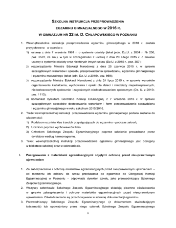 SZKOLNA INSTRUKCJA PRZEPROWADZENIA EGZAMINU GIMNAZJALNEGO W 2016 R. W GIMNAZJUM NR 22 IM. D. CHŁAPOWSKIEGO W POZNANIU 1. Wewnątrzszkolna instrukcja przeprowadzenia egzaminu gimnazjalnego w 2016 r. została przygotowana w oparciu o: 1) ustawę z dnia 7 września 1991 r. o systemie oświaty (tekst jedn. Dz.U. z 2004 r. Nr 256, poz. 2572, ze zm.), w tym w szczególności z ustawą z dnia 20 lutego 2015 r. o zmianie ustawy o systemie oświaty oraz niektórych innych ustaw (Dz.U. z 2015 r., poz. 357); 2) rozporządzenie Ministra Edukacji Narodowej z dnia 25 czerwca 2015 r. w sprawie szczegółowych warunków i sposobu przeprowadzania sprawdzianu, egzaminu gimnazjalnego i egzaminu maturalnego (tekst jedn. Dz. U. z 2015r. poz. 959); 3) rozporządzenie Ministra Edukacji Narodowej z dnia 24 lipca 2015 r. w sprawie warunków organizowania kształcenia, wychowania i opieki dla dzieci i młodzieży niepełnosprawnych, niedostosowanych społecznie i zagrożonych niedostosowaniem społecznym (Dz. U. z 2015r. poz. 1113); 4) komunikat dyrektora Centralne Komisji Edukacyjnej z 7 września 2015 r. w sprawie szczegółowych sposobów dostosowania warunków i form przeprowadzania sprawdzianu i egzaminu gimnazjalnego w roku szkolnym 2015/2016. 2. Treść wewnątrzszkolnej instrukcji przeprowadzenia egzaminu gimnazjalnego podana zostanie do wiadomości: 1) Rodzicom uczniów klas trzecich przystępujących do egzaminu - podczas zebrań; 2) Uczniom poprzez wychowawców klas 3) Członkom Szkolnego Zespołu Egzaminacyjnego poprzez szkolenie prowadzone przez dyrektora według harmonogramu. 3. Tekst wewnątrzszkolnej instrukcji przeprowadzenia egzaminu gimnazjalnego jest dostępny w bibliotece szkolnej oraz w sekretariacie. I. Postępowanie z materiałami egzaminacyjnymi objętymi ochroną przed nieuprawnionym ujawnieniem 1. Za zabezpieczenie i ochronę materiałów egzaminacyjnych przed nieuprawnionym ujawnieniem – od momentu ich odbioru do czasu przekazania po egzaminie do Okręgowej Komisji Egzaminacyjnej w Poznaniu – odpowiada dyrektor szkoły, jako przewodniczący Szkolnego Zespołu Egzaminacyjnego. 2. Wszyscy członkowie Szkolnego Zespołu Egzaminacyjnego składają pisemne oświadczenia w sprawie zabezpieczenia i ochrony materiałów egzaminacyjnych przed nieuprawnionym ujawnieniem. Oświadczenia te są przechowywane w szkolnej dokumentacji egzaminu. 3. Przewodniczący Szkolnego Zespołu Egzaminacyjnego (z dokumentem stwierdzającym tożsamość) lub upoważniony przez niego członek Szkolnego Zespołu Egzaminacyjnego 1 z pisemnym upoważnieniem i dokumentem stwierdzającym tożsamość, w obecności innego członka tego zespołu, odbiera przesyłkę zawierającą arkusze egzaminacyjne, w przypadku egzaminu z języka obcego nowożytnego również płyty CD. Sprawdza, czy nie została ona naruszona. Bezpośrednio po odbiorze sprawdza zgodność przesyłki z zapotrzebowaniem i wykazem zawartości przesyłki. Następnie składa materiały egzaminacyjne w stanie nienaruszonym w gabinecie dyrektora, zabezpieczając je przed nieuprawnionym ujawnieniem. 4. Jeśli paczki z materiałami egzaminacyjnymi są naruszone lub ich zawartość nie jest zgodna z zapotrzebowaniem na materiały egzaminacyjne, przewodniczący lub upoważniony przez niego członek Szkolnego Zespołu Egzaminacyjnego niezwłocznie powiadamia o tym Dyrektora Okręgowej Komisji Egzaminacyjnej w Poznaniu i dystrybutora materiałów egzaminacyjnych. Dyrektor Okręgowej Komisji Egzaminacyjnej w Poznaniu informuje Przewodniczącego Szkolnego Zespołu Egzaminacyjnego lub upoważnionego przez niego członka tego zespołu o dalszym postępowaniu. 5. Przewodniczący Szkolnego Zespołu Egzaminacyjnego około pół godziny przed rozpoczęciem pracy z danym arkuszem egzaminacyjnym, w gabinecie dyrektora, sprawdza, czy pakiety z materiałami egzaminacyjnymi nie zostały naruszone i otwiera je w obecności przewodniczących wszystkich zespołów nadzorujących oraz przedstawicieli zdających. Fakt ten zostaje odnotowany w protokole. Jeżeli pakiety z materiałami egzaminacyjnymi są naruszone, przewodniczący lub upoważniony przez niego członek szkolnego zespołu egzaminacyjnego niezwłocznie powiadamia o tym Dyrektora Okręgowej Komisji Egzaminacyjnej w Poznaniu oraz postępuje dalej zgodnie z jego zaleceniami. 6. W przypadku egzaminu z języka obcego nowożytnego otwarcie opakowania płyty CD następuje w sali egzaminacyjnej bezpośrednio po wniesieniu do niej materiałów egzaminacyjnych. 7. Przewodniczący zespołu nadzorującego w obecności przedstawicieli zdających przenosi przygotowane materiały egzaminacyjne do sali egzaminacyjnej. 8. Po rozdaniu arkuszy egzaminacyjnych każdemu uczniowi i po zakończeniu czynności organizacyjnych wszystkie niewykorzystane oraz wadliwe arkusze egzaminacyjne umieszcza się w opisanej kopercie, którą się zakleja. Liczbę niewykorzystanych i wadliwych arkuszy, a w przypadku egzaminu z języka obcego nowożytnego, również liczbę niewykorzystanych oraz wadliwych płyt CD, odnotowuje się w protokołach. 9. Bezpośrednio po zakończeniu pracy z każdym arkuszem egzaminacyjnym w obecności przedstawicieli zdających następuje odbiór prac od zdających, podział arkuszy zdających, którzy mają obowiązek zaznaczenia odpowiedzi na karcie, uporządkowanie i przeliczenie materiałów, odnotowanie liczby arkuszy i ich części w protokole oraz spakowanie i opisanie tych materiałów (zgodnie z zaleceniami Okręgowej Komisji Egzaminacyjnej w Poznaniu) oraz przekazanie ich Przewodniczącemu Szkolnego Zespołu Egzaminacyjnego. 10. Po zakończeniu egzaminu z danego zakresu/poziomu Przewodniczący Szkolnego Zespołu Egzaminacyjnego, w obecności przewodniczących zespołów nadzorujących, sprawdza kompletność materiałów egzaminacyjnych otrzymanych z sal i pakuje je zgodnie z zaleceniami Okręgowej Komisji Egzaminacyjnej w Poznaniu. 2 11. Przewodniczący Szkolnego Zespołu Egzaminacyjnego lub upoważnieni przez n