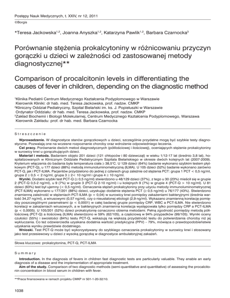 Postępy Nauk Medycznych, t. XXIV, nr 12, 2011 ©Borgis *Teresa Jackowska1,2, Joanna Anyszka1,2, Katarzyna Pawlik1,2, Barbara Czarnocka3 Porównanie stężenia prokalcytoniny w różnicowaniu przyczyn gorączki u dzieci w zależności od zastosowanej metody diagnostycznej** Comparison of procalcitonin levels in differentiating the causes of fever in children, depending on the diagnostic method Klinika Pediatrii Centrum Medycznego Kształcenia Podyplomowego w Warszawie Kierownik Kliniki: dr hab. med. Teresa Jackowska, prof. nadzw. CMKP 2 Kliniczny Oddział Pediatryczny, Szpital Bielański im. ks. J. Popieluszki w Warszawie Ordynator oddziału: dr hab. med. Teresa Jackowska, prof. nadzw. CMKP 3 Zakład Biochemii i Biologii Molekularnej, Centrum Medycznego Kształcenia Podyplomowego, Warszawa Kierownik Zakładu: prof. dr hab. med. Barbara Czarnocka 1 Streszczenie Wprowadzenie. W diagnostyce stanów gorączkowych u dzieci, szczególnie przydatne mogą być szybkie testy diagnostyczne. Pozwalają one na wczesne rozpoznanie choroby oraz wdrożenie odpowiedniego leczenia. Cel pracy. Porównanie dwóch metod diagnostycznych (półilościowej i ilościowej), oceniających stężenie prokalcytoniny w surowicy krwi u gorączkujących dzieci. Materiał i metoda. Badaniem objęto 201 dzieci (121 chłopców i 80 dziewcząt) w wieku 1/12-17 lat (średnio 3,8 lat), hospitalizowanych w Klinicznym Oddziale Pediatrycznym Szpitala Bielańskiego w okresie dwóch kolejnych lat (2007-2009). Kryterium włączenia do badania była temperatura ciała ≥ 38,5°C. U 129 dzieci (64%) badanie wykonano szybkim testem płytkowym (PCT-Q), u 177 dzieci (88%) metodą immunoluminometryczną (ILMA). U 105 dzieci (52%) badanie wykonano zarówno PCT-Q, jak i PCT-ILMA. Pacjentów przydzielono do jednej z czterech grup zależnie od stężenia PCT: grupa 1 PCT < 0,5 ng/ml, grupa 2 ≥ 0,5 < 2 ng/ml, grupa 3 ≥ 2< 10 ng/ml i grupa 4 ≥ 10 ng/ml. Wyniki. Dodatni szybki test PCT-Q (≥ 0,5 ng/ml) stwierdzono u 48/129 dzieci (37%), z tego u 30 (23%) mieścił się w grupie 2 (PCT-Q 0,5-2 ng/ml), u 9 (7%) w grupie 3 (PCT-Q 2-10 ng/ml) i u kolejnych 9 (7%) w grupie 4 (PCT-Q > 10 ng/ml). U 81 dzieci (63%) test był ujemny (< 0,5 ng/ml). Oznaczenia stężeń prokalcytoniny przy użyciu metody immunoluminometrycznej (PCT-ILMA) wykonano u 177/201 (88%) dzieci, uzyskując dodatnie stężenia PCT (≥ 0,5 ng/ml) u 76/177 (43%). Stwierdzono znamienną zależność w stężeniach PCT-ILMA (p = 0,04) w surowicy krwi pomiędzy zakażeniami bakteryjnymi (średnia wartość 34,27 ng/ml), a wirusowymi (0,57 ng/ml), czy o nieustalonej etiologii (2,9 ng/ml). Wykazano znamienną korelację pomiędzy poszczególnymi parametrami (p < 0,0001) w całej badanej grupie pomiędzy CRP, WBC a PCT-ILMA. Nie stwierdzono korelacji w zakażeniach wirusowych, a w bakteryjnych znamienna korelacja występowała tylko pomiędzy CRP a PCT-ILMA (p < 0,0005). U 105/201 (52%) dzieci prokalcytonię oznaczono obiema metodami. Pełną zgodność pomiędzy metodą półilościową (PCT-Q) a ilościową (ILMA) stwierdzono w 59% (62/105), a częściową w 94% przypadków (99/105). Wyniki oceny czułości (55%) i swoistości (84%) testu PCT-Q, wskazują na większą przydatność testu do potwierdzenia choroby niż jej wykluczania. Co też odzwierciedla uzyskana dodatnia wartość predykcyjna (PPV) – 79%, mówiąca o prawdopodobieństwie uzyskania wyniku prawdziwie dodatniego. Wnioski. Test PCT-Q może być wykorzystywany do szybkiego oznaczania prokalcytoniny w surowicy krwi i stosowany jako test przesiewowy u dzieci z wysoką gorączką w diagnostyce ambulatoryjnej zakażeń. Słowa kluczowe: prokalcytonina, PCT-Q, PCT-ILMA Summary Introduction. In the diagnosis of fevers in children fast diagnostic tests are particularly valuable. They enable an early diagnosis of a disease and the implementation of appropriate treatment. Aim of the study. Comparison of two diagnostic methods (semi-quantitative and quantitative) of assessing the procalcitonin concentration in blood serum in children with fever. **Praca finansowana w ramach projektu CMKP nr 501-1-20-32/10. 1038 Porównanie stężenia prokalcytoniny w różnicowaniu przyczyn gorączki u dzieci... Material and methods. The study included 201 children (121 boys and 80 girls) aged from 1 month to 17 years (average 3.8 years), hospitalized at the Clinical Department of Pediatrics, Bielański Hospital in Warsaw, in the period of two subsequent years (2007-2009). The criterion to include the child in the study was a body temperature ≥ 38.5°C. In 129 (64%) children the assessment was carried out using the rapid test (PCT-Q), in 177 (88%) children using the immunoluminometric method (ILMA). In 105 out of 201 (52%) children both tests were performed (PCT-Q and PCT-ILMA). The patients were categorised into one of four groups, depending on the level of PCT: group 1 PCT < 0.5 ng/ml, group 2 ≥ 0.5 < 2 ng/ml, group 3 ≥ 2< 10 ng/ml and group 4 ≥ 10 ng/ml. Results. A positive PCT-Q (≥ 05 ng/ml) rapid test result occurred in 48 out of 129 (37%) children, of which in 30 (23%) the result belonged to group 2 (PCT-Q 0.5-2 ng/ml), in 9 (7%) to group 3 (PCT-Q 2-10 ng/ml) and in the remaining 9 (7%) to group 4 (PCT-Q > 10 ng/ml). In 81 (63%) children the test was negative (< 0.5 ng/ml). The procalcitonin level was determined using the immunoluminometric method (PCT-ILMA) in 177 out of 201 (88%) children, with positive PCT (≥ 0.5 ng/ml) levels in 76 out of 177 (43%) cases. A significant dependence was observed for the PCT-ILMA (p = 0.04) levels in blood serum between bacterial infections (average value/level 34.27 ng/ml) and viral ones (0.57 ng/ml) or of an unspecified etiology (2.9 ng/ml). A considerable correlation was also found between the particular parameters (p < 0.0001), in the whole group under investigation, between the CRP, WBC, and PCT-ILMA. A correlation was not observed in viral infections, while in bacterial ones a sig