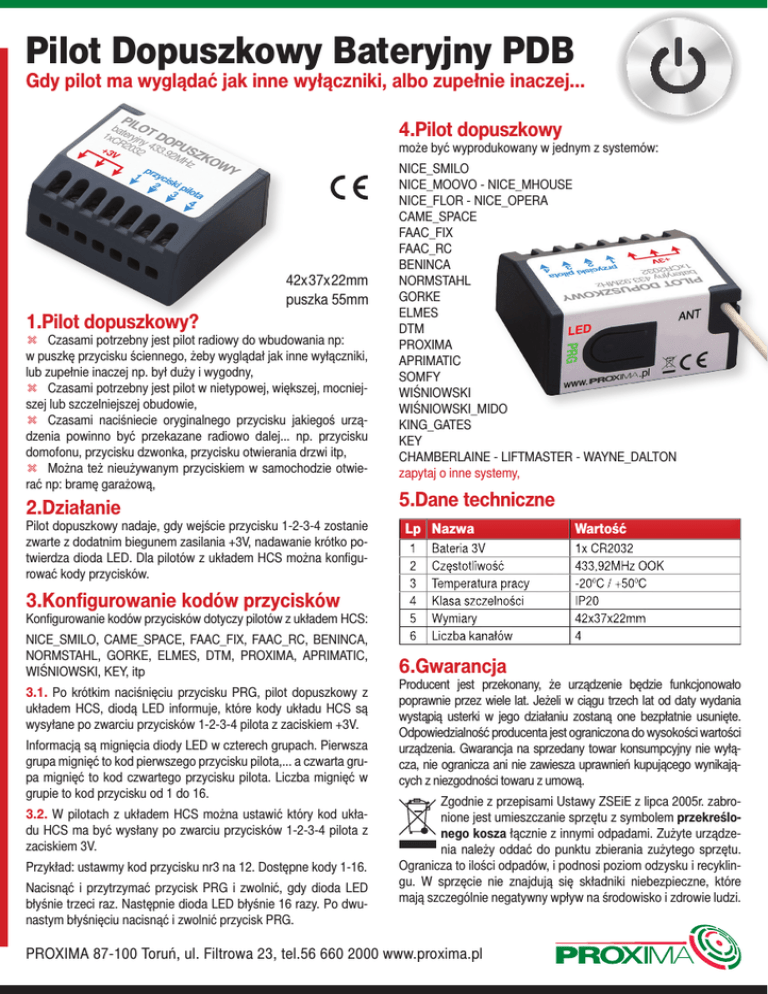 Pilot Dopuszkowy Bateryjny PDB Gdy pilot ma wyglądać jak inne wyłączniki, albo zupełnie inaczej... 4.Pilot dopuszkowy może być wyprodukowany w jednym z systemów: 42x 37x 22mm puszka 55mm 1.Pilot dopuszkowy? t Czasami potrzebny jest pilot radiowy do wbudowania np: w puszkę przycisku ściennego, żeby wyglądał jak inne wyłączniki, lub zupełnie inaczej np. był duży i wygodny, t Czasami potrzebny jest pilot w nietypowej, większej, mocniejszej lub szczelniejszej obudowie, t Czasami naciśniecie oryginalnego przycisku jakiegoś urządzenia powinno być przekazane radiowo dalej... np. przycisku domofonu, przycisku dzwonka, przycisku otwierania drzwi itp, t Można też nieużywanym przyciskiem w samochodzie otwierać np: bramę garażową, 2.Działanie Pilot dopuszkowy nadaje, gdy wejście przycisku 1-2-3-4 zostanie zwarte z dodatnim biegunem zasilania +3V, nadawanie krótko potwierdza dioda LED. Dla pilotów z układem HCS można konfigurować kody przycisków. NICE_SMILO NICE_MOOVO - NICE_MHOUSE NICE_FLOR - NICE_OPERA CAME_SPACE FAAC_FIX FAAC_RC BENINCA NORMSTAHL GORKE ELMES DTM PROXIMA APRIMATIC SOMFY WIŚNIOWSKI WIŚNIOWSKI_MIDO King_GAtes KEY CHAMBERLAINE - LIFTMASTER - Wayne_DALTON zapytaj o inne systemy, 5.Dane techniczne Lp Nazwa Wartość 3.Konfigurowanie kodów przycisków Konfigurowanie kodów przycisków dotyczy pilotów z układem HCS: NICE_SMILO, CAME_SPACE, FAAC_FIX, FAAC_RC, BENINCA, NORMSTAHL, GORKE, ELMES, DTM, PROXIMA, APRIMATIC, WIŚNIOWSKI, KEY, itp 3.1. Po krótkim naciśnięciu przycisku PRG, pilot dopuszkowy z układem HCS, diodą LED informuje, które kody układu HCS są wysyłane po zwarciu przycisków 1-2-3-4 pilota z zaciskiem +3V. Informacją są mignięcia diody LED w czterech grupach. Pierwsza grupa mignięć to kod pierwszego przycisku pilota,... a czwarta grupa mignięć to kod czwartego przycisku pilota. Liczba mignięć w grupie to kod przycisku od 1 do 16. 3.2. W pilotach z układem HCS można ustawić który kod układu HCS ma być wysłany po zwarciu przycisków 1-2-3-4 pilota z zaciskiem 3V. Przykład: ustawmy kod przycisku nr3 na 12. Dostępne kody 1-16. Nacisnąć i przytrzymać przycisk PRG i zwolnić, gdy dioda LED błyśnie trzeci raz. Następnie dioda LED błyśnie 16 razy. Po dwunastym błyśnięciu nacisnąć i zwolnić przycisk PRG. 6.Gwarancja Producent jest przekonany, że urządzenie będzie funkcjonowało poprawnie przez wiele lat. Jeżeli w ciągu trzech lat od daty wydania wystąpią usterki w jego działaniu zostaną one bezpłatnie usunięte. Odpowiedzialność producenta jest ograniczona do wysokości wartości urządzenia. Gwarancja na sprzedany towar konsumpcyjny nie wyłącza, nie ogranicza ani nie zawiesza uprawnień kupującego wynikających z niezgodności towaru z umową. Zgodnie z przepisami Ustawy ZSEiE z lipca 2005r. zabronione jest umieszczanie sprzętu z symbolem przekreślonego kosza łącznie z innymi odpadami. Zużyte urządzenia należy oddać do punktu zbierania zużytego sprzętu. Ogranicza to ilości odpadów, i podnosi poziom odzysku i recyklingu. W sprzęcie nie znajdują się składniki niebezpieczne, które mają szczególnie negatywny wpływ na środowisko i zdrowie ludzi. PROXIMA 87-100 Toruń, ul. Filtrowa 23, tel.56 660 2000 www.proxima.pl
