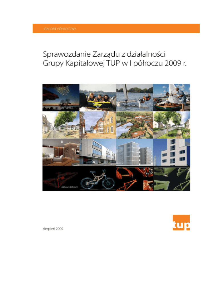 Sprawozdanie Zarządu Grupy Kapitałowej TUP za I półrocze 2009r. SPIS TREŚCI 1. Grupa Kapitałowa ......................................................................................................................... 3 2. Inne istotne informacje dla oceny działalności ......................................................................... 5 3. Czynniki mające wpływ na osiągnięcie wyników w przyszłości........................................... 11 4. Ryzyka i zagroŜenia oraz zarządzanie ryzykiem finansowym ............................................. 12 5. Informacje o prognozach wyników finansowych .................................................................... 16 6. Struktura akcjonariatu ................................................................................................................ 16 7. Informacja o stanie posiadania akcji Spółki przez osoby zarządzające i nadzorujące .... 16 8. Informacje o postępowaniach sądowych ................................................................................ 17 9. Transakcje z podmiotami powiązanymi .................................................................................. 17 10. Poręczenia i gwarancje .......................................................................................................... 19 str. 2 Sprawozdanie Zarządu Grupy Kapitałowej TUP za I półrocze 2009r. 1. Grupa Kapitałowa Opis organizacji Grupy Kapitałowej TUP ze wskazaniem jednostek podlegających konsolidacji oraz wskazanie skutków zmian w strukturze jednostki gospodarczej, w tym w wyniku połączenia jednostek gospodarczych, przejęcia lub sprzedaŜy jednostek grupy kapitałowej Emitenta, inwestycji długoterminowych, podziału, restrukturyzacji i zaniechania działalności TUP S.A. jest inwestorem finansowym, który w swoim portfelu posiada spółki operujące w ramach kilku segmentów rynkowych. Celem działania TUP S.A. jest kreowanie wartości przejmowanych podmiotów. Spółka inwestuje w przedsięwzięcia posiadające duŜy potencjał oraz moŜliwość osiągnięcia wysokiego zwrotu z zaangaŜowanego kapitału. TUP S.A. kieruje się zasadami zrównowaŜonego rozwoju i odpowiedzialności społecznej. Spółki znajdujące się w portfelu inwestycyjnym TUP jako Emitenta stanowią jego aktywa. W Grupie Kapitałowej nie występuje integracja działalności w jednym lub pokrewnych segmentach rynku. Na dzień 30 czerwca 2009 r. Grupę TUP tworzyło 10 jednostek zaleŜnych oraz dwa podmioty stowarzyszone. TUP S.A. spółka giełdowa, Prezes Zarządu: Robert Jacek Moritz, kapitał: 15.212.345 zł TUP Property S.A. 100% akcji, kapitał: 21.440.387 zł, Prezes Zarządu: Robert Jacek Moritz, siedziba: Poznań TANIS Investments Sp. z o.o. 100% udziałów, kapitał 55.454.000 zł Prezes Zarządu Robert Jacek Moritz, siedziba: Warszawa Euroconstruction Sp. z o.o.; 100% udziałów, kapitał: 2.000.000 zł Prezes Zarządu: Robert Jacek Moritz , siedziba: Poznań Roda Sp. z o.o. 100% udziałów, kapitał: 1.068.000 zł, Prezes Zarządu: Robert Jacek Moritz, siedziba Środa Wlkp. System SL Sp. z o.o. 100% udziałów, kapitał: 2.560.000 zł, Prezes Zarządu: Halina Rogalska, siedziba: Poznań Data Logistics Sp. z o.o. 100% udziałów, kapitał : 1.250.000 zł, Prezes Zarządu: Adam Tomczak; siedziba: OŜarów Mazowiecki X-press Couriers Sp. z o.o. 56,88% udziałów, kapitał: 679 500 zł Prezes Zarządu: Adam Tomczak, siedziba: Warszawa Chmielowskie Sp. z o.o. 100% udziałów, kapitał: 57.110.000 zł, Prezes Zarządu: Robert Jacek Moritz, siedziba: Warszawa Port Jachtowy Nieporęt Sp. z o.o. 100% udziałów, kapitał:1 000.000 zł, Prezes Zarządu: Robert Jacek Moritz, siedziba: Warszawa TG Investments Sp. z o. o. 100% udziałów, kapitał 50 000 zł, Prezes Zarządu Robert Jacek Moritz, siedziba: Poznań str. 3 Sprawozdanie Zarządu Grupy Kapitałowej TUP za I półrocze 2009r. Podmioty stowarzyszone: Duncon Bikes Sp. z o.o. – 49% udziału w kapitale i głosach na WZ PAI PAGI S.A. – 23,95% udziału w kapitale i 15,35% udziału w głosach na WZ Spółki zaleŜne konsolidowane są metodą pełną, natomiast podmioty stowarzyszone metodą praw własności. W okresie I półrocza 2009r. zaszły następujące zmiany w strukturze organizacyjnej: Zmniejszenie zaangaŜowania Data Logistics Sp. z o.o. w X-press Couriers Sp. z o.o. W wyniku objęcia nowo utworzonych udziałów X-press Couriers Sp. z o.o. przez osoby zarządzające spółką, Data Logistics Sp. z o.o. zmniejszyła zaangaŜowanie w kapitale zakładowym i głosach na WZ X-press Couriers Sp. z o.o. z 64,79% do 56,88%. Kapitał zakładowy X-press Couriers Sp. z o.o. został podwyŜszony o kwotę 83 tys. zł z kwoty 596 500 zł do kwoty 679 500 zł poprzez ustanowienie 166 nowych udziałów o wartości nominalnej 500 zł kaŜdy, mocą uchwały Walnego Zgromadzenia Spółki z dnia 7.04.09r. W wyniku objęcia części nowych udziałów powyŜej wartości nominalnej, tj. po cenie 5 960,63 zł, nadwyŜka ponad wartość nominalną kaŜdego udziału w kwocie 5 460,63 zł w łącznej wysokości 668 039,38 zł została przekazana na kapitał zapasowy spółki. W związku z tym kapitał zapasowy spółki został podwyŜszony z kwoty 1 636 469,10 zł do kwoty 2 324 508,48 zł PodwyŜszenie kapitału zakładowego Euroconstruction Sp. z o.o. i Port Jachtowy Sp. z o.o. Nowo utworzone udziały w/w spółek zostały objęte przez TUP S.A. – ich jedynego udziałowca. Informacja o dokapitalizowaniu spółek została opisana w punkcie 9 niniejszego sprawozdania - „transakcje z podmiotami powiązanymi”. ZaangaŜowanie kapitałowe TUP S.A. wg stanu na 30.06.2009 r.: Nazwa Spółki TUP Property S.A. Tanis Investsment Sp. z o.o. Chmielowskie Sp. z o.o. System SL Sp. z o.o. Euroconstruction Sp. z o. o. Roda Sp. z o.o. Data Logistics Sp. z o.o. X-press Couriers Sp. z o.o. Port Jachtowy Nieporęt Sp. z o.o. TG Investments Sp. z o.o. Wartość akcji/udziałów wg cen nabycia 