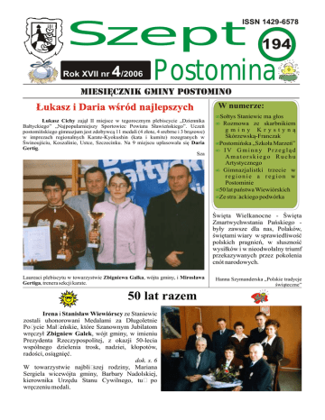 Szept Rok XVII nr 4/2006 194 Postomina Łukasz i Daria wśród najlepszych Łukasz Cichy zajął II miejsce w tegorocznym plebiscycie „Dziennika Bałtyckiego” „Najpopularniejszy Sportowiec Powiatu Sławieńskiego”. Uczeń postomińskiego gimnazjum jest zdobywcą 11 medali (4 złote, 4 srebrne i 3 brązowe) w imprezach regionalnych Karate-Kyokushin (kata i kumite) rozegranych w Świnoujściu, Koszalinie, Ustce, Szczecinku. Na 9 miejscu uplasowała się Daria Gertig. Sza W numerze: • Sołtys Staniewic ma głos • Rozmowa ze skarbnikiem gminy Krystyną Skórzewską-Franczak • Postomińska „Szkoła Marzeń” • IV Gminny Przegląd Amatorskiego Ruchu Artystycznego • Gimnazjalistki trzecie w regionie a region w Postominie • 50 lat państwa Wiewiórskich • Ze strażackiego podwórka Święta Wielkanocne - Święta Zmartwychwstania Pańskiego były zawsze dla nas, Polaków, świętami wiary w sprawiedliwość polskich pragnień, w słuszność wysiłków i w nieodwołalny triumf przekazywanych przez pokolenia cnót narodowych. Laureaci plebiscytu w towarzystwie Zbigniewa Galka, wójta gminy, i Mirosława Gertiga, trenera sekcji karate. 50 lat razem Irena i Stanisław Wiewiórscy ze Staniewic zostali uhonorowani Medalami za Długoletnie Pożycie Małżeńskie, które Szanownym Jubilatom wręczył Zbigniew Galek, wójt gminy, w imieniu Prezydenta Rzeczypospolitej, z okazji 50-lecia wspólnego dzielenia trosk, nadziei, kłopotów, radości, osiągnięć. dok. s. 6 W towarzystwie najbliższej rodziny, Mariana Sergiela wicewójta gminy, Barbary Nadolskiej, kierownika Urzędu Stanu Cywilnego, tuż po wręczeniu medali. Hanna Szymanderska „Polskie tradycje świąteczne” Postomińska szkoła podstawowa była organizatorem IV Gminnego Przeglądu Amatorskiego Ruchu Artystycznego. W dn. 18 marca br. zjechały delegacje uzdolnionej młodzieży ze wszystkich gminnych szkół wraz ze swymi opiekunami. Było co podziwiać i przeżywać radosne chwile, albowiem celem przeglądu było wyłonienie najlepszych „zawodników” i zakwalifikowanie ich do etapu powiatowego. - To wspaniale, że możemy gościć w naszym Zespole Szkół tylu znakomitych przyszłych aktorów, plastyków, muzyków czy tancerzy mówi dyrektor Halina Wenda. Chcemy docenić ich zaangażowanie i talent, i oczywiście motywować do dalszego rozwoju. W komisjach zasiadali profesjonaliści z Wojskowego Klubu Garnizonowego w Słupsku, którzy czuwali nad sprawiedliwym i obiektywnym werdyktem. Szczególne wrażenia artystyczne przeżywała licznie zgromadzona publiczność podczas występów zespołów tanecznych. Wspaniale popisały się maluszki z Jarosławca, które z gracją i wdziękiem zatańczyły poloneza i kujawiaka. Doskonały układ taneczny zaprezentowały zespoły taneczne z Postomina, a break dance w wykonaniu grupy ze Staniewic wprowadził w zachwyt młodą widownię. A oto wyniki w poszczególnych kategoriach. Przegląd zespołów tanecznych Kategoria I ( do lat 10) I miejsce Zespół Tańca „DYG II” Postomino II miejsce Zespół „Rytm” SP Jarosławiec III miejsce Zespół Taneczny SP Pieszcz Kategoria II ( do lat 15) I miejsce Zespół Tańca „ DYG I” Postomino Gimnazjum II miejsce zespół „Trzy cztery B” ze świetlicy Opiekuńczo Wychowawczej w Staniewicach Do przeglądu powiatowego zakwalifikowano zespoły: DYG I, DYG II, Zespół „Rytm”. Przegląd zespołów teatralnych I miejsce zespół teatralno kabaretowy „Kabareton” SP Korlino II miejsce Teatrzyk szkolny „Gest” SP Jarosławiec Zespoły teatralne z Pieszcza i Postomina otrzymały wyróżnienie. Do przeglądu powiatowego zakwalifikowano zespoły: „Kabareton”, „Gest”. Prezentacje prac zespołów plastycznych Kategoria I ( do 7 lat) I miejsce Bartłomiej Bogus SP Postomino II miejsce Natalia Chowaniak SP Postomino III miejsce Wiktoria Olszewska SP Postomino Kategoria II ( od 8 do 11 lat) I miejsce Klaudia Łuczak Świetlica Opiekuńczo Wychowawcza ze Staniewic II miejsce Justyna Kujawa SP Postomino 2 Szept Postomina III miejsce Natalia Kowalczyk Świetlica Opiekuńczo Wychowawcza z Pieszcza Wyróżnienie : Pamela Ordon SP Postomino Kategoria III (od 12 do 14 lat) I miejsce Dominika Cicha SP Postomino Monika Jeżewska SP Postomino II miejsce Anna Wawrzyniak Świetlica Opiekuńczo Wychowawcza ze Staniewic III miejsce Patrycja Kwiatkowska SP Postomino Wyróżnienie : Agnieszka Cicha Gimnazjum Postomino Wyróżnienie w IV kategorii ( powyżej 15 lat) Łukasz Cichy Gimnazjum Postomino Nagrodę główną zdobyła praca malarska Moniki Jeżewskiej. Do przeglądu powiatowego zakwalifikowano wszystkie nagrodzone i wyróżnione prace plastyczne. Przegląd piosenki dziecięcej Kategoria Zespoły wokalne I miejsce Zespół Piosenki i Ruchu „ Bursztynek” SP Jarosławiec II miejsce Zespół Wokalny „ Fermata” SP Postomino III miejsce Zespół wokalny „ Allegro” SP Staniewice Do przeglądu powiatowego zakwalifikowano: Zespół „Bursztynek”, Zespół „Fermata”. Kategoria soliści I miejsce Justyna Zarzycka SP Jarosławiec II miejsce Dominika Cicha SP Postomino III miejsce Marta Wiewiórska SP Staniewice Do przeglądu powiatowego zakwalifikowano : Justynę Zarzycką, Dominikę Cichą. Przegląd muzycznych zespołów estradowych i solistów Kategoria Zespoły wokalne I miejsce Zespół wokalny „Anonim” Gimnazjum Postomino Kategoria soliści, wokaliści I miejsce Marta Jeziorska - SP Postomino II miejsce Monika Cicha Agnieszka Cicha - Gimnazjum Postomino Kategoria soliści, instrumentaliści I miejsce Maksymilian Kwiatkowski - Gimnazjum Postomino II miejsce Eryk Kuśmierczyk - Gimnazjum Postomino III miejsce Marta Jeziorska - SP Postomino IV miejsce Paulina Bugowska - Gimnazjum Jarosławiec V miejsce Magdalena Wojtaś - Gimnazjum Pieszcz Do przeglądu powiatowego zakwalifikowano: Zespół wokalny „Anonim”, Martę Jeziorską, Maksymiliana Kwiatkowskiego, Eryka Kuśmierczyka. Gminny przegląd dorobku arty