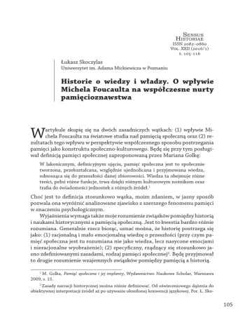 Sensus Historiae ISSN 2082–0860 Vol. XXII (2016/1) s. 105-116 Łukasz Skoczylas Uniwersytet im. Adama Mickiewicza w Poznaniu Historie o wiedzy i władzy. O wpływie Michela Foucaulta na współczesne nurty pamięcioznawstwa W artykule skupię się na dwóch zasadniczych wątkach: (1) wpływie Michela Foucaulta na światowe studia nad pamięcią społeczną oraz (2) rezultatach tego wpływu w perspektywie współczesnego sposobu postrzegania pamięci jako konstruktu społeczno-kulturowego. Będę się przy tym posługiwał definicją pamięci społecznej zaproponowaną przez Mariana Golkę: W lakonicznym, definicyjnym ujęciu, pamięć społeczna jest to społecznie tworzona, przekształcana, względnie ujednolicana i przyjmowana wiedza, odnosząca się do przeszłości danej zbiorowości. Wiedza ta obejmuje różne treści, pełni różne funkcje, trwa dzięki różnym kulturowym nośnikom oraz trafia do świadomości jednostek z różnych źródeł.1 Choć jest to definicja stosunkowo wąska, moim zdaniem, w jasny sposób pozwala ona wyróżnić analizowane zjawisko z szerszego fenomenu pamięci w znaczeniu psychologicznym. Wyjaśnienia wymaga także moje rozumienie związków pomiędzy historią i naukami historycznymi a pamięcią społeczną. Jest to kwestia bardzo różnie rozumiana. Generalnie rzecz biorąc, uznać można, że historię postrzega się jako: (1) racjonalną i mało emocjonalną wiedzę o przeszłości (przy czym pamięć społeczna jest tu rozumiana nie jako wiedza, lecz nasycone emocjami i nieracjonalne wyobrażenie); (2) specyficzny, rządzący się stosunkowo jasno zdefiniowanymi zasadami, rodzaj pamięci społecznej2. Będę przyjmował to drugie rozumienie wzajemnych związków pomiędzy pamięcią a historią. 1 M. Golka, Pamięć społeczna i jej implanty, Wydawnictwo Naukowe Scholar, Warszawa 2009, s. 15. Zasady narracji historycznej można różnie definiować. Od oświeceniowego dążenia do obiektywnej interpretacji źródeł aż po używanie określonej konwencji językowej. Por. Ł. Sko2 105 Łukasz Skoczylas Mówiąc o dziełach Foucaulta i osób czerpiących inspirację z jego tez, będę posługiwał się mianem French Theory. Jest to anglojęzyczny odpowiednik polskiego terminu f r a n c u s k a t e o r i a k u l t u r y . Używając go, chciałbym podkreślić amerykański wkład w rozpowszechnienie myśli Foucaulta i innych poststrukturalistów na całym świecie. Jest to także równoznaczne z przyjęciem, iż amerykańska perspektywa oglądu ich dzieł pozwala na lepsze zrozumienie, dlaczego — szczególnie w studiach nad pamięcią społeczną — tezy francuskich poststrukturalistów interpretowane są i wykorzystywane w dalszych analizach w konkretny sposób przez badaczy z całego niemal świata. Skłania to niektórych badaczy nawet do wyodrębniania „amerykańskiego” i „francuskiego” Foucaulta3. Jest to w końcu również pewnego rodzaju hołd dla współautorów i redaktorów książki French Theory w Polsce4, która bardzo ułatwia krytyczną analizę schedy po poststrukturalizmie. Przedstawione tutaj przemyślenia są zgodne z moim osobistym sposobem rozumienia współczesnych trendów w studiach nad pamięcią. Jest to sposób ich interpretacji, oparty na obserwacji nowych publikacji oraz kierunków przesuwania się zainteresowań badaczy w ciągu ostatnich lat. Nie roszczę sobie oczywiście prawa do wyłączności dla swojej interpretacji. Dla Ewy Domańskiej5 French Theory stała się w Polsce i USA, głównie za sprawą pism Foucaulta, narzędziem krytyki dotychczasowych paradygmatów i rozwiązań badawczych. Amerykańskie odczytanie Foucaulta skupiło się na temacie postrzegania historii jako dyskursu władzy6. Jednak wpływ tego autora na studia pamięciowe wydaje się dużo szerszy, choć — co oczywiste — trudno jednoznacznie osądzać, które z nowych trendów i kierunków wynikają bezpośrednio z przyjęcia Foucaltowskiej perspektywy, które zaś są efektem połączenia jej z innymi prądami XX-wiecznej humanistyki. Dlatego najpierw krótko scharakteryzuję te elementy dorobku Foucaulta, które uwaczylas, Pamięć społeczna miasta — jej liderzy i odbiorcy, Wydawnictwo Naukowe Scholar, Warszawa 2014, s. 20-25; A. Szpociński, Współczesne społeczeństwo polskie wobec przeszłości, [w:] Różnorodność procesów zmian. Transformacja niejedno ma imię, red. A. Szpociński, Instytut Studiów Politycznych PAN, Warszawa 2004, s. 151-175; J. Nowak, Społeczne reguły pamiętania. Antropologia pamięci zbiorowej, Nomos, Warszawa 2011, s. 34-53. Por. R. Rorty, Moralna tożsamość a prywatna autonomia: przypadek Foucaulta, [w:] „Nie pytajcie mnie, kim jestem…”. Michel Foucault dzisiaj, red. M. Kwiek, Wydawnictwo Naukowe IF UAM, Poznań 1998, s. 29. 3 E. Domańska, M. Loba (red.), French Theory w Polsce, Wydawnictwo Poznańskie, Poznań 2010. 4 5 E. Domańska, Co zrobił z nami Foucault?, [w:] French Theory w Polsce, red. E. Domańska, M. Loba, Wydawnictwo Poznańskie, Poznań 2010, s. 65. 6 106 Ibidem, s. 68. Historie o wiedzy i władzy. O wpływie Michela Foucaulta... żam za szczególnie istotne w poruszonym tutaj kontekście i których związki ze współczesnymi studiami nad pamięcią omawiam. Po pierwsze, wpływ Foucaulta na studia pamięciowe zawiera się w przewodnim motywie jego dzieł, jakim jest poszukiwanie wzajemnych związków wiedzy i władzy, procesu wytwarza znaczeń i uznawania ich za obowiązujące czy też prawdziwe. Choć w dziełach Foucaulta istnieją także inne ramy pojęciowe, komentatorzy tej jednej przyznają miano dominującej7 i nowatorskiej8. Dla Foucaulta każda wiedza jest konstruktem społecznym, możliwym do wytworzenia w określonych warunkach historycznych. Konsekwencją tak rozumianych związków pomiędzy wiedzą a władzą jest przyjęcie istnienia w różnych okresach historycznych wielu różnych prawd, na których opierały się praktyki sprawowania władzy. W t