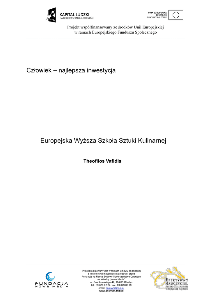 ___________________________________________________________________________ ___________________________________________________________________________ Projekt realizowany jest w ramach umowy podpisanej z Ministerstwem Edukacji Narodowej przez Fundację na Rzecz Budowy Społeczeństwa Opartego na Wiedzy „Nowe Media” ul. Sosnkowskiego 47, 10-693 Olsztyn tel.: 89 679 02 22, fax.: 89 679 06 79 email: [email protected] www.enskwm.fnm.pl ___________________________________________________________________________ Program szkoleniowy zapewnia wykwalifikowanie Szefa Kuchni na europejskim poziomie. Kursy odbywają się w nowoczesnych salach wykładowych z zapleczem szkoleniowym odpowiadającym najwyższym standardom. Wykładowcami są uznani najlepsi Mistrzowie Sztuki Kulinarnej, a szkolenia wspomagane są profesjonalnymi materiałami dydaktycznymi, by zapewnić maksymalne efekty nauczania. Szkolenie trwa 6 miesięcy. Rozpoczyna się w listopadzie każdego roku. Zjazdy odbywają się dwa razy w tygodniu. Szef Kuchni: ■ Układa Menu ■ Nadzoruje wydawanie posiłków ■ Organizuje przygotowanie posiłków ■ Dba o artystyczną oprawę i prezentację potraw ■ Jest odpowiedzialny za jakość posiłków i higienę kuchni ■ Koordynuje i organizuje pracę personelu kuchni Zakres tematyczny wykładów: ■ Sztuka Kulinarna ■ Historia gotowania i żywienia ■ Elementy cukiernictwa i piekarnictwa ■ Tradycyjna kuchnia grecka ■ Specjalności kuchni międzynarodowej ■ Dekorowane dań ■ Rozbiórka i porcjowanie mięsa ■ Zasady teorii ekonomii ■ Organizacja, wyposażenie i aranżacja kuchni ■ Technologia żywienia ■ Higiena ■ Dietetyka – zasady zdrowego odżywiania ■ Organizacja i prowadzenie Restauracji ■ Catering ■ Układanie Menu ■ Zarządzanie personelem ■ Kontrola zakupów ■ Enologia ■ Kosztorys ■ Słownictwo branżowe (język angielski i francuski) ___________________________________________________________________________ Projekt realizowany jest w ramach umowy podpisanej z Ministerstwem Edukacji Narodowej przez Fundację na Rzecz Budowy Społeczeństwa Opartego na Wiedzy „Nowe Media” ul. Sosnkowskiego 47, 10-693 Olsztyn tel.: 89 679 02 22, fax.: 89 679 06 79 email: [email protected] www.enskwm.fnm.pl ___________________________________________________________________________ Absolwenci szkolenia mogą być zatrudnieni: ■ W hotelarstwie ■ W gastronomii (placówki zbiorowego żywienia różnego typu) ■ W firmach cateringowych ■ Na statkach rejsowych ■ W kasynie ■ W instytucjach publicznych ■ Szpitalach ■ W tworzeniu prywatnej działalności gastronomicznej i cateringowej Tematy objęte szkoleniem: ■ Food Styling ■ Fashion & gourmet cuisine ■ Trendy etniczne ■ Kreowanie nowych potraw ■ Kuchnia śródziemnomorska Zajęcia praktyczne mają zasadnicze znaczenie w nabywaniu umiejętności uczestników szkolenia oraz wpływ na przyszłe osiągnięcia absolwentów. Są jakby „przedsionkiem” działalności zawodowej. Biuro Kariery Zawodowej jest odpowiedzialne za organizację i koordynowanie płatnych staży dla studentów oraz gwarantuje zatrudnienie po zakończeniu studiów. Prawo do uczestniczenia w zajęciach praktycznych posiada każdy student po ukończeniu każdego roku studiów. Odsetek studentów korzystających z praktyk wynosi 95%. Student po ukończeniu praktyk szkoleniowych: ■ Nabiera orientacji w miejscu pracy ■ Wprowadza w czyn nabytą wiedzę ■ Uzyskuje doświadczenie zawodowe w swoim CV ■ Gromadzi opinie i referencje pracodawców ■ Tworzy pierwsze zawodowe kontakty z ludźmi branży gastronomicznej Dni Kariery Zawodowej Są organizowane każdego roku w ramach Programu Doskonalenia Zawodowego, który zapewnia bezpieczeństwo i sukces kariery wszystkich uczniów i absolwentów Szkoły. Za cel mają informowanie o aktualnej sytuacji na rynku Turystyki, Hotelarstwa i Gastronomii. To doskonała okazja na spotkanie porozmawianie z przedstawicielami i dyrektorami dużych firm w celu uzgodnienia warunków zatrudnienia i współpracy. ___________________________________________________________________________ Projekt realizowany jest w ramach umowy podpisanej z Ministerstwem Edukacji Narodowej przez Fundację na Rzecz Budowy Społeczeństwa Opartego na Wiedzy „Nowe Media” ul. Sosnkowskiego 47, 10-693 Olsztyn tel.: 89 679 02 22, fax.: 89 679 06 79 email: [email protected] www.enskwm.fnm.pl ___________________________________________________________________________ Profesjonalne kursy kulinarne Roczne koszty każdej specjalizacji: KUCHARSKIE 3.450 € CUKIERNICZE 3.150 € F & B MANAGEMENT 3.300 € BARMAŃSKIE 1.700 € PIEKARNICZE 1.200 € Wpisowe dla każdej specjalizacji wynosi 600€, pozostałe opłaty mogą być dokonywane w systemie ratalnym. Chef Shop Specjalistyczny sklep, w którym studenci i absolwenci mogą zaopatrzyć w profesjonalne branżowe materiały naukowe, książki oraz sprzęt najwyższej jakości. się W Grecji szkolenia praktyczne prowadzą Szefowie którzy ściśle współpracują ze Szkołą. Konsultują z wykładowcami zasób wiedzy i możliwości studentów. Wśród wykładowców spotykamy również Mistrzów Sztuki Kulinarnej z całego świata. Szkoły Gastronomiczne posiadają Sponsorów, którzy wspomagają edukację. Dostarczając darmowe próby produktów nauczają od podstaw, jak ważna jest jakość surowców w gastronomii. W Polsce edukacja w szkołach gastronomicznych wygląda inaczej, nie współpracują z uznanymi Szefami Kuchni, co jest dużym niedopatrzeniem. Wykładowcy powinni nieustannie brać udział w seminariach doszkalających, by nadążyć za drastycznymi zmianami w branży. Państwo polskie powinno bardziej wspomagać szkoły gastronomiczne za pomocą dotacji, traktując to jako inwestycję na w ciągle rozwijającą się branżę turystyczną, której gastronomia jest podstawą. Elementy gotowania powinny być zawarte w programie nauczania wczesnoszkolnego