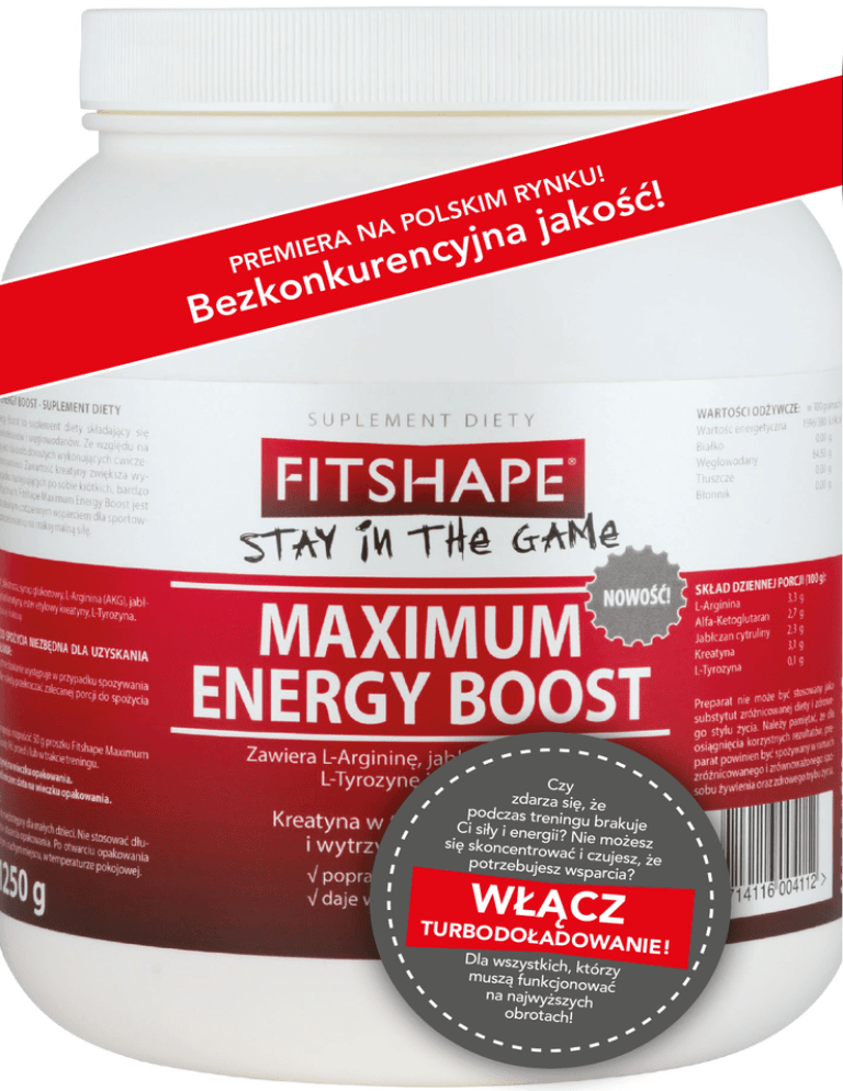 LSK A PO a n j y c ren AN IER M E R P u k n o k Bez U! ! ć ś o jak NK Y R IM Czy zdarza się, że podczas trenin Ci siły i energ gu brakuje ii? się skoncentro Nie możesz wać i czujesz, że potrzebujesz wsparcia? WŁĄCZ TURBODOŁA DOWANIE! Dla wszystkic h, kt muszą funkcjon órzy ow na najwyższyc ać h obrotach! ENERGIA W PŁYNIE Ponad 2 godziny biegu maratońskiego, ponad 90 minut meczu piłkarskiego, nawet czterogodzinne pojedynki tenisowe wymagają od sportowców niesamowitej wytrzymałości i zapewnienia organizmowi wręcz niewyczerpanego i bezpiecznego źródła energii. Wiedzą o tym wszyscy profesjonaliści, dlatego wybierają Fitshape Maximum Energy Boost, który dzięki zawartości kreatyny działa jako zastrzyk energii, pozwalający im zwiększać wydolność organizmu podczas zawodów sportowych1. Maximum Energy Boost to profesjonalna odżywka, sprawdzona i wybierana przez sportowców, teraz dostępna dla wszystkich. To produkt najwyższej jakości, czego potwierdzeniem jest certyfikat centrum antydopingowego przy Deutsche Sporthochschule w Kolonii, akredytowanego przez WADA (World Anti-Doping Agency). DLACZEGO MAXIMUM ENERGY BOOST? Fitshape Maximum Energy Boost to suplement diety składający się z mieszanki kreatyny, aminokwasów i węglowodanów. Ze względu na swój skład przeznaczony jest dla osób dorosłych, wykonujących ćwiczenia fizyczne o dużej intensywności. Zawartość kreatyny zwiększa wydolność fizyczną w przypadku następujących po sobie krótkich, bardzo intensywnych ćwiczeń fizycznych. Fitshape Maximum Energy Boost jest łatwo przyswajalny i jest idealnym codziennym wsparciem dla wszystkich aktywności, w których występuje zwiększone zapotrzebowanie na maksymalną siłę. 1) korzystne działanie występuje w przypadku spożywania 3 g kreatyny dziennie DLA KOGO MAXIMUM ENERGY BOOST? To uniwersalny produkt dla wszystkich, którzy aktywnie spędzają czas – bieganie, rower, pływanie, tenis, piłka nożna, narty, aerobik – wszystkie te aktywności są dla organizmu wyczerpujące, dlatego potrzebuje on odpowiedniego wsparcia w postaci bezpiecznego i sprawdzonego źródła energii. Sięgaj po Maximum Energy Boost zawsze, gdy wykonujesz krótkie, intensywne ćwiczenia fizyczne i czujesz, że brak Ci przysłowiowego „poweru”. Zawarta w Fitshape Maximum Energy Boost kreatyna jest jak impuls energetyczny, który postawi Cię na nogi i pozwoli cieszyć się dyscypliną, którą uprawiasz. Z Fitshape Maximum Energy Boost możesz cieszyć się zdrową energią życiową każdego dnia. MAXIMUM ENERGY BOOST – ZALECANA PORCJA DO SPOŻYCIA NIEZBĘDNA DLA UZYSKANIA KORZYSTNEGO DZIAŁANIA Zaleca się spożycie dwóch napojów dziennie. Korzystne działanie występuje w przypadku spożywania 3 g kreatyny dziennie. Nie należy przekraczać zalecanej porcji do spożycia w ciągu dnia. SPOSÓB UŻYCIA Rozpuścić 50 g proszku Fitshape Maximum Energy Boost w 500 ml wody. Pić przed i/lub w trakcie treningu. ZAWARTOŚĆ W PORCJI DZIENNEJ W jednej Jednostka porcji dziennej produktu (100 g) Wartości odżywcze: Wartość energetyczna 1596/380 kJ/kcal Białko Węglowodany 0 g 84,5 g Tłuszcze 0 g Błonnik 0 g Skład zalecanej porcji dziennej: L-Arginina 3,3 mg Alfa-Ketoglutaran 2,7 mg Jabłczan cytruliny 2,3 mg Kreatyna 3,1 mg L-Tyrozyna 0,1 mg SKŁADNIKI palatinose® izomaltuloza*, dekstroza, syrop glukozowy, L-Arginina (AKG), jabłczan L-cytruliny, monohydrat kreatyny, ester etylowy kreatyny, L-Tyrozyna. * Izomaltuloza jest źródłem glukozy i fruktozy. Preparat nie może być stosowany jako substytut zróżnicowanej diety i zdrowego stylu życia. Należy pamiętać, że dla osiągnięcia korzystnych rezultatów, preparat powinien być spożywany w ramach zróżnicowanego i zrównoważonego sposobu żywienia oraz zdrowego trybu życia. Przechowywać w sposób niedostępny dla małych dzieci. Czy wiesz, że... na 16 milionów Holendrów aż ponad 4 miliony osób jest zapisanych do klubów sportowych i jest na co dzień aktywnych fizycznie? FITSHAPE TO NAJWIĘKSZY HOLENDERSKI PRODUCENT WYSOKIEJ JAKOŚCI SUPLEMENTÓW DIETY DLA SPORTOWCÓW ZAWODOWYCH ORAZ OSÓB AKTYWNYCH FIZYCZNIE. Twórcą Fitshape jest Tshen La Ling – kiedyś wybitny piłkarz holenderski, a dziś właściciel jednej z europejskich drużyn piłkarskich i twórca indywidualnych programów dietetycznych dla sportowców z pierwszych stron gazet. To jeden z pionierów profesjonalnej suplementacji sportowców. Jako piłkarz, który przez wiele lat aktywnie uprawiał tę dyscyplinę sportu, wie doskonale na jakie obciążenia narażony jest organizm sportowca. Jego celem było stworzenie skutecznych odżywek i suplementów, które bezpiecznie będą wspomagać organizm podczas wysiłku i regeneracji. Holendrzy to potęga sportowa – wystarczy wspomnieć sukcesy piłkarskiej drużyny narodowej, olimpijskie zło- ta w hokeju na trawie, kilkanaście złotych medali olimpijskich w łyżwiarstwie szybkim, czy światowe sukcesy w sportach walki, w tym K-1. Rafael van der Vaart – wielka gwiazda holenderskiej drużyny piłkarskiej oraz były pomocnik Realu Madryt, Ajaxu Amsterdam, a dziś Hamburgera SV, tak mówi o odżywkach Fitshape, które stosuje regularnie: „Korzystam z produktów Fitshape, które pomagają mi w regeneracji po bardzo dużym wysiłku.” SPRAWDŹ TAKŻE INNE PRODUKTY FITSHAPE, M.IN.: POWER & HERSTEL Moc białka. MEGA MASSA 16000i Więcej mięśni. Kreatyna w czystej postaci. Szybko przyswajalne białko. Dla wszystkich prowadzących aktywny tryb życia. Najlepsze wsparcie organizmu w budowaniu sportowej sylwetki. Polecany osobom uprawiającym sporty wytrzymałościowe. Dla osób wykonujących intensywne ćwiczenia fizyczne. Dla budujących masę mięśniową i nie tylko. 1200 g 750 g 1200/2500 g 500 g 1000/2000 g Więcej energii. EIWIT 85i CREATINE MONOHYDRAAT GENERALNY DYSTRYBUTOR W POLSCE FITSHAPE POLSKA Sp. z o.o., ul. Łazienkowska 6A, 00-449 Warszawa www.fitshape.pl WE