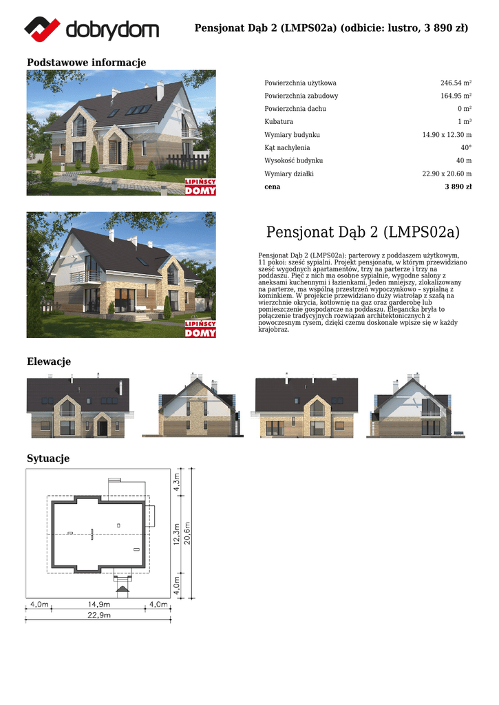 Pensjonat Dąb 2 (LMPS02a) (odbicie: lustro, 3 890 zł) Podstawowe informacje Powierzchnia użytkowa 246.54 m² Powierzchnia zabudowy 164.95 m² Powierzchnia dachu Kubatura Wymiary budynku 0 m² 1 m³ 14.90 x 12.30 m Kąt nachylenia Wysokość budynku Wymiary działki cena 40° 40 m 22.90 x 20.60 m 3 890 zł Pensjonat Dąb 2 (LMPS02a) Pensjonat Dąb 2 (LMPS02a): parterowy z poddaszem użytkowym, 11 pokoi: sześć sypialni. Projekt pensjonatu, w którym przewidziano sześć wygodnych apartamentów, trzy na parterze i trzy na poddaszu. Pięć z nich ma osobne sypialnie, wygodne salony z aneksami kuchennymi i łazienkami. Jeden mniejszy, zlokalizowany na parterze, ma wspólną przestrzeń wypoczynkowo – sypialną z kominkiem. W projekcie przewidziano duży wiatrołap z szafą na wierzchnie okrycia, kotłownię na gaz oraz garderobę lub pomieszczenie gospodarcze na poddaszu. Elegancka bryła to połączenie tradycyjnych rozwiązań architektonicznych z nowoczesnym rysem, dzięki czemu doskonale wpisze się w każdy krajobraz. Elewacje Sytuacje Pensjonat Dąb 2 (LMPS02a) (odbicie: lustro, 3 890 zł) Rzuty Parter 128.18 m² Podest 2.79 m² Pokój, aneks kuchenny 4.47 m² Pokój 4.57 m² Łazienka 20.01 m² Łazienka 9.92 m² Pokój, aneks kuchenny 2.92 m² Pokój 17.34 m² Taras 6.58 m² Wiatrołap 15.81 m² Komunikacja 3.70 m² Hall 3.88 m² C.o. 4.64 m² Aneks kuchenny 21.88 m² Łazienka 20.01 m² Pokój 9.92 m² Poddasze 134.16 m² Komunikacja 9.96 m² Łazienka 4.57 m² Pokój 8.30 m² Pokój, aneks kuchenny 18.31 m² Schody 7.29 m² Balkon 4.75 m² Pom.gosp. 5.62 m² Pokój 8.39 m² Łazienka 3.94 m² Komunikacja 3.56 m² Pokój, aneks kuchenny 17.45 m² Pokój, aneks kuchenny 18.31 m² Pokój 8.30 m² Łazienka 4.36 m²