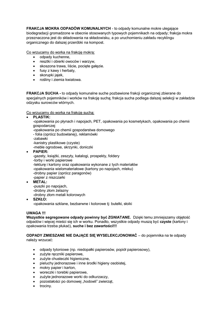 FRAKCJA MOKRA ODPADÓW KOMUNALNYCH - to odpady komunalne mokre ulegające biodegradacji gromadzone w obecnie stosowanych typowych pojemnikach na odpady; frakcja mokra przeznaczona jest do składowania na składowisku, a po uruchomieniu zakładu recyklingu organicznego do dalszej przeróbki na kompost. Co wrzucamy do worka na frakcję mokrą:  odpady kuchenne,  resztki i obierki owoców i warzyw,  skoszona trawa, liście, pocięte gałęzie.  fusy z kawy i herbaty,  skorupki jajek,  rośliny i ziemia kwiatowa. FRAKCJA SUCHA - to odpady komunalne suche pozbawione frakcji organicznej zbierane do specjalnych pojemników i worków na frakcję suchą; frakcja sucha podlega dalszej selekcji w zakładzie odzysku surowców wtórnych. Co wrzucamy do worka na frakcję suchą:  PLASTIK: -opakowania po płynach i napojach, PET, opakowania po kosmetykach, opakowania po chemii gospodarczej -opakowania po chemii gospodarstwa domowego - folia (oprócz budowlanej), reklamówki -zabawki -kanistry plastikowe (czyste) -meble ogrodowe, skrzynki, doniczki  PAPIER: -gazety, książki, zeszyty, katalogi, prospekty, foldery -torby i worki papierowe -tekturę i kartony oraz opakowania wykonane z tych materiałów -opakowania wielomateriałowe (kartony po napojach, mleku) -drobny papier (oprócz paragonów) -papier z niszczarki  METAL: -puszki po napojach, -drobny złom żelazny -drobny złom metali kolorowych  SZKŁO: -opakowania szklane, bezbarwne i kolorowe tj: butelki, słoiki UWAGA !!! Wszystkie segregowane odpady powinny być ZGNIATANE. Dzięki temu zmniejszamy objętość odpadów i więcej mieści się ich w worku. Ponadto, wszystkie odpady muszą być czyste (kartony i opakowania trzeba płukać), suche i bez zawartości!!! ODPADY ZMIESZANE NIE DAJĄCE SIĘ WYSELEKCJONOWAĆ – do pojemnika na te odpady należy wrzucać:          odpady tytoniowe (np. niedopałki papierosów, popiół papierosowy), zużyte ręczniki papierowe, zużyte chusteczki higieniczne, pieluchy jednorazowe i inne środki higieny osobistej, mokry papier i karton, woreczki i torebki papierowe, zużyte jednorazowe worki do odkurzaczy, pozostałości po domowej „hodowli” zwierząt, trociny.