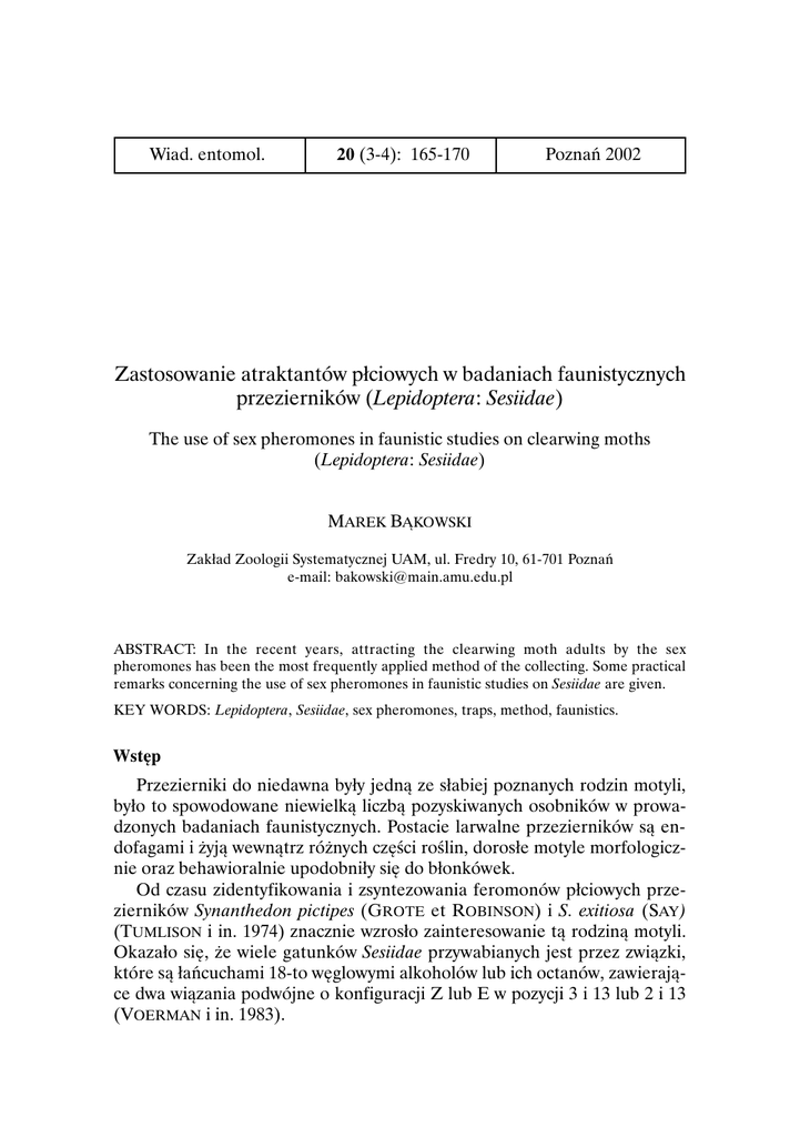 Wiad. entomol. 20 (3-4): 165-170 Poznań 2002 Zastosowanie atraktantów płciowych w badaniach faunistycznych przezierników (Lepidoptera: Sesiidae) The use of sex pheromones in faunistic studies on clearwing moths (Lepidoptera: Sesiidae) MAREK BĄKOWSKI Zakład Zoologii Systematycznej UAM, ul. Fredry 10, 61-701 Poznań e-mail: [email protected] ABSTRACT: In the recent years, attracting the clearwing moth adults by the sex pheromones has been the most frequently applied method of the collecting. Some practical remarks concerning the use of sex pheromones in faunistic studies on Sesiidae are given. KEY WORDS: Lepidoptera, Sesiidae, sex pheromones, traps, method, faunistics. Wstęp Przezierniki do niedawna były jedną ze słabiej poznanych rodzin motyli, było to spowodowane niewielką liczbą pozyskiwanych osobników w prowadzonych badaniach faunistycznych. Postacie larwalne przezierników są endofagami i żyją wewnątrz różnych części roślin, dorosłe motyle morfologicznie oraz behawioralnie upodobniły się do błonkówek. Od czasu zidentyfikowania i zsyntezowania feromonów płciowych przezierników Synanthedon pictipes (GROTE et ROBINSON) i S. exitiosa (SAY) (TUMLISON i in. 1974) znacznie wzrosło zainteresowanie tą rodziną motyli. Okazało się, że wiele gatunków Sesiidae przywabianych jest przez związki, które są łańcuchami 18-to węglowymi alkoholów lub ich octanów, zawierające dwa wiązania podwójne o konfiguracji Z lub E w pozycji 3 i 13 lub 2 i 13 (VOERMAN i in. 1983). 166 M. BĄKOWSKI W badaniach faunistycznych Sesiidae prowadzonych w Europie najczęściej używane są związki, wyprodukowane w Research Institute for Plant Protection (IPO-DLO) (Wageningen, Holandia). Są to atraktanty opracowane dla sześciu gatunków przezierników: Sesia apiformis CL. (api) , Paranthrene tabaniformis ROTT. (tab), Pennisetia hylaeiformis LASP . (hyl), Synanthedon tipuliformis CL . (tip), S. vespiformis L. (vesp) i S.myopaeformis BKH . (myop). Związki te zawierają, wybrane komponenty chemiczne feromonów przezierników, które eksponowane w dużym stężeniu, mogą oddziaływać na różne gatunki Sesiidae, należące nawet do różnych rodzajów. W tabeli przedstawiono zakres reakcji krajowych gatunków przezierników na poszczególne feromony. Dane te bazują na informacjach literaturowych (VOERMAN i in. 1983, 1984; P RIESNER i in. 1986a, 1986b; ARN i in. 1992; PROLA, BEER 1994; HECQ 1994, 1995; SOBCZYK 1995, 1997; PÜHRINGER 1996, 1997; BĄKOWSKI 1998) oraz na niepublikowanych obserwacjach autora. Pułapki feromonowe W badaniach Sesiidae stosuje się feromonowe pułapki lepne lub lejkowate. W trakcie badań faunistycznych Sesiidae, prowadzonych w różnych częściach kraju, autor stosował pułapki trapezowe typu PL–1 z wymiennymi wkładami lepnymi. Pułapki tego rodzaju w swojej konstrukcji nawiązują do powszechnie stosowanych pułapek delta traps (HOWSE i in. 1998). W pułapkach tych feromon wieszamy w środku, w jej części szczytowej. Na wewnętrznej spodniej stronie pułapki znajduje się powierzchnia, którą stanowi wymienialny wkład lepny, bądź rozłożony równomiernie klej. Najczęściej stosuje się lep produkcji Tanglefoot (USA). Rzadziej używa się różnego rodzaju pułapki lejkowate typu funnel traps (HOWSE i in. 1998), ich odpowiednikiem krajowym są lejkowate pułapki IBL–1. Autor wystawiał je zazwyczaj łącznie z syntetycznym pyretroidem. Pułapka lepna PL–1 i pułapka lejkowata IBL–1 są powszechnie stosowane w leśnictwie i ogrodnictwie przy odławianiu motyli, dlatego schemat ich konstrukcji nie został tu przedstawiony. Oba wspomniane typy pułapek, jak również wkłady lepne są produkowane przez Z. D. Chemipan (Warszawa). Dotychczasowe obserwacje autora oraz informacje podawane w literaturze wskazują, że pułapki lepne w badaniach faunistycznych są zdecydowanie bardziej efektywne niż pułapki lejkowate. Wynika to najprawdopodobniej z łatwiejszego dostępu motyla do dyspensera w przypadku pułapki lepnej. Z drugiej strony zaobserwowano że, przywabione samce znacznie łatwiej przylepiają się do lepu niż wpadają do worka lub pojemnika poniżej lejka pułapki IBL–1. ZASTOSOWANIE ATRAKTANTÓW PŁCIOWYCH W BADANIACH [...] 167 Jednym z ważniejszych czynników, mających wpływ na liczbę przywabionych motyli jest ekspozycja atraktantu. W zależności od badanego gatunku przeziernika i biotopu, pułapki rozwiesza się na wysokości od 0,2 do 2,5 metra. Dla obserwacji dobrze latających gatunków ksylofagicznych z rodzaju Synanthedon, Pennisetia i Paranthrene pułapki wiesza się z reguły na wysokości od 1,5 do 2,5 metra. W pewnych przypadkach jak przy odłowie Paranthrene insolita LE CERF lub Synanthedon loranthi KR. pułapki powinny być zawieszone w koronach drzew na wysokości powyżej 10 metrów (SOBCZYK 1995, 1996). Obserwując gatunki ryzofagiczne z rodzaju Chamaesphecia, Synansphecia i Bembecia pułapki umieszcza się zazwyczaj wśród roślin żywicielskich tych motyli na wysokości od 0,2 do metra. Dyspenser powinno się umieszczać w miejscach nasłonecznionych, na pojedynczych drzewach, na brzegu lasu, zarośli lub na szczycie roślin zielnych, w takich miejscach, aby wolna przestrzeń wokół pułapki umożliwiała swobodny lot motyli. Pułapki sprawdza się w zależności od warunków pogodowych panujących w trakcie przeprowadzania testu. W sprzyjających warunkach, to znaczy w dni słoneczne i przy temperaturze powietrza powyżej 25 °C, pułapki można zdejmować już po 24 godzinach od czasu jej wystawienia. Bezpośrednie obserwacje przezierników zwabionych do atraktantów wystawionych w terenie Pułapki feromonowe znajdują zastosowanie gdy chcemy odławiać samce przezierników w różnych biotopach w tym samym czasie. Należy jednak pamiętać, że tylko część osobników wpada do pułapek, a wiele gatunków, szczególnie z grupy ryzofagów sporadycznie łapie się w pułapki. Z powyższych wzglę
