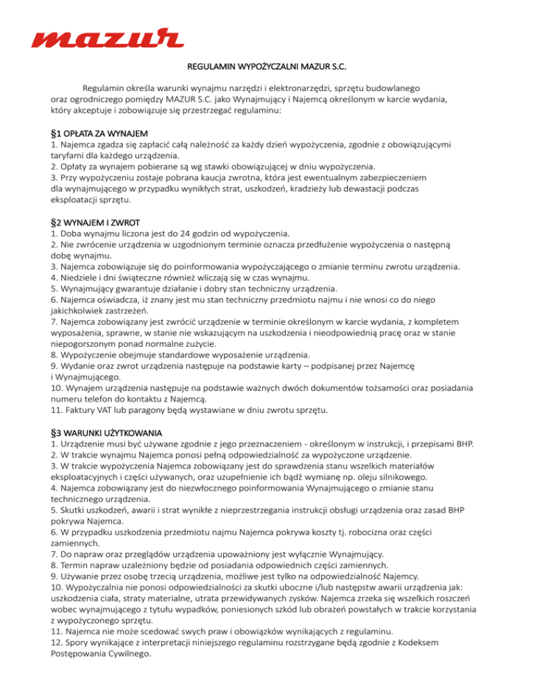 REGULAMIN WYPOŻYCZALNI MAZUR S.C. Regulamin określa warunki wynajmu narzędzi i elektronarzędzi, sprzętu budowlanego oraz ogrodniczego pomiędzy MAZUR S.C. jako Wynajmujący i Najemcą określonym w karcie wydania, który akceptuje i zobowiązuje się przestrzegać regulaminu: §1 OPŁATA ZA WYNAJEM 1. Najemca zgadza się zapłacić całą należność za każdy dzień wypożyczenia, zgodnie z obowiązującymi taryfami dla każdego urządzenia. 2. Opłaty za wynajem pobierane są wg stawki obowiązującej w dniu wypożyczenia. 3. Przy wypożyczeniu zostaje pobrana kaucja zwrotna, która jest ewentualnym zabezpieczeniem dla wynajmującego w przypadku wynikłych strat, uszkodzeń, kradzieży lub dewastacji podczas eksploatacji sprzętu. §2 WYNAJEM I ZWROT 1. Doba wynajmu liczona jest do 24 godzin od wypożyczenia. 2. Nie zwrócenie urządzenia w uzgodnionym terminie oznacza przedłużenie wypożyczenia o następną dobę wynajmu. 3. Najemca zobowiązuje się do poinformowania wypożyczającego o zmianie terminu zwrotu urządzenia. 4. Niedziele i dni świąteczne również wliczają się w czas wynajmu. 5. Wynajmujący gwarantuje działanie i dobry stan techniczny urządzenia. 6. Najemca oświadcza, iż znany jest mu stan techniczny przedmiotu najmu i nie wnosi co do niego jakichkolwiek zastrzeżeń. 7. Najemca zobowiązany jest zwrócić urządzenie w terminie określonym w karcie wydania, z kompletem wyposażenia, sprawne, w stanie nie wskazującym na uszkodzenia i nieodpowiednią pracę oraz w stanie niepogorszonym ponad normalne zużycie. 8. Wypożyczenie obejmuje standardowe wyposażenie urządzenia. 9. Wydanie oraz zwrot urządzenia następuje na podstawie karty – podpisanej przez Najemcę i Wynajmującego. 10. Wynajem urządzenia następuje na podstawie ważnych dwóch dokumentów tożsamości oraz posiadania numeru telefon do kontaktu z Najemcą. 11. Faktury VAT lub paragony będą wystawiane w dniu zwrotu sprzętu. §3 WARUNKI UŻYTKOWANIA 1. Urządzenie musi być używane zgodnie z jego przeznaczeniem - określonym w instrukcji, i przepisami BHP. 2. W trakcie wynajmu Najemca ponosi pełną odpowiedzialność za wypożyczone urządzenie. 3. W trakcie wypożyczenia Najemca zobowiązany jest do sprawdzenia stanu wszelkich materiałów eksploatacyjnych i części używanych, oraz uzupełnienie ich bądź wymianę np. oleju silnikowego. 4. Najemca zobowiązany jest do niezwłocznego poinformowania Wynajmującego o zmianie stanu technicznego urządzenia. 5. Skutki uszkodzeń, awarii i strat wynikłe z nieprzestrzegania instrukcji obsługi urządzenia oraz zasad BHP pokrywa Najemca. 6. W przypadku uszkodzenia przedmiotu najmu Najemca pokrywa koszty tj. robocizna oraz części zamiennych. 7. Do napraw oraz przeglądów urządzenia upoważniony jest wyłącznie Wynajmujący. 8. Termin napraw uzależniony będzie od posiadania odpowiednich części zamiennych. 9. Używanie przez osobę trzecią urządzenia, możliwe jest tylko na odpowiedzialność Najemcy. 10. Wypożyczalnia nie ponosi odpowiedzialności za skutki uboczne i/lub następstw awarii urządzenia jak: uszkodzenia ciała, straty materialne, utrata przewidywanych zysków. Najemca zrzeka się wszelkich roszczeń wobec wynajmującego z tytułu wypadków, poniesionych szkód lub obrażeń powstałych w trakcie korzystania z wypożyczonego sprzętu. 11. Najemca nie może scedować swych praw i obowiązków wynikających z regulaminu. 12. Spory wynikające z interpretacji niniejszego regulaminu rozstrzygane będą zgodnie z Kodeksem Postępowania Cywilnego.