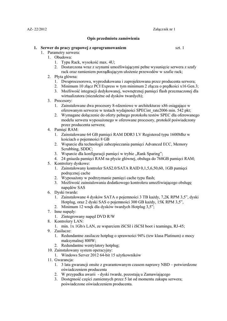 AZ- 22/2012 Załącz nik nr 1 Opis przedmiotu zamówienia 1. Serwer do pracy grupowej z oprogramowaniem szt. 1 1. Parametry serwera: 1. Obudowa: 1. Typu Rack, wysokość max. 4U; 2. Dostarczona wraz z szynami umożliwiającymi pełne wysunięcie serwera z szafy rack oraz ramieniem porządkującym ułożenie przewodów w szafie rack; 2. Płyta główna: 1. Dwuprocesorowa, wyprodukowana i zaprojektowana przez producenta serwera; 2. Minimum 10 złącz PCI Express w tym minimum 2 złącza o prędkości x16 Gen.3; 3. Możliwość integracji dedykowanej, wewnętrznej pamięci flash przeznaczonej dla wirtualizatora (niezależne od dysków twardych); 3. Procesory: 1. Zainstalowane dwa procesory 8-rdzeniowe w architekturze x86 osiągające w oferowanym serwerze w testach wydajności SPECint_rate2006 min. 542 pkt; 2. Wymagane dołączenie do oferty pełnego protokołu testów SPEC dla oferowanego modelu serwera wyposażonego w oferowane procesory, protokół poświadczony przez producenta serwera; 4. Pamięć RAM: 1. Zainstalowane 64 GB pamięci RAM DDR3 LV Registered typu 1600Mhz w kościach o pojemności 8 GB 2. Wsparcie dla technologii zabezpieczania pamięci Advanced ECC, Memory Scrubbing, SDDC; 3. Wsparcie dla konfiguracji pamięci w trybie „Rank Sparing”; 4. 24 gniazda pamięci RAM na płycie głównej, obsługa do 768GB pamięci RAM; 5. Kontrolery dyskowe: 1. Zainstalowany kontroler SAS2.0/SATA RAID 0,1,5,6,50,60, 1GB pamięci podręcznej cache 2. Wyposażony w podtrzymanie pamięci cache typu flash; 3. Możliwość zainstalowania dodatkowego kontrolera umożliwiającego obsługę napędów SAS 6. Dyski twarde: 1. Zainstalowane 4 dysków SATA o pojemności 3 TB każdy, 7,2K RPM 3,5”, dyski Hotplug, oraz 2 dyski SAS o pojemności 300 GB każdy, 15K RPM 3,5”, 2. Minimum 12 wnęk dla dysków twardych Hotplug 3,5”; 7. Inne napędy: 1. Zintegrowany napęd DVD R/W 8. Kontrolery LAN: 1. min. 1x 1Gb/s LAN, ze wsparciem iSCSI i iSCSI boot i teamingu, RJ-45; 9. Zasilacze: 1. Redundantne zasilacze hotplug o sprawności 94% (tzw klasa Platinum) o mocy maksymalnej 800W; 2. Redundantne wentylatory hotplug; 10. Zainstalowany system operacyjny: 1. Windows Server 2012 64-bit 15 użytkowników 11. Gwarancja: 1. 3 lata gwarancji onsite z gwarantowanym czasem naprawy NBD – potwierdzone oświadczeniem producenta 2. W przypadku awarii - dyski twarde, pozostają u Zamawiającego 3. Dostępność części zamiennych przez 5 lat od momentu zakupu serwera; poświadczone oświadczeniem producenta. 2. Przełącznik sieciowy 1. Typ przełącznika: HP A5120-24G JE066A szt. 3 2. Dostawca może zaproponować sprzęt równoważny o nie gorszych parametrach 3. Warunki gwarancji: min. 5 lat 4. Parametry techniczne sprzętu równoważnego: 1. Kompatybilność programowa i sprzętowa z przełącznikami sieciowymi firmy 3Com oraz Hewlett-Packard pracującymi w sieci komputerowej Muzeum Narodowego w Poznaniu 2. Przełącznik zarządzalny pracujący w warstwie 3 3. 24 porty RJ45 10/100/1000 z automatycznym wykrywaniem szybkości 4. Dodatkowo 4 porty podwójne mogące pracować jako RJ45 10/100/1000 lub w standardzie mini-GBIC (SFP) 5. Szeregowy port konsoli RJ245 6. Przystosowany do montażu w 19 calowej szafie telekomunikacyjnej 7. Opóźnienie: max 3,5 µs (64-bajtowe pakiety FIFO) 8. Przepustowość: min. 30,0 mln p/s 9. Funkcje zarządzania: IMC – Intelligent Management Center; interfejs wiersza poleceń (CLI); Przeglądarka internetowa; zarządzanie pozapasmowe; SNMP Manager; Telnet; RMON1; FTP; IEEE 802.3 Ethernet MIB 10. Pojemność przełączania: min 45 Gb/s 11. Protokóły ogólne: IEEE 802.1ad Q-in-Q; IEEE 802.1D MAC Bridges; Priorytet IEEE 802.1p; Sieci VLAN IEEE 802.1Q; IEEE 802.1s Multiple Spanning Trees; IEEE 802.1w Rapid Reconfiguration of Spanning Tree; IEEE 802.1X PAE; 10Base-T typu IEEE 802.3; IEEE 802.3ab 1000BASE-T; IEEE 802.3ad Link Aggregation Control Protocol (LACP); IEEE 802.3ae 10-Gigabit Ethernet; IEEE 802.3af Power over Ethernet; IEEE 802.3i 10BASE-T; IEEE 802.3u 100BASE-X; IEEE 802.3x Flow Control; IEEE 802.3z 1000BASE-X; RFC 768 UDP; Protokół RFC 783 TFTP (wersja 2); RFC 791 IP; RFC 792 ICMP; RFC 793 TCP; RFC 826 ARP; RFC 854 TELNET; RFC 951 BOOTP; RFC 1213 Baza informacji o zarządzaniu sieciami opartymi na protokole TCP/IP; RFC 1305 NTPv3; Protokół RFC 1350 TFTP (wersja 2); RFC 1519 CIDR; RFC 1812 Routing IPv4; RFC 1866 Język znaczników hipertekstowych2.0; RFC 2131 DHCP; RFC 2236 Podsłuch IGMP; RFC 2616 Kompatybilność HTTP v1.1; RFC 2665 Definicje obiektów zarządzanych dla interfejsów typu Ethernet ; RFC 2668 Definicje obiektów zarządzanych dla średnich jednostek IEEE 802.3 Medium Attachment Unit (MAU) ; RFC 2865 Protokół zdalnego uwierzytelniania użytkowników korzystających z dostępu wdzwanianego (RADIUS); RFC 2866 RADIUS Accounting; RFC 3414 Model zabezpieczeń użytkownika (USM) dla wersji 3 protokołu SNMPv3; RFC 3415 Model kontroli dostępu (VACM) dla protokołu SNMP; RFC 3418 Baza informacji o zarządzaniu (MIB) dla protokołu SNMP; RFC 3576 Ext to RADIUS (tylko certyfikat autentyczności); RFC 4213 Podstawowe mechanizmy tranzytowe IPv6; RFC 4675 RADIUS VLAN i Priority; 802.1r Protokół rejestracji atrybutów zastrzeżonych GARP (GPRP) 12. Zarządzanie siecią: IEEE 802.1AB Link Layer Discovery Protocol (LLDP); RFC 1155 Struktura informacji dotyczących zarządzania; RFC 1157 SNMPv1; RFC 1448 Operacje w wersji 2 protokołu Simple Network Management Protocol (SNMPv2) ; RFC 2211 Sieć o kontrolowanym obciążeniu; RFC 2819 — cztery grupy RMON: 1 (statystyki), 2 (historia), 3 (alarmy) i 9 (zdarzenia); RFC 3176 sFlow; RFC 3411 Struktury zarządzania SNMP; RFC 3412 Przetwarzanie komunikatów SNMPv3; RFC 3414 Model zabezpieczeń w oparciu o użytkownika SNMPv3 (USM); RFC 3415 Model kontroli dostępu w oparciu o widok SNMPv3 (VACM); ANSI/TIA-1057 LLDP Media Endpoint Discovery (LLDP-MED) 13. Zasilanie 220-230V 50Hz +/- 10% 3. Konwerter światłowodowy jednomodowy