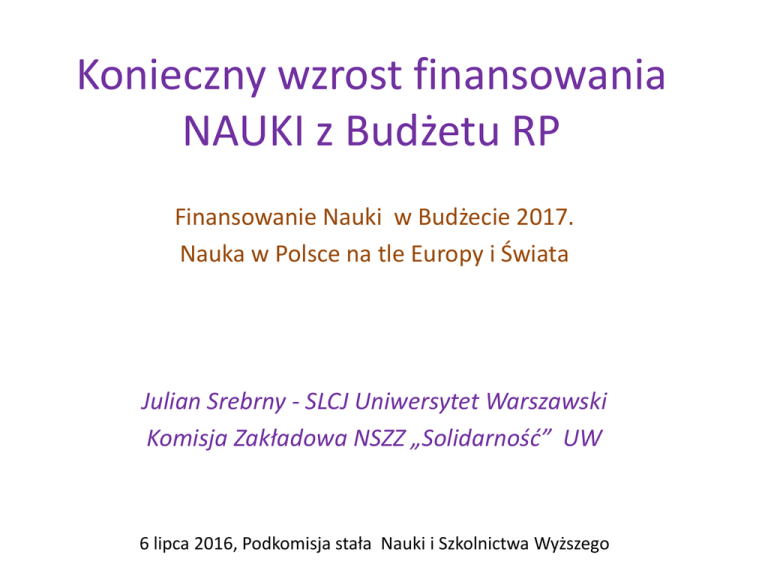 Konieczny wzrost finansowania NAUKI z Budżetu RP Finansowanie Nauki w Budżecie 2017. Nauka w Polsce na tle Europy i Świata Julian Srebrny - SLCJ Uniwersytet Warszawski Komisja Zakładowa NSZZ „Solidarność” UW 6 lipca 2016, Podkomisja stała Nauki i Szkolnictwa Wyższego 1. Konieczny jest natychmiastowy skok finansowania budżetowego badań naukowych. W każdym z lat 2016-2020 wzrost powinien wynieść co najmniej o 0,15% PKB. 2. Większość tego wzrostu powinna być przeznaczona na wzrost finansowania badań statutowych (działalności statutowej), aby w 2020 roku nastąpił wzrost 3-krotny. W drodze zwiększenia finansowania nauki należy odwrócić proporcje między finansowaniem ze źródeł strukturalnych i finansowaniem z funduszy grantowych, aby relacja ta wynosiła 80% do 20% na rzecz finansowania badań statutowych. Powyższe postulaty zyskały szerokie poparcie w środowisku naukowymi i akademickim. Narodowej Rady Rozwoju m.in. Prezes Polskiego Towarzystwa Ekonomicznego prof. Elżbiety Mączyńskiej oraz prof.. Alojzego Nowaka Wydz. Zarzadzania UW. W budżecie państwa na rok 2016 stabilnych środków( bezpośrednio z Budżetu RP) przewidziano jedynie 5,87 mld zł. Po odjęciu środków na finansowanie badań wojskowych, dołączonych tu w tym roku, zostaje 5,298 mld zl. Skoro cały planowany PKB wynosi 1888,3 mld zł, oznacza to, że na finansowanie Nauki z budżetu państwa przekazuje się jedynie 0,28 proc. PKB. Jest to najniższy poziom od ponad 30 lat. Konieczne zapewnienie stałego finansowania badań naukowych ze środków innych niż europejskie (przeznaczonych na inwestycje). Brak środków krajowych po 2020 na wykorzystanie infrastruktury - kompromitacja Polski na arenie międzynarodowej, związana z utratą szansy na prowadzenie badań naukowych na odpowiednim poziomie wskutek braku stabilnego ich finansowania. Obecnie w Polsce liczba pracowników naukowych ze stopniem co najmniej doktora, liczona jako procent populacji, należy także do najniższych w Europie – (dane z 2012 roku) - 1753 naukowców na 1 mln mieszkańców. więcej od Polski większość krajów w Europie Wschodniej, np. Słowenia Estonia – Republika Czeska Słowacja – Litwa – Węgry – Łotwa – 4397 naukowców, 3540 naukowców, 3111 naukowców, 2804 naukowców, 2649 naukowców, 2389 naukowców, 1894 naukowców. Do czołówki należą Finlandia, Islandia, Dania, Izrael – mające odpowiednio 7482, 7012, 6730, 6602 naukowców na 1 mln mieszkańców Znakomicie Polska wypada w efektywności badań naukowych w przeliczeniu na zainwestowane w badania pieniądze. Liczba patentów na 1 mln USD zainwestowanych w badania: 1. Korea Południowa - 3,7 patentu, 2. Chiny - 3,5 patentu. 3. Polska - 3.2 patentu lepszy wynik od USA. W produktywności naukowej, mierzonej liczbą publikacji, Polska plasuje się na dobrej pozycji. Nakłady przeliczone na jedna publikację naukowa wskazują na fakt, iż nasze publikacje naukowe są jedne z najtańszych na świecie Potencjał naukowy Polski, będący zapleczem dla innowacji, jest przyzwoity. „Tak więc to nie niska sprawność ludzi nauki, ale żałośnie niskie nakłady na badania decydują o mizernej pozycji Polski w rankingach innowacyjności”. PAUZA 2015 Prof. dr hab. Jerzy Wilkin Instytut Rozwoju Wsi i Rolnictwa PAN ( b. Dziekan Wydziału Nauk Ekonomicznych UW) Uwagi dotyczące finansowania Nauki w Polsce 1) Kilka lat temu, gdy udział wydatków budżetowych na Naukę w Polsce osiągnął 0,36% PKB, uznałem, że gorzej już być nie może. Okazuje się jednak, że może! Ten stan mamy obecnie (0,29% PKB), a perspektywy poprawy sytuacji bardzo mizerne (przewidywane kłopoty budżetowe w następnych latach). Spada też udział wydatków z budżetu na szkolnictwo wyższe. Ponieważ oba powyższe działy są ściśle powiązane, to sytuacja staje się dramatyczna. 2) Regres finansowania polskiej nauki (i szkolnictwa wyższego) w relacji do PKB jest zagrożeniem dla rozwoju gospodarczego, realizacji tzw. Planu Morawieckiego i ogólnie postępu cywilizacyjnego naszego kraju. 3) Przy niskim poziomie finansowania nauki zaznaczyła się dodatkowo jego niekorzystna struktura. Chodzi o udział tzw. dotacji statutowej w relacji do udziału środków na finansowanie grantów. Udział dotacji statutowej w ogólnej dotacji budżetowej na naukę nie powinien być mniejszy niż 50%, bo to zakłóca stabilność i przewidywalność działania jednostek naukowych. Udział ten jest obecnie znacznie niższy, co zagraża rozwojowi, zwłaszcza jednostek naukowych PAN. Na uczelniach dotacja dydaktyczna jest podstawą ich działania, a nie dotacja statutowa. Przeprowadzone wyliczenia wskazują, że wszystkie instytuty naukowe PAN z zakresu nauk społecznych i humanistycznych (Wydział I) czeka w kolejnych latach obniżka dotacji statutowej, a co się z tym wiąże redukcje zatrudnienia i niskie płace. Dotyczy to również najlepszych jednostek posiadających kategorię A. 4) Niedofinansowanie działalności statutowej ogranicza, a nawet uniemożliwia ubieganie się o środki unijne w programie Horyzont. 5) Brak odpowiednich środków budżetowych na naukę zagraża finansowaniu kosztów eksploatacyjnych obiektów zbudowanych w ubiegłych latach ze środków unijnych. Obiekty te w wielu przypadkach mogą być niedostatecznie wykorzystane, a ich utrzymanie rujnujące dla poszczególnych instytutów, czy innych jednostek naukowych. 6) Bardzo niskie nakłady publiczne na Naukę zniechęcają też prywatnych inwestorów w tym zakresie. Za próg finansowania nauki z funduszy publicznych zachęcający sektor prywatny do inwestycji w badania naukowe uznaje się 1% PKB. Jesteśmy bardzo daleko od tego progu. Tzw. „pchnięcie rozwojowe”, wyjście z pułapki średniego dochodu, poprawa innowacyjności i konkurencyjności polskiej gospodarki będzie w tej sytuacji niemożliwa! Jerzy Wilkin 2.07.2016 Konieczny natychmiastowy skok finansowania budżetowego Nauki. W każdym z 