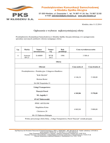 Przedsiębiorstwo Komunikacji Samochodowej w Kłodzku Spółka Akcyjna 57-300 Kłodzko, ul. Dusznicka 1, tel. 74 867 41 24, fax. 74 867 32 80 e-mail: [email protected], www.pks-klodzko.pl Kłodzko, dnia 11.12.2014 Ogłoszenie o wyborze najkorzystniejszej oferty Przedsiębiorstwo Komunikacji Samochodowej w Kłodzku Spółka Akcyjna informuje, iż w postępowaniu sprzedaży używanych autobusów złożono następujące oferty: Lp. Marka Numer inwentarzowy Numer rej. Rok produkcji Cena wywoławcza netto 1 Autosan H9-21 X-60009 WYB 2612 1996 3 500 zł Oferty Oferent Cena netto zł Cena brutto zł 4 146,34 5 100,00 4 365,86 5 370,00 4 065,04 5 000,00 Przedsiębiorstwo –Produkcyjno -Usługowo-Handlowe ”B.B-TRANS” Bożena Bester 36-106 Trzęsówka 13 Usługi Transportowe Tkaczyk Paweł Wł. Jagiełły 5 87-617 Bobrowniki PPHU ARTZŁOM Magdalena Kotas Chróstowo 28 88-133 Dąbrowa Biskupia Wobec powyższego oferta firmy „ Usługi Transportowe, Paweł Tkaczyk” została przyjęta. Sąd Rejonowy dla Wrocławia Fabrycznej IX Wydział Gospodarczy KRS nr 0000074657 NIP: 883-000-07-20 Kapitał zakładowy: 3.570.000 zł. konto bankowe: PEKAO SA 77 1240 6814 1111 0000 4938 6215 Dział Przewozów Pasażerskich, pl. Jedności 1 (dworzec autobusowy w Kłodzku) tel. 74 867 32 61 Placówka Terenowa w Nowej Rudzie, ul. Niepodległości 8 (dworzec autobusowy w Nowej Rudzie) tel. 74 872 47 26 Dworzec autobusowy w Bystrzycy Kłodzkiej, ul. Sienkiewicza 5, tel. 74 811 15 50 Przedsiębiorstwo Komunikacji Samochodowej w Kłodzku Spółka Akcyjna 57-300 Kłodzko, ul. Dusznicka 1, tel. 74 867 41 24, fax. 74 867 32 80 e-mail: [email protected], www.pks-klodzko.pl Lp. Marka Numer inwentarzowy Numer rej. Rok produkcji Cena wywoławcza netto 2 Autosan H9-21 X-91002 DKL 62X1 1995 3 500 zł Oferty Oferent Cena netto zł Cena brutto zł 4 365,86 5 370,00 4 065,04 5 000,00 Usługi Transportowe Tkaczyk Paweł Wł. Jagiełły 5 87-617 Bobrowniki PPHU ARTZŁOM Magdalena Kotas Chróstowo 28 88-133 Dąbrowa Biskupia Wobec powyższego oferta firmy „ Usługi Transportowe, Paweł Tkaczyk” została przyjęta . Sąd Rejonowy dla Wrocławia Fabrycznej IX Wydział Gospodarczy KRS nr 0000074657 NIP: 883-000-07-20 Kapitał zakładowy: 3.570.000 zł. konto bankowe: PEKAO SA 77 1240 6814 1111 0000 4938 6215 Dział Przewozów Pasażerskich, pl. Jedności 1 (dworzec autobusowy w Kłodzku) tel. 74 867 32 61 Placówka Terenowa w Nowej Rudzie, ul. Niepodległości 8 (dworzec autobusowy w Nowej Rudzie) tel. 74 872 47 26 Dworzec autobusowy w Bystrzycy Kłodzkiej, ul. Sienkiewicza 5, tel. 74 811 15 50 Przedsiębiorstwo Komunikacji Samochodowej w Kłodzku Spółka Akcyjna 57-300 Kłodzko, ul. Dusznicka 1, tel. 74 867 41 24, fax. 74 867 32 80 e-mail: [email protected], www.pks-klodzko.pl Lp. Marka Numer inwentarzowy Numer rej. Rok produkcji Cena wywoławcza netto 3 Autosan H10-10.02 x-91010 DKL 6FX5 1999 3 600 zł Oferty Oferent Cena netto zł Cena brutto zł 4 447,15 5 470,00 4 471,54 5 500,00 Usługi Transportowe Tkaczyk Paweł Wł. Jagiełły 5 87-617 Bobrowniki PPHU ARTZŁOM Magdalena Kotas Chróstowo 28 88-133 Dąbrowa Biskupia Wobec powyższego oferta firmy „PPHU ARTZŁOM Magdalena Kotas” została przyjęta. Sąd Rejonowy dla Wrocławia Fabrycznej IX Wydział Gospodarczy KRS nr 0000074657 NIP: 883-000-07-20 Kapitał zakładowy: 3.570.000 zł. konto bankowe: PEKAO SA 77 1240 6814 1111 0000 4938 6215 Dział Przewozów Pasażerskich, pl. Jedności 1 (dworzec autobusowy w Kłodzku) tel. 74 867 32 61 Placówka Terenowa w Nowej Rudzie, ul. Niepodległości 8 (dworzec autobusowy w Nowej Rudzie) tel. 74 872 47 26 Dworzec autobusowy w Bystrzycy Kłodzkiej, ul. Sienkiewicza 5, tel. 74 811 15 50 Przedsiębiorstwo Komunikacji Samochodowej w Kłodzku Spółka Akcyjna 57-300 Kłodzko, ul. Dusznicka 1, tel. 74 867 41 24, fax. 74 867 32 80 e-mail: [email protected], www.pks-klodzko.pl Lp. Marka Numer inwentarzowy Numer rej. Rok produkcji Cena wywoławcza netto 4 Man UEL292 X-61008 DKL 8AF7 1993 4 000 zł Oferty Oferent Cena netto zł Cena brutto zł Usługi Transportowe 5 398,37 6 640,00 4 552,84 5 600,00 Tkaczyk Paweł Wł. Jagiełły 5 87-617 Bobrowniki PPHU ARTZŁOM Magdalena Kotas Chróstowo 28 88-133 Dąbrowa Biskupia Wobec powyższego oferta firmy „ Usługi Transportowe, Paweł Tkaczyk” została przyjęta Sąd Rejonowy dla Wrocławia Fabrycznej IX Wydział Gospodarczy KRS nr 0000074657 NIP: 883-000-07-20 Kapitał zakładowy: 3.570.000 zł. konto bankowe: PEKAO SA 77 1240 6814 1111 0000 4938 6215 Dział Przewozów Pasażerskich, pl. Jedności 1 (dworzec autobusowy w Kłodzku) tel. 74 867 32 61 Placówka Terenowa w Nowej Rudzie, ul. Niepodległości 8 (dworzec autobusowy w Nowej Rudzie) tel. 74 872 47 26 Dworzec autobusowy w Bystrzycy Kłodzkiej, ul. Sienkiewicza 5, tel. 74 811 15 50 Przedsiębiorstwo Komunikacji Samochodowej w Kłodzku Spółka Akcyjna 57-300 Kłodzko, ul. Dusznicka 1, tel. 74 867 41 24, fax. 74 867 32 80 e-mail: [email protected], www.pks-klodzko.pl Lp. Marka Numer inwentarzowy Numer rej. Rok produkcji Cena wywoławcza netto 5 Man ULE 242 x-61011 DKL 2CH3 1992 5 000 zł Oferty Oferent Cena netto zł Cena brutto zł 4 634,15 5 700,00 5 010,00 6 162,30 5 479,68 6 740,00 4 552,84 5 600,00 Przedsiębiorstwo –Produkcyjno -Usługowo-Handlowe ”B.B-TRANS” Bożena Bester 36-106 Trzęsówka 13 PKS w Nysie Sp. zo.o. Ul. Piłsudskiego 41 48-303 Nysa Usługi Transportowe Tkaczyk Paweł Wł. Jagiełły 5 87-617 Bobrowniki PPHU ARTZŁOM Magdalena Kotas Chróstowo 28 88-133 Dąbrowa Biskupia Wobec powyższego oferta firmy „ Usługi Transportowe, Paweł Tkaczyk” została przyjęta. Sąd Rejonowy dla Wrocławia Fabrycznej IX Wydział Gospodarczy KRS nr 0000074657 NIP: 883-000-07-20 Kapitał zakładowy: 3.570.000 zł. konto bankowe: PEKAO SA 77 1240 6814 1111 0000 4938 6215 Dział Przewozów Pasażerskich, pl. Jedności 1 (dworzec autobusowy w Kłodzku) tel. 74 867 32 61 Placówka Terenowa w Nowej Rudzie, ul. Niepodległości