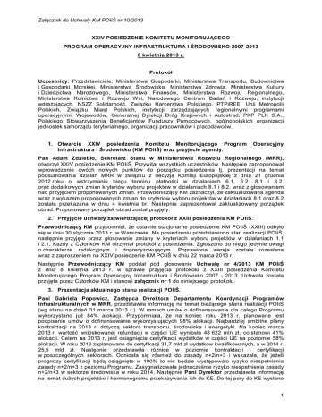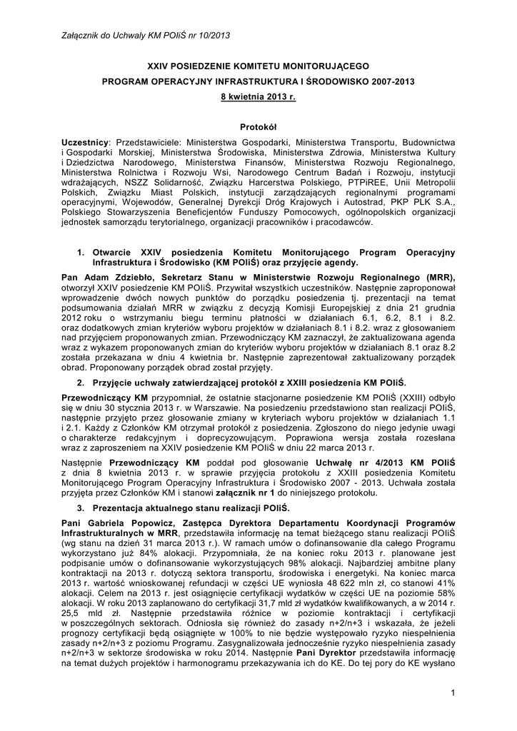 Załącznik do Uchwaly KM POIiŚ nr 10/2013 XXIV POSIEDZENIE KOMITETU MONITORUJĄCEGO PROGRAM OPERACYJNY INFRASTRUKTURA I ŚRODOWISKO 2007-2013 8 kwietnia 2013 r. Protokół Uczestnicy: Przedstawiciele: Ministerstwa Gospodarki, Ministerstwa Transportu, Budownictwa i Gospodarki Morskiej, Ministerstwa Środowiska, Ministerstwa Zdrowia, Ministerstwa Kultury i Dziedzictwa Narodowego, Ministerstwa Finansów, Ministerstwa Rozwoju Regionalnego, Ministerstwa Rolnictwa i Rozwoju Wsi, Narodowego Centrum Badań i Rozwoju, instytucji wdrażających, NSZZ Solidarność, Związku Harcerstwa Polskiego, PTPiREE, Unii Metropolii Polskich, Związku Miast Polskich, instytucji zarządzających regionalnymi programami operacyjnymi, Wojewodów, Generalnej Dyrekcji Dróg Krajowych i Autostrad, PKP PLK S.A., Polskiego Stowarzyszenia Beneficjentów Funduszy Pomocowych, ogólnopolskich organizacji jednostek samorządu terytorialnego, organizacji pracowników i pracodawców. 1. Otwarcie XXIV posiedzenia Komitetu Monitorującego Program Infrastruktura i Środowisko (KM POIiŚ) oraz przyjęcie agendy. Operacyjny Pan Adam Zdziebło, Sekretarz Stanu w Ministerstwie Rozwoju Regionalnego (MRR), otworzył XXIV posiedzenie KM POIiŚ. Przywitał wszystkich uczestników. Następnie zaproponował wprowadzenie dwóch nowych punktów do porządku posiedzenia tj. prezentacji na temat podsumowania działań MRR w związku z decyzją Komisji Europejskiej z dnia 21 grudnia 2012 roku o wstrzymaniu biegu terminu płatności w działaniach 6.1, 6.2, 8.1 i 8.2. oraz dodatkowych zmian kryteriów wyboru projektów w działaniach 8.1 i 8.2. wraz z głosowaniem nad przyjęciem proponowanych zmian. Przewodniczący KM zaznaczył, że zaktualizowana agenda wraz z wykazem proponowanych zmian do kryteriów wyboru projektów w działaniach 8.1 oraz 8.2 została przekazana w dniu 4 kwietnia br. Następnie zaprezentował zaktualizowany porządek obrad. Proponowany porządek obrad został przyjęty. 2. Przyjęcie uchwały zatwierdzającej protokół z XXIII posiedzenia KM POIiŚ. Przewodniczący KM przypomniał, że ostatnie stacjonarne posiedzenie KM POIiŚ (XXIII) odbyło się w dniu 30 stycznia 2013 r. w Warszawie. Na posiedzeniu przedstawiono stan realizacji POIiŚ, następnie przyjęto przez głosowanie zmiany w kryteriach wyboru projektów w działaniach 1.1 i 2.1. Każdy z Członków KM otrzymał protokół z posiedzenia. Zgłoszono do niego jedynie uwagi o charakterze redakcyjnym i doprecyzowującym. Poprawiona wersja została rozesłana wraz z zaproszeniem na XXIV posiedzenie KM POIiŚ w dniu 22 marca 2013 r. Następnie Przewodniczący KM poddał pod głosowanie Uchwałę nr 4/2013 KM POIiŚ z dnia 8 kwietnia 2013 r. w sprawie przyjęcia protokołu z XXIII posiedzenia Komitetu Monitorującego Program Operacyjny Infrastruktura i Środowisko 2007 - 2013. Uchwała została przyjęta przez Członków KM i stanowi załącznik nr 1 do niniejszego protokołu. 3. Prezentacja aktualnego stanu realizacji POIiŚ. Pani Gabriela Popowicz, Zastępca Dyrektora Departamentu Koordynacji Programów Infrastrukturalnych w MRR, przedstawiła informację na temat bieżącego stanu realizacji POIiŚ (wg stanu na dzień 31 marca 2013 r.). W ramach umów o dofinansowanie dla całego Programu wykorzystano już 84% alokacji. Przypomniała, że na koniec roku 2013 r. planowane jest podpisanie umów o dofinansowanie wykorzystujących 98% alokacji. Najbardziej ambitne plany kontraktacji na 2013 r. dotyczą sektora transportu, środowiska i energetyki. Na koniec marca 2013 r. wartość wnioskowanej refundacji w części UE wyniosła 48 622 mln zł, co stanowi 41% alokacji. Celem na 2013 r. jest osiągnięcie certyfikacji wydatków w części UE na poziomie 58% alokacji. W roku 2013 zaplanowano do certyfikacji 31,7 mld zł wydatków kwalifikowanych, a w 2014 r. 25,5 mld zł. Następnie przedstawiła różnice w poziomie kontraktacji i certyfikacji w poszczególnych sektorach. Odniosła się również do zasady n+2/n+3 i wskazała, że jeżeli prognozy certyfikacji będą osiągnięte w 100% to nie będzie występowało ryzyko niespełnienia zasady n+2/n+3 z poziomu Programu. Zasygnalizowała jednocześnie ryzyko niespełnienia zasady n+2/n+3 w sektorze środowiska w roku 2014. Następnie Pani Dyrektor przedstawiła informację na temat dużych projektów i harmonogramu przekazywania ich do KE. Do tej pory do KE wysłano 1 Załącznik do Uchwaly KM POIiŚ nr 10/2013 137 dużych projektów z czego przypadku 82 projektów zostały już wydane decyzje KE. Ponadto zakończyła się już realizacja 793 projektów, co stanowi ponad 40% projektów POIiŚ. Prezentacja aktualnego stanu realizacji POIiŚ stanowi załącznik nr 2 do niniejszego protokołu. Przewodniczący KM podziękował wszystkim zebranym za sumienną pracę i zaangażowanie w prawidłową realizację i rozliczanie projektów w ramach poszczególnych sektorów. Następnie przeszedł do omówienia rekomendacji IZ POIiŚ. W odniesieniu do sektora środowiska dotyczyły one dostosowania przepisów krajowych do prawodawstwa unijnego przede wszystkim w zakresie art. 5.2 Dyrektywy Ściekowej oraz podjęcia przez MŚ działań naprawczych związanych z dyskusją dotyczącą wypełnienia przez Polskę luki transpozycyjnej w zakresie Ramowej Dyrektywy Wodnej, w szczególności przedstawienia pod obrady Rady Ministrów harmonogramu realizacji Master Planów. Rekomendacje dla sektora transportu odnosiły się przede wszystkim do sektora kolejowego, gdzie konieczne jest przyspieszenie wydatkowania środków. Przewodniczący KM poprosił również o rozpoczęcie prac przygotowawczych dla inwestycji planowanych do przyprowadzenia w kolejnym okresie programowania w ramach tego sektora. W odniesieniu do sektora energetyki zarekomendował osiągnięcie 100% kontraktacji w ramach sektora, zrealizowanie prognozy płatności na rok 2013, podpisanie umów na realizację dwóch ostatnich odcinków połączenia elektroenergetycznego Po