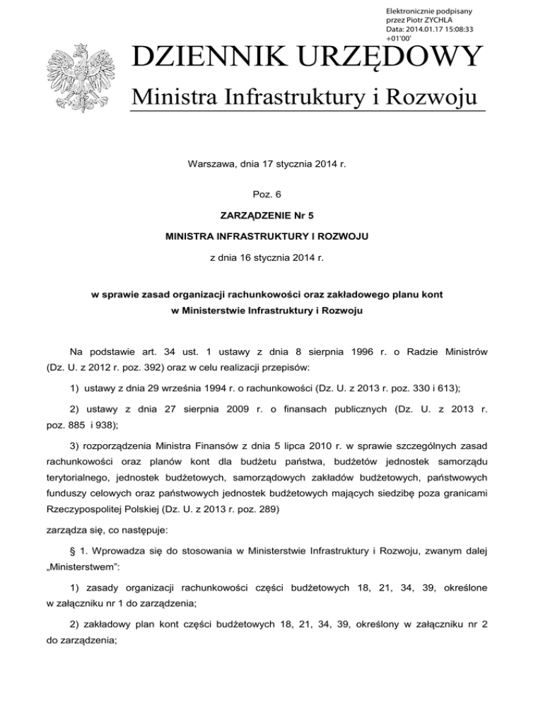 Elektronicznie podpisany przez Piotr ZYCHLA Data: 2014.01.17 15:08:33 +01'00' DZIENNIK URZĘDOWY Ministra Infrastruktury i Rozwoju Warszawa, dnia 17 stycznia 2014 r. Poz. 6 ZARZĄDZENIE Nr 5 MINISTRA INFRASTRUKTURY I ROZWOJU z dnia 16 stycznia 2014 r. w sprawie zasad organizacji rachunkowości oraz zakładowego planu kont w Ministerstwie Infrastruktury i Rozwoju Na podstawie art. 34 ust. 1 ustawy z dnia 8 sierpnia 1996 r. o Radzie Ministrów (Dz. U. z 2012 r. poz. 392) oraz w celu realizacji przepisów: 1) ustawy z dnia 29 września 1994 r. o rachunkowości (Dz. U. z 2013 r. poz. 330 i 613); 2) ustawy z dnia 27 sierpnia 2009 r. o finansach publicznych (Dz. U. z 2013 r. poz. 885 i 938); 3) rozporządzenia Ministra Finansów z dnia 5 lipca 2010 r. w sprawie szczególnych zasad rachunkowości oraz planów kont dla budżetu państwa, budżetów jednostek samorządu terytorialnego, jednostek budżetowych, samorządowych zakładów budżetowych, państwowych funduszy celowych oraz państwowych jednostek budżetowych mających siedzibę poza granicami Rzeczypospolitej Polskiej (Dz. U. z 2013 r. poz. 289) zarządza się, co następuje: § 1. Wprowadza się do stosowania w Ministerstwie Infrastruktury i Rozwoju, zwanym dalej „Ministerstwem”: 1) zasady organizacji rachunkowości części budżetowych 18, 21, 34, 39, określone w załączniku nr 1 do zarządzenia; 2) zakładowy plan kont części budżetowych 18, 21, 34, 39, określony w załączniku nr 2 do zarządzenia; Dziennik Urzędowy Ministra Infrastruktury i Rozwoju –2– Poz. 6 3) system przetwarzania danych części budżetowych 18, 21, 34, 39, określony w załączniku nr 3 do zarządzenia. § 2. 1. Do ewidencji księgowej za rok 2013 stosuje się: 1) zarządzenie Nr 10 Ministra Rozwoju Regionalnego z dnia 27 czerwca 2013 r. w sprawie zasad organizacji rachunkowości oraz zakładowego planu kont w Ministerstwie Rozwoju Regionalnego; 2) zarządzenie Nr 53 Ministra Transportu, Budownictwa i Gospodarki Morskiej z dnia 14 sierpnia 2012 r. w sprawie ustalenia zasad rachunkowości Dysponenta części 18, 21, 39 w Ministerstwie Transportu, Budownictwa i Gospodarki Morskiej; 3) zarządzenie Nr 54 Ministra Transportu, Budownictwa i Gospodarki Morskiej z dnia 14 sierpnia 2012 r. w sprawie ustalenia zasad rachunkowości w Ministerstwie Transportu, Budownictwa i Gospodarki Morskiej. 2. Zarządzenie wchodzi w życie z dniem ogłoszenia, z mocą obowiązującą od dnia 1 stycznia 2014 r. Minister Infrastruktury i Rozwoju : E. Bieńkowska Dziennik Urzędowy Ministra Infrastruktury i Rozwoju –3– Poz. 6 Załączniki do zarządzenia nr 5 Ministra Infrastruktury i Rozwoju z dnia 16 stycznia 2014 r. (poz. 6) Załącznik nr 1 ZASADY ORGANIZACJI RACHUNKOWOŚCI I. Przepisy ogólne §1.1.Podstawę prawną stosowanych w Ministerstwie zasad rachunkowości stanowi: 1) ustawa z dnia 29 września 1994 r. o rachunkowości; 2) ustawa z dnia 27 sierpnia 2009 r. o finansach publicznych; 3) rozporządzenie Ministra Finansów z dnia 5 lipca 2010 r. w sprawie szczególnych zasad rachunkowości oraz planów kont dla budżetu państwa, budżetów jednostek samorządu terytorialnego, jednostek budżetowych, samorządowych zakładów budżetowych, państwowych funduszy celowych oraz państwowych jednostek budżetowych mających siedzibę poza granicami Rzeczypospolitej Polskiej. 2. Zasady i terminy przeprowadzania inwentaryzacji określone zostały w zarządzeniu Dyrektora Generalnego Ministerstwa w sprawie wprowadzenia Instrukcji inwentaryzacyjnej. II. Szczególne zasady rachunkowości §2.1. W Ministerstwie prowadzona jest obsługa finansowo-księgowa w zakresie dysponentów części budżetowych: 18 – Budownictwo, lokalne planowanie i zagospodarowanie przestrzenne oraz mieszkalnictwo, 21 - Gospodarka morska, 34 - Rozwój regionalny, 39 – Transport oraz dysponenta trzeciego stopnia. 2. Ewidencję księgową prowadzi w Ministerstwie Departament Budżetu Rozwoju, zwany dalej „DBR”, Departament Budżetu Infrastruktury, zwany dalej „DBI” oraz Biuro Dyrektora Generalnego, zwane dalej „BDG”. 3. DBR prowadzi ewidencję księgową w ramach obsługi dysponenta części budżetowej 34 Rozwój regionalny. 4. DBI prowadzi ewidencję księgową w ramach obsługi dysponenta części budżetowych 18 Budownictwo, lokalne planowanie i zagospodarowanie przestrzenne oraz mieszkalnictwo, 21 Gospodarka morska oraz 39 – Transport. 5. BDG prowadzi ewidencję księgową dotyczącą obsługi dysponenta trzeciego stopnia oraz Urzędów Żeglugi Śródlądowej. 6. Rokiem obrotowym jest rok kalendarzowy rozpoczynający się dnia 1 stycznia, a kończący się dnia 31 grudnia. 7. Okresem sprawozdawczym jest miesiąc, kwartał, półrocze lub rok, zgodnie z przepisami odrębnymi. Dziennik Urzędowy Ministra Infrastruktury i Rozwoju –4– Poz. 6 8. Księgi rachunkowe otwierane są na dzień rozpoczynający każdy rok obrotowy i zamykane na dzień kończący rok obrotowy. Ostateczne zamknięcie ksiąg rachunkowych następuje do dnia 30 kwietnia roku następnego. 9. Zamknięcie ksiąg rachunkowych następuje poprzez nieodwracalne wyłączenie możliwości dokonywania zapisów księgowych w zbiorach danych tworzących zamknięte księgi rachunkowe. 10. Księgi rachunkowe obejmują zbiory zapisów księgowych, które tworzą: 1) dziennik; 2) księgę główną; 3) księgi pomocnicze; 4) zestawienia: obrotów i sald kont księgi głównej oraz sald kont ksiąg pomocniczych. 11. Księgi rachunkowe prowadzone są w języku polskim i w walucie polskiej. Ewidencja księgowa dotycząca rozliczeń z Komisją Europejską, w tym: kwot zadeklarowanych Komisji oraz obsługi rachunków walutowych i innych płatności wyrażonych w walutach obcych prowadzona jest równolegle w walucie polskiej i w walucie obcej. 12. Zapis księgowy zawiera: 1) datę dokonania operacji gospodarczej; 2) określenie rodzaju i numeru identyfikacyjnego dowodu księgowego stanowiącego podstawę zapisu oraz jego dat