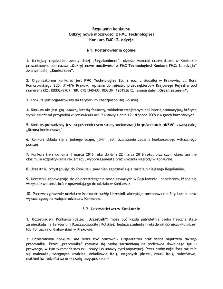 Regulamin konkursu Odkryj nowe możliwości z FMC Technologies