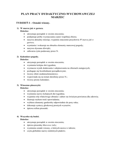 PLAN PRACY DYDAKTYCZNO-WYCHOWAWCZEJ MARZEC TYDZIEŃ I – Oznaki wiosny. 1) W marcu jak w garncu. Dziecko: utrzymuje porządek w swoim otoczeniu; podejmuje próby wyznaczania części wspólnej zbioru; nazywa aktualny miesiąc; wyjaśnia znaczenie przysłowia W marcu jak w garncu; wymienia i wskazuje na obrazku elementy marcowej pogody; nazywa słyszane dźwięki; odtwarza rytm podawany przez N. 2) Kalendarz pogody. Dziecko: utrzymuje porządek w swoim otoczeniu; wymienia kolejne dni tygodnia; wyznacza wynik dodawania i odejmowania na zbiorach zastępczych; posługuje się liczebnikami porządkowymi; tworzy zbiór siedmioelementowy; wypowiada się na temat określony przez N.; tworzy prosty kalendarz. 3) Wiosenne płaszczyki. Dziecko: utrzymuje porządek w swoim otoczeniu; wymienia nazwy kolejnych dni tygodnia; wyjaśnia rolę właściwego ubrania i zabaw na świeżym powietrzu dla zdrowia; ilustruje ruchem treść opowiadania; wybiera elementy garderoby odpowiednie do pory roku; dokonuje syntezy głoskowej prostych wyrazów; śpiewa refren piosenki. 4) Wszystko się budzi. Dziecko: utrzymuje porządek w swoim otoczeniu; śpiewa piosenkę Marcowe żaby; wymienia oznaki wiosny, o których mowa w tekście; czyta globalnie nazwy niektórych ptaków; dokonuje syntezy słuchowej prostych nazw ptaków; realizuje rytm podany przez N.; wypowiada się na temat ilustracji. 5) Szukamy oznak wiosny. Dziecko: utrzymuje porządek w swoim otoczeniu; określa oznaki wiosny związane z otoczeniem przyrodniczym; obrazuje wiedzę na temat oznak wiosny w pracy plastycznej; składa obrazek z elementów; recytuje w zespole wiersz Prośba do słoneczka. TYDZIEŃ II – WSZYSTKO ROŚNIE 1) Wiosenne kwiaty. Dziecko: przestrzega zasad w grach zespołowych; wypowiada się na temat oglądanych ilustracji; współpracuje z kolegą podczas zabawy ruchowej; wymienia i wskazuje na obrazku wiosenne kwiaty; posługuje się liczebnikami porządkowymi; wyróżnia pierwszą i ostatnią głoskę w nazwach kwiatów; porządkuje liczby rosnąco lub malejąco; wykonuje pracę według instrukcji. 2) Kwiaty z cebuli. Dziecko: przestrzega zasad w grach zespołowych; wyjaśnia pojęcie cebula; aktywnie uczestniczy w zabawach zespołowych; podaje nazwę przedmiotu na podstawie definicji; porządkuje kolejność zdarzeń na podstawie opowiadania; dokonuje analizy słuchowej wyrazów– wyróżnia głoskę c w różnych miejscach w wyrazie; różnicuje głoski c–dz. 3) W kwiaciarni. Dziecko: przestrzega zasad w grach zespołowych; dobiera obrazki o przeciwstawnych nazwach; uzupełnia brakujące części w obrazku; tworzy i porządkuje zbiory siedmioelementowe; podpisuje zbiory za pomocą liczb; składa obrazek z 4–8 części; sprawnie omija przeszkody w zabawie ruchowej. 4) Zakładamy wiosenną hodowlę. Dziecko: przestrzega zasad w grach zespołowych; dzieli się swoimi spostrzeżeniami z obserwacji; wnioskuje na podstawie obserwacji; sprawnie zmienia kierunek ruchu w zabawie; nazywa części rośliny; wyjaśnia znaczenie korzeni i liści dla rozwoju rośliny; samodzielnie wykonuje sadzonki według instrukcji i pokazu N.; porządkuje zdarzenia posługując się pojęciami: najpierw, potem, na końcu; naśladuje ruchy narządów mowy wykonywane przez N. 5) Z wiosną dzieci rosną. Dziecko: przestrzega zasad w grach zespołowych; zapamiętuje kolejność przedmiotów ułożonych w szeregu; nazywa pory roku; koncentruje uwagę na tekście literackim; porównuje wysokość dwóch osób przy pomocy pojęć: wyższy–niższy; wymyśla sposoby na prowadzenie profilaktyki zdrowotnej; uzasadnia swoje stanowisko; doskonali siłę, zwinność, skoczność oraz celność rzutu; dodaje na zbiorach zastępczych; wykonuje czynności zgodnie z instrukcją N. TYDZIEŃ III – PRACOWITA WIOSNA 1) Wiosenne porządki w domu. Dziecko: utrzymuje porządek w swoim otoczeniu; wskazuje wyrazy rymujące się; określa przeznaczenie niektórych narzędzi domowych; angażuje się w jak najlepsze wykonanie zadania w zabawie; zapamiętuje kolejność przedmiotów w szeregu; naśladuje czynności wykonywane przez N. lub inne dziecko; wyjaśnia znaczenie czystego otoczenia dla zdrowia; łączy takie same układy szeregowe złożone z symboli; przestrzega kolejności w grze; usprawnia dodawanie na oczkach kostki do gry; dokonuje oceny stwierdzenia na zasadzie „prawda–fałsz”. 2) Porządki w ogródku. Dziecko: utrzymuje porządek w swoim otoczeniu; wskazuje wyrazy zaczynające się taką samą sylaba; rozpoznaje i nazywa narzędzia ogrodnicze; opowiada sytuacje przedstawiona na obrazku z nazywaniem czynności wykonywanych przez różne osoby; ilustruje ruchem treść opowiadania; tworzy zbiory siedmioelementowe; porządkuje zbiory rosnąco lub malejąco; wyróżnia głoskę w wygłosie; wykonuje instrukcje N.; rysuje w ograniczonym polu i po śladzie; posługuje się liczebnikami porządkowymi w zakresie siedmiu. 3) Co się dzieje w szklarni? Dziecko: utrzymuje porządek w swoim otoczeniu; wskazuje wyrazy kończące się taką samą sylaba; koncentruje uwagę na treści opowiadania; wyjaśnia rolę szklarni w hodowli roślin; koncentruje uwagę na sygnałach słownych; komponuje obrazek z nasion roślin strączkowych; odczytuje swoje imię; prowadzi zapis wyników obserwacji w swoim kalendarzu pogody; odszukuje na obrazku wyróżnione elementy; wykonuje pracę według instrukcji; rysuje oburącz po śladzie; zapamiętuje kolejność przedmiotów w szeregu; stosuje zwroty grzecznościowe w zabawie. 4) Pracowite ptaki. Dziecko: utrzymuje porządek w swoim otoczeniu; układa wyrazy w ciąg na zasadzie domina – ostatnia głoska wyrazu poprzedniego jest pierwszą głoską wyrazu następnego; koncentruje uwagę na treści wiersza lub opowiadania; nazywa niektóre ptaki na podstawie obrazka lub opisu; realizuje rytm podany przez N. ilustrując dźwiękami treść opowiadania; sprawnie pokonuje trasę toru przeszkód; dodaje i odejmuje na zbiorach zastępczych. 