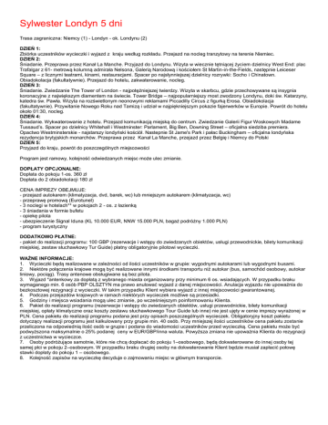 Sylwester Londyn 5 dni Trasa zagraniczna: Niemcy (1) - Londyn - ok. Londynu (2) DZIEŃ 1: Zbiórka uczestników wycieczki i wyjazd z kraju według rozkładu. Przejazd na nocleg tranzytowy na terenie Niemiec. DZIEŃ 2: Śniadanie. Przeprawa przez Kanał La Manche. Przyjazd do Londynu. Wizyta w wiecznie tętniącej życiem dzielnicy West End: plac Trafalgar z 61- metrową kolumną admirała Nelsona, Galerią Narodową i kościołem St Martin-in-the-Fields, następnie Leiceser Square – z licznymi teatrami, kinami, restauracjami. Spacer po najsłynniejszej dzielnicy rozrywki: Socho i Chinatown. Obiadokolacja (fakultatywnie). Przejazd do hotelu, zakwaterowanie, nocleg. DZIEŃ 3: Śniadanie. Zwiedzanie The Tower of London - najpotężniejszej twierdzy. Wizyta w skarbcu, gdzie przechowywane są insygnia koronacyjne z największym diamentem na świecie. Tower Bridge – najpopularniejszy most zwodzony Londynu, doki św. Katarzyny, katedra św. Pawła. Wizyta na rozświetlonym neonowymi reklamami Piccadilly Circus z figurką Erosa. Obiadokolacja (fakultatywnie). Przywitanie Nowego Roku nad Tamizą i udział w najpiękniejszym pokazie fajerwerków w Europie. Powrót do hotelu około 01:30, nocleg. DZIEŃ 4: Śniadanie. Wykwaterowanie z hotelu. Przejazd komunikacją miejską do centrum. Zwiedzanie Galerii Figur Woskowych Madame Tussaud’s. Spacer po dzielnicy Whitehall i Westminster: Parlament, Big Ben, Downing Street – oficjalna siedziba premiera. Opactwo Westminsterskie - najstarszy londyński kościół. Nastepnie St Jame's Park i pałac Buckingham – oficjalna londyńska rezydencja brytyjskich monarchów. Przeprawa przez Kanał La Manche, przejazd przez Belgię i Niemcy do Polski DZIEŃ 5: Przyjazd do kraju, powrót do poszczególnych miejscowości Program jest ramowy, kolejność odwiedzanych miejsc może ulec zmianie. DOPŁATY OPCJONALNE: Dopłata do pokoju 1-os. 360 zł Dopłata do 2 obiadokolacji 180 zł CENA IMPREZY OBEJMUJE: - przejazd autokarem (klimatyzacja, dvd, barek, wc) lub mniejszym autokarem (klimatyzacja, wc) - przeprawę promową (Eurotunel) - 3 noclegi w hotelach** w pokojach 2 - os. z łazienką - 3 śniadania w formie bufetu - opiekę pilota - ubezpieczenie Signal Iduna (KL 10.000 EUR, NNW 15.000 PLN, bagaż podróżny 1.000 PLN) - program turystyczny DODATKOWO PŁATNE: - pakiet do realizacji programu: 100 GBP (rezerwacje i wstępy do zwiedzanych obiektów, usługi przewodnickie, bilety komunikacji miejskiej, zestaw słuchawkowy Tur Guide) płatny obligatoryjnie pilotowi wycieczki. WAŻNE INFORMACJE: 1. Wycieczki będą realizowane w zależności od ilości uczestników w grupie: wygodnymi autokarami lub wygodnymi busami. 2. Niektóre połączenia krajowe mogą być realizowane innymi środkami transportu niż autokar (bus, samochód osobowy, autokar liniowy, pociąg). Trasy antenowe obsługiwane są bez pilota. 3. Wyjazd *antenkowy za dopłatą z wybranego miasta organizowany przy minimum 6 os. wsiadających. W przypadku braku wymaganego min. 6 osób PBP OLSZTYN ma prawo anulować wyjazd z danej miejscowości. Anulacja wyjazdu nie upoważnia do bezkosztowej rezygnacji z wycieczki. W takim przypadku Klient wybiera wyjazd z innej miejscowości gwarantowanej. 4. Podczas przejazdów krajowych w ramach niektórych wycieczek możliwe są przesiadki. 5. Godziny i miejsca wsiadania mogą ulec zmianie, po wcześniejszym poinformowaniu Klienta. 6. Pakiet do realizacji programu (rezerwacje i wstępy do zwiedzanych obiektów, usługi przewodnickie, bilety komunikacji miejskiej, opłaty klimatyczne oraz koszty zestawu słuchawkowego Tour Guide lub inne) nie jest ujęty w cenie imprezy wyrażonej w PLN. Cena pakietu do realizacji programu podana jest przy opisach poszczególnych wycieczek. Obligatoryjny koszt pakietu dotyczący realizacji programu jest kalkulowany przy grupie min. 40 osób. Przy mniejszej ilości uczestników cena pakietu zostanie przeliczona na odpowiednią ilość osób w grupie i podana do wiadomości uczestników przed wycieczką. Cena pakietu może być podwyższona maksymalnie o 25% podanej ceny w EUR/GBP/inna waluta. Powyższa zmiana nie upoważnia Klienta do rezygnacji z uczestnictwa w wycieczce. 7. Osoby podróżujące samotnie, które nie chcą dopłacać do pokoju 1–osobowego, będą dokwaterowane do innej osoby tej samej płci w pokoju 2–osobowym. W przypadku braku drugiej osoby na dokwaterowanie Klient będzie musiał zapłacić połowę stawki dopłaty do pokoju 1 – osobowego. 8. Kolejność zapisów na wycieczkę decyduje o zajmowaniu miejsc w głównym transporcie.