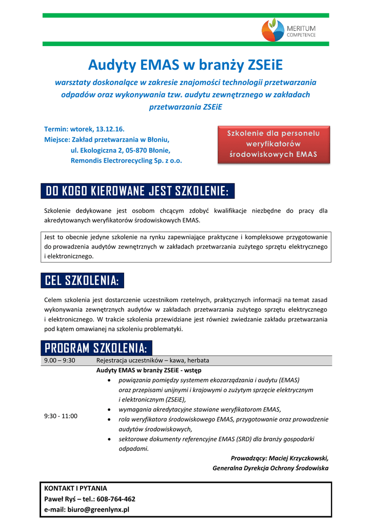 Audyty EMAS w branży ZSEiE warsztaty doskonalące w zakresie znajomości technologii przetwarzania odpadów oraz wykonywania tzw. audytu zewnętrznego w zakładach przetwarzania ZSEiE Termin: wtorek, 13.12.16. Miejsce: Zakład przetwarzania w Błoniu, ul. Ekologiczna 2, 05-870 Błonie, Remondis Electrorecycling Sp. z o.o. DO KOGO KIEROWANE JEST SZKOLENIE: Szkolenie dedykowane jest osobom chcącym zdobyć kwalifikacje niezbędne do pracy dla akredytowanych weryfikatorów środowiskowych EMAS. Jest to obecnie jedyne szkolenie na rynku zapewniające praktyczne i kompleksowe przygotowanie do prowadzenia audytów zewnętrznych w zakładach przetwarzania zużytego sprzętu elektrycznego i elektronicznego. CEL SZKOLENIA: Celem szkolenia jest dostarczenie uczestnikom rzetelnych, praktycznych informacji na temat zasad wykonywania zewnętrznych audytów w zakładach przetwarzania zużytego sprzętu elektrycznego i elektronicznego. W trakcie szkolenia przewidziane jest również zwiedzanie zakładu przetwarzania pod kątem omawianej na szkoleniu problematyki. PROGRAM SZKOLENIA: 9.00 – 9:30 9:30 - 11:00 Rejestracja uczestników – kawa, herbata Audyty EMAS w branży ZSEiE - wstęp powiązania pomiędzy systemem ekozarządzania i audytu (EMAS) oraz przepisami unijnymi i krajowymi o zużytym sprzęcie elektrycznym i elektronicznym (ZSEiE), wymagania akredytacyjne stawiane weryfikatorom EMAS, rola weryfikatora środowiskowego EMAS, przygotowanie oraz prowadzenie audytów środowiskowych, sektorowe dokumenty referencyjne EMAS (SRD) dla branży gospodarki odpadami. Prowadzący: Maciej Krzyczkowski, Generalna Dyrekcja Ochrony Środowiska KONTAKT I PYTANIA Paweł Ryś – tel.: 608-764-462 e-mail: [email protected] 11:00 - 11:15 11:15 – 12:15 12:15 – 13:00 Przerwa kawowa Analiza funkcjonowania systemu gospodarowania ZSEiE w Polsce z uwzględnieniem nieprawidłowości Omówienie rynku zużytego sprzętu elektrycznego i elektronicznego: zbieranie i przetwarzanie ilości sprzętu w Polsce, zakłady przetwarzania i organizacje odzysku, warunki cenowe współpracy organizacje odzysku – zakłady przetwarzania - zbierający, najważniejsze patologie na rynku zużytego sprzętu elektrycznego i elektronicznego. Prowadzący: Mirosław Baściuk, Związek Pracodawców Branży Elektroodpadów Elektro-Odzysk, Prezes Zarządu Podstawowe dokumenty w zakładach przetwarzania Omówienie poszczególnych rodzajów sprawozdań, zaświadczeń oraz dokumentów ewidencyjnych składanych przez zakład oraz jego obowiązki: sprawozdanie o zebranym zużytym sprzęcie, sprawozdanie o przetworzonym zużytym sprzęcie, sprawozdanie o masie odpadów powstałych z przetworzenia zużytego sprzętu poddanych odzyskowi/recyklingowi, zaświadczenie o zużytym sprzęcie, zaświadczenie potwierdzające odzysk/recykling, karta ewidencji zużytego sprzętu, załącznik numer VII do rozporządzenia PEiR 1013/2006, oświadczenia i umowy cywilno-prawne. Prowadzący: Nina Leszczyńska-Dudek, Dyrektor Administracyjny, Remondis Electrorecycling 13:00 – 13:30 13:30 – 14:30 Przerwa obiadowa Audyt w zakładzie przetwarzania – podstawy teoretyczne Praktyczne zagadnienia wykonywania audytu: weryfikacja decyzji administracyjnej, omówienie protokołów kontroli WIOŚ oraz możliwych zarządzeń pokontrolnych, walidacja dokumentacji (kwity wagowe, KPO, stany magazynowe, strumienie przepływu odpadów), bilanse masowe przetwarzanych elektroodpadów, weryfikacja zdolności przetwarzania i stosowanych technologii, omówienie testu 100 urządzeń, najczęściej popełniane błędy w ewidencji i sprawozdawczości, możliwe popełniane czyny karne i karnoskarbowe. Prowadzący: Mirosław Baściuk, Związek Pracodawców Branży Elektroodpadów Elektro-Odzysk, Prezes Zarządu KONTAKT I PYTANIA Paweł Ryś – tel.: 608-764-462 e-mail: [email protected] 14:30 – 16:00 Audyt w zakładzie przetwarzania – podstawy praktyczne nieprawidłowości w zakresie prowadzonych procesów przetwarzania odpadów z uwzględnieniem stosowanych technologii, nieprawidłowości w charakteryzowaniu odpadów ze szczególnym uwzględnieniem źródeł ich pochodzenia, nieprawidłowości przy dokumentowaniu gospodarowania odpadami, zwiedzanie zakładu przetwarzania wraz ze wskazaniem konkretnych elementów kontroli i weryfikacji prawidłowości przetwarzania. Prowadzący: Robert Wawrzonek, Remondis Electrorecycling Sp. z o.o., Dyrektor Techniczny 16:00 – 17:00 17:00- 17:15 Ćwiczenia praktyczne. Sesja pytań i odpowiedzi. Prowadzący: Robert Wawrzonek, Remondis Electrorecycling Sp. z o.o., Dyrektor Techniczny, Mirosław Baściuk, Związek Pracodawców Branży Elektroodpadów Elektro-Odzysk, Prezes Zarządu. Podsumowanie i zakończenie szkolenia. Rozdanie zaświadczeń uczestnictwa w szkoleniu. METODY SZKOLENIOWE: Szkolenie wypełnione będzie ćwiczeniami praktycznymi oraz pracą na case-studies. Zajęcia teoretyczne prowadzone są w czytelny i zrozumiały sposób metodą "krok po kroku". Poszczególne zagadnienia omawiane będę tylko na konkretnych problemowych przykładach. Wszystkie informacje praktyczne będą dodatkowo wyjaśniane w czasie ćwiczeń praktycznych, bezpośrednio w zakładzie przetwarzania. Brane będą również pod uwagę wszystkie zagadnienia zgłaszane przez uczestników. KONTAKT I PYTANIA Paweł Ryś – tel.: 608-764-462 e-mail: [email protected] PRELEGENCI: Maciej Krzyczkowski Ekspert z wieloletnim doświadczeniem w branży ochrony środowiska. Od blisko 10 lat prowadzi szkolenia za zakresu wymagań prawnych ochrony środowiska, gospodarki odpadami oraz wdrażania i audytowania systemów zarządzania środowiskowego. Posiada praktyczne doświadczenie związane z wdrażaniem i weryfikacją wymagań systemu ekozarządzania i audytu (EMAS) w organizacjach. Radca Generalego Dyrektora w Generalnej Dyrekcji Ochrony Środowiska. Ekspert w zakresie gospodarki odpadami oraz systemów zarządzania środowiskowego. Doświadczony audytor i wykładowca, autor