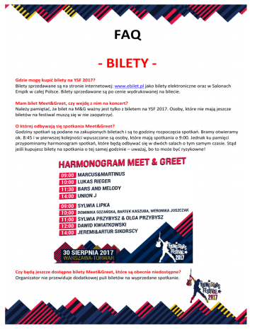 FAQ -‐ BILETY -‐ Gdzie mogę kupić bilety na YSF 2017? Bilety sprzedawane są na stronie internetowej: www.ebilet.pl jako bilety elektroniczne oraz w Salonach Empik w całej Polsce. Bilety sprzedawane są po cenie wydrukowanej na bilecie. Mam bilet Meet&Greet, czy wejdę z nim na koncert? Należy pamiętać, że bilet na M&G ważny jest tylko z biletem na YSF 2017. Osoby, które nie mają jeszcze biletów na festiwal muszą się w nie zaopatrzyć. O której odbywają się spotkania Meet&Greet? Godziny spotkań są podane na zakupionych biletach i są to godziny rozpoczęcia spotkań. Bramy otwieramy ok. 8:45 i w pierwszej kolejności wpuszczane są osoby, które mają spotkania o 9:00. Jednak ku pamięci przypominamy harmonogram spotkań, które będą odbywać się w dwóch salach o tym samym czasie. Stąd jeśli kupujesz bilety na spotkania o tej samej godzinie – uważaj, bo to może być ryzykowne! Czy będą jeszcze dostępne bilety Meet&Greet, które są obecnie niedostępne? Organizator nie przewiduje dodatkowej puli biletów na wyprzedane spotkanie. Czy można będzie kupić bilet w dniu festiwalu YSF2017? Organizator przewiduje ograniczoną pulę biletów, które będzie można nabyć w dniu koncertu. Jednak w przypadku wyprzedania Festiwalu na długo przez wydarzeniem może wpłynąć na zmianę decyzji. Czy bilet na BACKSTAGE daje 100% pewności na spotkanie artystów i spędzenia z nimi czasu? Tylko i wyłącznie bilety MEET&GREET dają 100% pewność kontaktu z artystami. Bilety BACKSTAGE zapewniają wejście na BACKSTAGE (za wyjątkiem garderoby i pomieszczeń technicznych). Tylko i wyłącznie od artysty przebywającego na backstage’u zależy czy będzie kontaktował się z fanami i spędzał czas w tej strefie. Czy bilety GOLDEN, DIAMOND i BACKSTAGE mają osobne wejście? Tak, dla osób posiadających bilety GOLDEN, DIAMOND i BACKSTAGE będzie uruchomione osobne wejście na teren festiwalu Można już rezerwować bilety na YSF 2018? Na chwilę obecną skupiamy się na organizacji YSF 2017 czy Young Stars Camp oraz innych projektach Young Stars. Ale nie możemy już doczekać się kolejnego roku! -‐ REGULAMIN – Kupiłem/-‐am bilet dla mojego dziecka na YSF, ale jest niepełnoletnie. Czy rodzic (osoba dorosła/opiekun) wchodzi za darmo czy musi również nabyć bilet? Warunkiem wpuszczenia uczestnika w wieku od 4 do 11 roku życia na Teren Imprezy jest przebywanie pod opieką osoby dorosłej POSIADAJĄCEJ bilet wstępu do tej samej strefy co małoletni uczestnik przez cały okres trwania YSF2017. Natomiast uczestnik imprezy w wieku od 12-‐18 lat musi posiadać przy sobie pisemną zgodę rodziców, zezwalającą na jego samodzielne przebywanie na terenie imprezy (pkt 27 oraz 28 regulaminu). Gdzie znajdę wzór zgody rodzica na uczestniczenie w imprezie? Wzór zgody znajduje się na naszej oficjalnej stronie www.ysf.youngstars.pl (w dziale: Informacje Organizacyjne). Zgoda może być wydrukowana lub pisana ręcznie – ważne, by po prostu była! Czego nie wolno wnosić? Ograniczenia znajdziecie w naszym regulaminie, mówi o tym pkt 7, 8 oraz 9. Należy pamiętać, że zabronione jest wnoszenie SELFIE STICKOW, STRZELAJĄCYCH KONFETTI oraz FLAG/PLAKATÓW/BANERÓW większych niż 1m2 Czy można robić zdjęcia lub kręcić filmy podczas festiwalu? Organizator zabrania wnoszenia SELFIE STICKÓW, KAMER lub innego rodzaju SPRZĘTU NAGRYWAJĄCEGO AUDIO-‐VIDEO lub APARATU FOTOGRAFICZNEGO Z WYMENNĄ OPTYKĄ, z wyłączeniem amatorskich aparatów kompaktowych i cyfrowych o matrycy do 7MPix . Czy można wnosić jedzenie i napoje? Pkt 8 regulaminu ppkt g) zabrania wnoszenia żywności i napojów nabytych poza terenem imprezy. Organizator ma prawo do odmowy wstępu na teren YSF osobie, w przypadku próby wniesienia. Wyjątek stanowią przypadki, w których stan zdrowotny poświadczony odpowiednim dokumentem, wymaga posiadanie przy sobie napoju bądź przekąski (np. cukrzyca, padaczka). -‐ FESTIWAL – Jaki jest planowany czas trwania koncertu, czy będzie można wejść później lub wyjść z niego wcześniej? Otwarcie bram nastąpi o godzinie 14:00 a rozpoczęcie Imprezy o 15:00, natomiast zakończenie planowane jest na godzinę 23:00. Na teren YSF 2017 można wejść oraz opuścić go o dowolnej godzinie, lecz trzeba pamiętać, iż bilet na festiwal jest JEDNORAZOWY (czyli kiedy opuścisz Torwar, nie wejdziesz ponownie do środka). Czy wiadomo, o której godzinie zagra dany artysta? Szczegółowy LINE UP YSF2017 zostanie podany bliżej wydarzenia. Gdzie będą moje miejsca, czy są siedzące? Miejsca siedzące znajdują się w strefie BE YOUNG STAR, do której dostęp ma każdy posiadacz biletu YSF 2017. Ale czy idziemy na koncert po to by siedzieć? ;) Pamiętajcie, że liczy się przede wszystkim dobra zabawa J Czy wiadomo, o której godzinie zagra dany artysta? Szczegółowy LINE UP YSF2017 zostanie podany w sierpniu. Czy będzie można spotkać się z Artystami i zrobić z nimi zdjęcie? Zwracamy uwagę, że 100% pewność spotkania i zrobienia zdjęcia z Artystą zapewniają bilety Meet&Greet. Należy pamiętać, że bilet na M&G ważny jest tylko z biletem na YSF 2017. Jednak jest szansa, że może uda się gdzieś złapać swojego idola ;) -‐ PLANY -‐ Planujecie jeszcze YSOT w tym roku? Jeśli tak, to kto na nich zagra? Na chwilę obecną skupiamy się w pełni na YSF 2017 by zapewnić wam niezapomnianą dawkę wrażeń. A co będzie dalej…? Zobaczymy! J