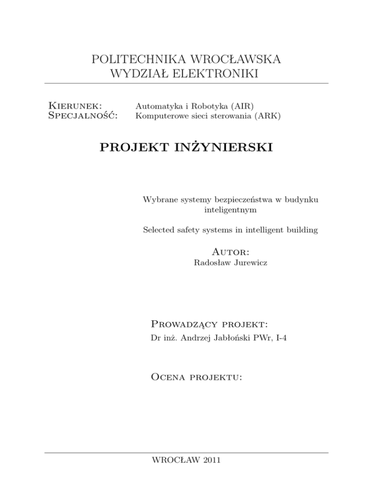 POLITECHNIKA WROCŁAWSKA WYDZIAŁ ELEKTRONIKI Kierunek: Specjalność: Automatyka i Robotyka (AIR) Komputerowe sieci sterowania (ARK) PROJEKT INŻYNIERSKI Wybrane systemy bezpieczeństwa w budynku inteligentnym Selected safety systems in intelligent building Autor: Radosław Jurewicz Prowadzący projekt: Dr inż. Andrzej Jabłoński PWr, I-4 Ocena projektu: WROCŁAW 2011 Rodzicom Wybrane systemy bezpieczeństwa w budynku inteligentnym Spis treści 1 Wstęp 1.1 Założenia projektowe . . . . . . . . . . . . . . . . . . . . . . . . . . . . . . 1.2 Przyjęte oznaczenia . . . . . . . . . . . . . . . . . . . . . . . . . . . . . . . 1.3 Przedstawienie obiektu . . . . . . . . . . . . . . . . . . . . . . . . . . . . . 2 System Sygnalizacji Pożarowej SSP 2.1 Wstęp . . . . . . . . . . . . . . . . . 2.2 Założenia projektowe . . . . . . . . . 2.3 Struktura systemu . . . . . . . . . . 2.4 Zachowanie systemu . . . . . . . . . 2.5 Okablowanie systemu . . . . . . . . . 2.6 Czujniki oraz rozmieszczenie sprzętu 2.6.1 Piętro -1 . . . . . . . . . . . . 2.6.2 Piętro 0 . . . . . . . . . . . . 2.6.3 Piętro 1 . . . . . . . . . . . . 2.6.4 Piętro 2 . . . . . . . . . . . . 2.6.5 Piętro 5 . . . . . . . . . . . . 2.7 Realizacja techniczna . . . . . . . . . 2.7.1 Wybór sprzętu . . . . . . . . 2.7.2 Wykonanie techniczne . . . . . . . . . . . . . . . . . . . . . . . . . . . . . . . . 3 System Sygnalizacji Włamania i Napadu 3.1 Wstęp . . . . . . . . . . . . . . . . . . . 3.2 Założenia projektowe . . . . . . . . . . . 3.3 Struktura systemu . . . . . . . . . . . . 3.4 Okablowanie systemu . . . . . . . . . . . 3.5 Czujniki . . . . . . . . . . . . . . . . . . 3.5.1 Piętro -1 . . . . . . . . . . . . . . 3.5.2 Piętro 0 . . . . . . . . . . . . . . 3.5.3 Piętro 1 . . . . . . . . . . . . . . 3.5.4 Piętro 2 . . . . . . . . . . . . . . 3.5.5 Piętro 5 . . . . . . . . . . . . . . 3.6 Realizacja techniczna . . . . . . . . . . . 3.6.1 Wybór sprzętu . . . . . . . . . . 3.6.2 Wykonanie techniczne . . . . . . 3.7 Zachowanie systemu . . . . . . . . . . . . . . . . . . . . . . . . . . . . . . . . . . . . . . . . . . . . . . . . . . . . . . . . . . . . . . . . . . . . . . . . . . . . . . . . . . . . . . . . . . . . . . . . . . . . . . . . . . . . . . . . . . . . . . . . . . . . . . . . . . . . . . . . . . . . . . . . . . . . . . . . . . . . . . . . . . . . . . . . . . . . . . . . . . . . . . . . . . . . . . . . . . . . . . . . . . . . . . . . . . . . . . . . . . . . . . . . . . . . . . . . . . . . . . . . . . . . . . . . . . . . . . . . . . . . . . . . . . . . . . . . . . . . . . . . . . . . . . . . . . . . . . . . . . . . . . . . . . . . . . . . . . . . . . . . . . . . . . . . . . . . . . . . . . . . . . . . . . . . . . . . . . . . . . . . . . . . . . . . . . . . . . . . . . . . . . . . . . . . . . . . . . . . . . . . . . . . . . . . . . . . . . . . . . . . . . . . . . . . . . . . . . . . . . . . . . . . . . . . . . . . . . . . . . . . . . . . . . . . . . . . . . . . . . . . . . . . . . . Radosław Jurewicz - Projekt Inżynierski - ARK, IIAiR, Politechnika Wrocławska 2011 . . . . . . . . . . . . . . . . . . . . . . . . . . . . 3 3 3 5 . . . . . . . . . . . . . . 6 7 7 8 9 13 13 14 14 15 15 15 16 16 16 . . . . . . . . . . . . . . 19 20 20 21 23 23 24 25 25 25 25 26 26 26 31 1 Wybrane systemy bezpieczeństwa w budynku inteligentnym 4 System telewizji dozorowej CCTV 4.1 Wstęp . . . . . . . . . . . . . . . 4.2 Założenia projektowe . . . . . . . 4.3 Struktura systemu . . . . . . . . 4.4 Okablowanie systemu . . . . . . . 4.5 Kamery . . . . . . . . . . . . . . 4.5.1 Piętro -1 . . . . . . . . . . 4.5.2 Piętro 0 . . . . . . . . . . 4.5.3 Piętro 1 . . . . . . . . . . 4.5.4 Piętro 2 . . . . . . . . . . 4.5.5 Piętro 5 . . . . . . . . . . 4.6 Realizacja techniczna . . . . . . . 4.6.1 Wybór sprzętu . . . . . . 4.6.2 Wykonanie techniczne . . 4.7 Zachowanie systemu . . . . . . . . . . . . . . . . . . . . . . . . . . . . . . . . . . . . . . . . . . . . . . . . . . . . . . . . . . . . . . . . . . . . . . . . . . . . . . . . . . . . . . . . . . . . . . . . . . . . . . . . . . . . . . . . . . . . . . . . . . . . . . . . . . . . . . . . . . . . . . . . . . . . . . . . . . . . . . . . . . . . . . . . . . . . . . . . . . . . . . . . . . . . . . . . . . . . . . . . . . . . . . . . . . . . . . . . . . . . . . . . . . . . . . . . . . . . . . . . . . . . . . . . . . . . . . . . . . . . . . . . . . . . . . . . . . . . . . . . . . . . . . . . . . . . . . . . . . . . . . . . . . . . . . . . . . . . . . . . . . . . . . . . . 32 33 33 33 34 35 35 35 36 37 37 37 37 38 39 5 Uwagi Końcowe 40 Bibliografia 41 Spis rysunków 42 Spis tabel 43 Wykaz urządzeń 44 Radosław Jurewicz - Projekt Inżynierski - ARK, IIAiR, Politechnika Wrocławska 2011 2 Wybrane systemy bezpieczeństwa w budynku inteligentnym Rozdział 1 Wstęp 1.1 Założenia projektowe Systemy bezpieczeństwa są bardzo szerokim tematem, szczególnie w przypadku obiektu tak dużego i wymagającego. Poza tym każdy z systemów osobno jest również rozległy. Założenia dotyczące każdego z nich znajdują się w podległych im rozdziałach. Poniższa lista aplikuje się do wszystkich z nich: (1) Wybrane systemy bezpieczeństwa dla obiektu to System Sygnalizacji Pożarowej(SSP), System Sygnalizacja Włamania i Napadu (SSWiN) oraz System Telewizji Dozorowej(CCTV). Z Systemu Kontroli Dostępu(SKD) zrezygnowano. (2) Wszystkie systemy zostały zaprojektowane dla pięter 1P, 0, 1, 2 oraz 5. Piętra 3 oraz 4 zostały pominięte z powodu ich podobieństwa do pozostałych. (3) W żadnym z projektowanych systemów nie został utworzony jakikolwiek software. Stosowane są schematy blokowe w celu przedstawienia idei działania oraz struktury. (4) Zrezygnowano z urządzeń wejść/peryferyjnych takich jak np. klawiatura, piloty, panele dotykowe itd. (5) Skupiono się na przedstawieniu schematów połączeń elektrycznych dla instalatora systemu. (6) Na rysunkach architektonicznych rozmieszcz