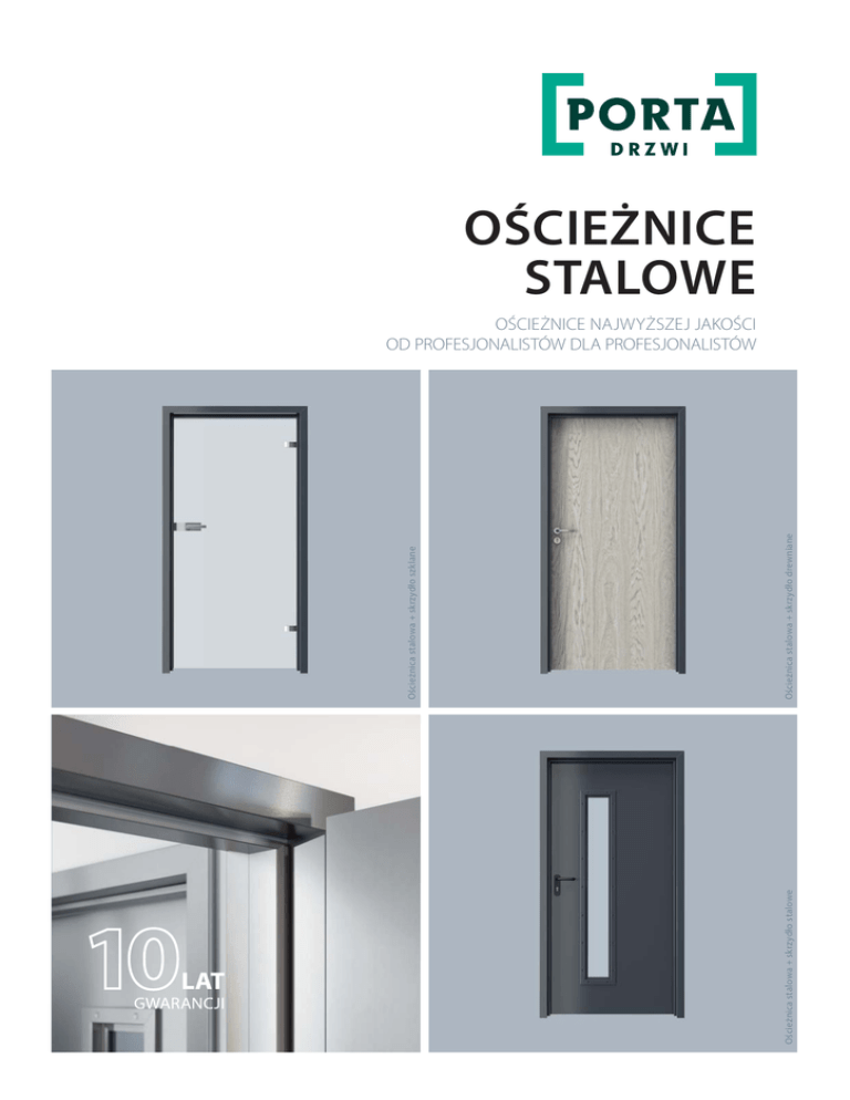 Ościeżnica stalowa + skrzydło stalowe Ościeżnica stalowa + skrzydło drewniane Ościeżnica stalowa + skrzydło szklane OŚCIEŻNICE STALOWE OŚCIEŻNICE NAJWYŻSZEJ JAKOŚCI OD PROFESJONALISTÓW DLA PROFESJONALISTÓW Centrala Grupy PORTA KMI POLAND, Bolszewo, ul. Szkolna 54 Ponad 25 lat doświadczenia w produkcji drzwi PORTA KMI POLAND jest jednym z najbardziej znanych i innowacyjnych producentów drzwi w Polsce i za granicą. W ciągu 25 lat istnienia firmy wyprodukowaliśmy ponad 15 milionów drzwi zarówno drewnianych jak i stalowych. Obecnie posiadamy kilka lokalizacji produkcyjnych - cztery fabryki w Polsce, w tym najnowszą, wybudowaną w 2016 roku fabrykę PORTA STEEL oraz jedną w Rumuni. Dzięki temu możemy zaoferować naszym Klientom kompleksowe rozwiązania z zakresu drzwi drewnianych i metalowych. W każdym miesiącu dziesiątki tysięcy nowych drzwi PORTA znajdują nabywców w Polsce i Europie. Nasze drzwi zainstalowano w wielu prestiżowych obiektach zaprojektowanych przez czołowych architektów i projektantów. Nad każdym etapem produkcji drzwi czuwają wykwalifikowani fachowcy, przyczyniając się do utrzymania wysokiej jakości produktu. Specjaliści z działów Innowacji i R&D nieustannie śledzą trendy światowego designu, dostosowując je do potrzeb Klienta. Fabryki PORTA to 105 tys. m2 powierzchni produkcyjnej i magazynowej. To także synonim nowoczesnych hal produkcyjnych wyposażonych w najnowszej generacji park maszynowy do produkcji skrzydeł i ościeżnic, dostarczony przez wiodących europejskich producentów. Surowce i materiały wykorzystywane w procesie produkcji drzwi wybierane są ze szczególną precyzją i dbałością o jakość. Wszystko po to, aby nasze drzwi mogły przez lata zdobić Twój dom. SPIS TREŚCI 4 . . . . . . . . . . . . . . . . . . . . . . . . . . . . . . . . . . . . . . . . . . . . . . . . . . . . . . . . . . . . . . . . . . . . . . . . . . Fabryka PORTA STEEL 6 . . . . . . . . . . . . . . . . . . . . . . . . . . . . . . . . . . . . . . . . . . . . . . . . . . . . . . . . . . . . . . . . . . Zalety ościeżnic metalowych 8 . . . . . . . . . . . . . . . . . . . . . . . . . . . . . . . . . . . . . . . . . . . . . . . . . . . . . . . . . . . Jedna ościeżnica / wiele możliwości 10 . . . . . . . . . . . . . . . . . . . . . . . . . . . . . . . . . . . . . . . . . . . . . . . . . . . . . . Podstawowe informacje o ościeżnicach 12 . . . . . . . . . . . . . . . . . . . . . . . . . . . . . . . . . . . . . . . . . . . . . . . . . . . . . . . . . . . . . . . . . . Rodzaje stosowanych blach 14 . . . . . . . . . . . . . . . . . . . . . . . . . . . . . . . . . . . . . . . . . . . . . . . . . . . . . . . . . . . . . . . . . Zastosowanie ościeżnic Porta NAROŻNE 9 . . . . . . . . . . . . . . . . . . . . . . . . . . . . . . . . . . . . . . . . . . . . . . . . . . Przykłady zastosowań ościeżnic metalowych 30 . . . . . . . . . . . . . . . . . . . . . . . . . . . . . . . . . . . . . . . . . . . . . . . . . . . . . . . . . . . . . . . . . . . . . . . . . . . . . . . . . NAŚWIETLA 32 . . . . . . . . . . . . . . . . . . . . . . . . . . . . . . . . . . . . . . . . . . . . . . . . . . . . . . . . . . . . . . . . . . . . . . . . . . . . Sposoby montażu 36 . . . . . . . . . . . . . . . . . . . . . . . . . . . . . . . . . . . . . . . . . . . . . . . . . . . . . . . . . . . . . . . . . . . . . . . . . . . . . . . . . . . . Akcesoria 38 . . . . . . . . . . . . . . . . . . . . . . . . . . . . . . . . . . . . . . . . . . . . . . . . . . Tabele wymiarów standardowych ościeżnic 40 . . . . . . . . . . . . . . . . . . . . . . . . . . . . . . . . . . . . . . . . . . . . . . . . . . . . . . . . . . . . . Kompleksowa oferta Porta Drzwi OBEJMUJĄCE 26 . . . . . . . . . . . . . . . . . . . . . . . . . . . . . . . . . . . . . . . . . . . . . . . . . . . . . . . . . . . . . . . . . . . . Ościeżnice OBEJMUJĄCE NAŚWIETLA 22 . . . . . . . . . . . . . . . . . . . . . . . . . . . . . . . . . . . . . . . . . . . . . . . . . . . . . . . . . . . . . . . . . . . . . . . . . Ościeżnice KĄTOWE KĄTOWE 18 . . . . . . . . . . . . . . . . . . . . . . . . . . . . . . . . . . . . . . . . . . . . . . . . . . . . . . . . . . . . . . . . . . . . . . . . Ościeżnice NAROŻNE Fabryka PORTA STEEL NOWOCZESNY PARK MASZYNOWY KOMPLEKSOWE DORADZCTWO W pełni zautomatyzowana lakiernia i 1,5 km długości systemu transportu podwieszanego, to tylko niektóre wizytówki najnowszej fabryki Porta. Najnowocześniejszy park maszynowy od czołowych europejskich producentów to jeden z kluczowych elementów gwarantujących rzadko spotykaną wydajność, elastyczność i precyzję wykonania. Doświadczony zespół wysoko wykwalifikowanych doradców technicznych dba o to, aby każdy Klient otrzymał produkt o oczekiwanych parametrach, zgodny z normami prawa budowlanego. Dla Klientów inwestycyjnych opracowywana jest specjalna, dedykowana oferta spełniająca warunki określone przez architekta obiektu. NAJNOWSZA I NAJNOWOCZEŚNIEJSZA FABRYKA PORTA W 2016 roku Firma PORTA przeniosła produkcję drzwi i ościeżnic stalowych do jednego z najnowocześniejszych zakładów w Europie, dzięki czemu znalazła się w gronie jedynie kilku europejskich firm posiadających tak kompleksową ofertę. Nowy zakład jest zlokalizowany obok już istniejącej fabryki w Ełku i zajmuje łączną powierzchnię ok. 14,5 tys m2. Warta ponad 70 mln zł inwestycja pozwala osiągnąć nienotowaną wcześniej wydajność jednej ościeżnicy na minutę. Nowoczesny system podwieszanego transportu o długości 1,5 km będący krwiobiegiem dla 75 nowczesnych specjalistycznych maszyn to tylko niektóre wizytówki PORTA STEEL. Fabryka jest przyjazna środowisku. Inteligentne planowanie pozwala na pełną kontrolę nad odpadami. Unikatowa, zautomatyzowana linia do produkcji ościeżnic, nowoczesna lakiernia i cały park maszynowy od czołowych producentów europejskich powodują, że PORTA STEEL to jedna z najnowocze