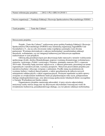 Numer referencyjny projektu: 2012-1-PL1-GRU14-29185 1 Nazwa organizacji: Fundacja Edukacji i Rozwoju Społeczeństwa Obywatelskiego FERSO Tytuł projektu: Taste the Culture! Streszczenie projektu: Projekt „Taste the Culture!” realizowany przez polską Fundację Edukacji i Rozwoju Społeczeństwa Obywatelskiego (FERSO) oraz niemiecką organizację Jugendhilfe Und Socialarbeit e.V., ma na celu stworzenie stałej współpracy pomiędzy tymi dwoma partnerami. Wymiana doświadczeń z zakresu nieformalnej i pozaformalnej edukacji dorosłych, wolontariatu, czy też integracji kulturowej jest kluczowym aspektem realizowanym w tym projekcie. Główną ideą przedsięwzięcia jest aktywizacja ludzi starszych z terenów wykluczenia społecznego (Łódź, okolice Brandenburga), poprzez wymianę dwanaściorga wolontariuszyseniorów, sześciorga z Polski i sześciorga z Niemiec, pomiędzy marcem 2013, a marcem 2014 roku. Warsztaty będą zawierać zajęcia m.in. z zakresu gotowania, prezentacji na temat regionalnych i narodowych dań, wymiany przepisów. Motywem przewodnim projektu jest narodowa kuchnia i obyczaje związane z jedzeniem. Posiłki staną się pretekstem do wymiany kultury i tradycji danych państw, a także sposobnością do nabycia nowych umiejętności edukacyjnych, a także organizacyjnych. Ważnymi aspektami są także sprawy związane ze zwiększeniem mobilności ludzi po pięćdziesiątym roku życia, polepszeniem dialogu międzypokoleniowego, oraz aktywizacją społeczności lokalnych (które szczególnie w Europie Wschodniej jest bardzo niska). Organizatorzy projektu zamierzają udowodnić, iż przy użyciu odpowiedniej motywacji osoby starsze mogą stać się aktywnymi obywatelami wnoszącymi wiele do świadomości kulturowej, ponadnarodowego dialogu, czy też jakości edukacji nieformalnej. 1 Numer referencyjny projektu: 2012-1-SI1-GRU14-04244 2 Nazwa organizacji: Bytomski Ośrodek Edukacji Tytuł projektu: The International Bridges – Volunteering Connects Us. International learning, socializing and volunteering. Streszczenie projektu: Zarówno Bytomski Ośrodek Edukacji, jak i organizacja RIC Novo Mesto koordynują działania Uniwersytetów Trzeciego Wieku. Projekt „Międzynarodowych mostów” ma na celu zachęcenie seniorów do wolontariatu na poziomie lokalnym, narodowym i europejskim. Głównym motywem przedsięwzięcia jest temat aktywnego starzenia, walki z wykluczeniem społecznym osób starszych oraz poprawy jakości życia. W czasie projektu 4 wolontariuszy z Bytomia wyjedzie na 3 tygodnie do Novo Mesto i na odwrót. Zajęcia słuchaczy będą dotyczyły dziedzictwa narodowego oraz tradycyjnej kuchni. Seniorzy dzięki wspólnym warsztatom z zakresu gotowania poznają kulturę, historię i tradycję Polski i Słowenii. Poprawią zdolności lingwistyczne, socjalne oraz międzykulturowe. Projekt skierowany jest do ludzi z terenów wiejskich, którzy nie mieli okazji do poznania innych kultur i krajów. Efektem końcowym ma być książka kucharska z daniami obu państw. Organizatorzy liczą, iż dzięki wymianie doświadczeń i wiedzy związanych z edukacją nieformalną osób starszych uda się stworzyć długoterminową współpracę pomiędzy organizacjami z Polski i Słowenii. 2 Numer referencyjny projektu: 2012-1-PL1-GRU14-29179 1 Nazwa organizacji: Stowarzyszenie Nowa Rodzina Tytuł projektu: Sharing experiences and cultures Streszczenie projektu: „Dzielenie się doświadczeniami i kulturą” to projekt realizowany przez Stowarzyszenie Nowa Rodzina i Vilniaus Gabrielės Petkevičaitės-Bitės suaugusiųjų mokymo centras, którego głównym celem jest wymiana doświadczeń i umiejętności z zakresu sztuki i kultury. W czasie projektu 6 wolontariuszy z Wrocławia wyjedzie na 3 tygodnie do Wilna i na odwrót. Wolontariusze odbędą warsztaty z zakresu malarstwa, tańca, decoupage oraz ikebany. Zadaniem seniorów będzie podzielenie się wiedzą i umiejętnościami artystycznym związanymi ze swoją ojczyzną. Zorganizowane zostaną spotkania ze społecznością lokalną, na których wolontariusze przedstawią sztukę, kuchnię oraz zwyczaje rodzimego kraju. Projekt ten skierowany jest do ludzi po 50 roku życia, nie mających możliwości odbycia podróży zagranicznych we własnym zakresie. Organizatorzy przedsięwzięcia liczą na polepszenie zdolności lingwistycznych, kulturowych, socjalnych i artystycznych swoich słuchaczy, a także na zwiększenie pewności siebie i motywacji do propagowania zdobytych umiejętności i wiedzy pośród własnej społeczności lokalnej. Partnerzy projektu mają nadzieję, iż tego typu działania aktywizacji ludzi starszych obalą stereotypy i bariery kulturowe pomiędzy krajami, przyczyniając się do stałej współpracy pomiędzy organizacjami partnerskimi. 3 Numer referencyjny projektu: 2012-1-PL1-GRU14-29178 1 Nazwa organizacji: Centrum Inicjatyw UNESCO Tytuł projektu: PolaCzek – old good times Streszczenie projektu: W projekcie „PolaCzek – old good times” realizowanym przez Centrum Inicjatyw UNESCO oraz LOS – Liberecka Obcanska Spolecnost, bierze udział 5 wolontariuszy z Polski i 3 wolontariuszy z Czech (w wieku 51-61 lat), którzy spędzą odpowiednio po 4 tygodnie w Libercu i 3 tygodnie we Wrocławiu. Głównym celem projektu jest nauka języka polskiego i czeskiego oraz polepszenie umiejętności dydaktycznych z zakresu nauki rodzimego języka względem obcokrajowców. Poprzez różnego rodzaju aktywności jak: animacje językowe, konserwatoria, uczenie się poprzez sztukę czy wspólne gotowanie, uczestnicy projektu poznają język i kulturę sąsiedniego państwa (pomogą w tym wycieczki do teatru, kina, cz też różnego rodzaju festiwale). Oprócz zwiększenia umiejętności lingwistycznych wolontariusze podniosą swoje kompetencje informatyczne za sprawną aktywnego uczestnictwa w tworzeniu wspólnej strony internetowej. Innym owocem pracy ma być polsko-czeska książka kucharska. Ważnym e