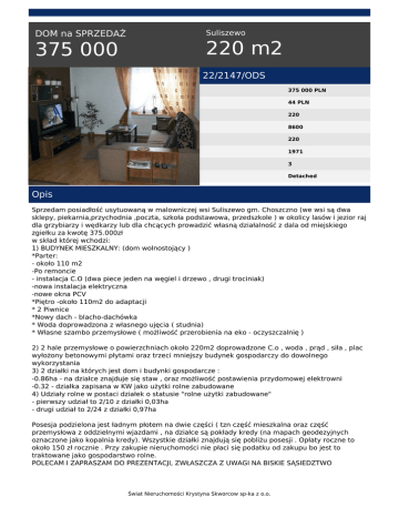 DOM na SPRZEDAŻ 375 000 Suliszewo 220 m2 22/2147/ODS 375 000 PLN 44 PLN 220 8600 220 1971 3 Detached Opis Sprzedam posiadłość usytuowaną w malowniczej wsi Suliszewo gm. Choszczno (we wsi są dwa sklepy, piekarnia,przychodnia ,poczta, szkoła podstawowa, przedszkole ) w okolicy lasów i jezior raj dla grzybiarzy i wędkarzy lub dla chcących prowadzić własną działalność z dala od miejskiego zgiełku za kwotę 375.000zł w skład której wchodzi: 1) BUDYNEK MIESZKALNY: (dom wolnostojący ) *Parter: - około 110 m2 -Po remoncie - instalacja C.O (dwa piece jeden na węgiel i drzewo , drugi trociniak) -nowa instalacja elektryczna -nowe okna PCV *Piętro -około 110m2 do adaptacji * 2 Piwnice *Nowy dach - blacho-dachówka * Woda doprowadzona z własnego ujęcia ( studnia) * Własne szambo przemysłowe ( możliwość przerobienia na eko - oczyszczalnię ) 2) 2 hale przemysłowe o powierzchniach około 220m2 doprowadzone C.o , woda , prąd , siła , plac wyłożony betonowymi płytami oraz trzeci mniejszy budynek gospodarczy do dowolnego wykorzystania 3) 2 działki na których jest dom i budynki gospodarcze : -0.86ha - na działce znajduje się staw , oraz możliwość postawienia przydomowej elektrowni -0.32 - działka zapisana w KW jako użytki rolne zabudowane 4) Udziały rolne w postaci działek o statusie "rolne użytki zabudowane" - pierwszy udział to 2/10 z działki 0,03ha - drugi udział to 2/24 z działki 0,97ha Posesja podzielona jest ładnym płotem na dwie części ( tzn część mieszkalna oraz część przemysłowa z oddzielnymi wjazdami , na działce są pokłady kredy (na mapach geodezyjnych oznaczone jako kopalnia kredy). Wszystkie działki znajdują się pobliżu posesji . Opłaty roczne to około 150 zł rocznie . Przy zakupie nieruchomości nie płaci się podatku od zakupu bo jest to traktowane jako gospodarstwo rolne. POLECAM I ZAPRASZAM DO PREZENTACJI, ZWŁASZCZA Z UWAGI NA BISKIE SĄSIEDZTWO Świat Nieruchomości Krystyna Skworcow sp-ka z o.o. UROKLIWEGO POWIATOWEGO MIASTECZKA CHOSZCZNO przy jeziorze w środku miasta ,w otoczeniu innych jezior lasów i Puszczy Drawskiej, w który są dworce- PKP i Autobusowy, UrzadyMiasta , Starostwo, Urzad Skarbowy , ZUS , Prokuratura, Sąd,Policja, kilka aptek , dwie parafie i dwa kościoły, szkoły średnie, zawodowe, gimnazjum, podstawowe, przedszkola . Liczne Centra handlowe -Intermarsche , Brikomarsche , Media Mark,Netto, Biedronka , Lidl, Aldic, Tesco , składy budowlane,mniejsze sklepy i sklepiki. Niewątpliwą atrakcją wykorzystywaną przez mieszkańców jest całodobowa oświetlona promenada wokół jeziora ze scieżką zdrowia w przylegającym parku. Przez kluby sportowe z kraju i zagranicy organizowane sa kilka razy do roku szkolenia i imprezy sportowe, zawody pływackie kajakowe, nurkowe. Piękna miejska plaża i obok całoroczny kryty basen - pływalnia są atutem dla ceniących zdrowie i tego rodzaju rozrywkę . Nie sposób nie wspomnieć o szpitalu z kilkoma oddziałami i jednym z najlepszych w Polsce ośrodków rehabilitacyjnych. Bliskość Puszczy Drawskiej wraz z rzeką Drawą i Korytnicą cieszą się organizowanymi spływami kajakowymi i dopełniają walory atrakcyjności lokalizacyjne niniejszej oferty. Oferta atrakcyjna ze względu na dobrą lokalizację i atrakcyjną cenę !!!POLECAM! i ZAPRASZAM DO PREZENTACJI Kierując się zasadami Kodeksu etyki zawodowej oraz Standardami zawodowymi pośredników w obrocie nieruchomościami, zapewniamy pośrednictwo w obrocie nieruchomościami - kupno, sprzedaż oraz wynajem - we współpracy z profesjonalnymi, licencjonowanymi i wyselekcjonowanymi biurami nieruchomości działającymi w Systemie Wymiany Ofert, fachową i kompleksową obsługę realizowanych transakcji w miłej i przyjaznej atmosferze, a także oferujemy bezpłatne doradztwo w zakresie doboru kredytu hipotecznego, analizy zdolności kredytowej oraz bezpłatna pomoc w jego uzyskaniu. Powyższa oferta ma charakter informacyjny i nie stanowi oferty handlowej w rozumieniu art. 66 §1 kodeksu cywilnego oraz innych właściwych przepisów prawnych. Treść ma charakter informacyjny i zalecamy jej osobistą weryfikację. Kontaktując się z biurem Klient wyraża zgodę na przetwarzanie danych osobowych zgodnie z przepisami ustawy z dnia 29 sierpnia 1997 roku o ochronie danych osobowych / Dz.U.Nr. 133 poz. 883/. Klientowi przysługuje prawo do wglądu do swoich danych osobowych i ich aktualizacji. Oferujemy duży wybór nieruchomości, darmowe dodawanie ofert, niezobowiązujące prezentacje, bezpłatna pomoc w uzyskaniu kredytu. Świat Nieruchomości Krystyna Skworcow ul. Chrobrego 5a (Starówka) 73-110 Stargard Szczeciński Tel: 500 296 440 , 915780827 [email protected] mgr Krystyna Skworcow tel. 500 296 440 tel. 91 578 0827 email: [email protected] Świat Nieruchomości Krystyna Skworcow sp-ka z o.o. Powered by TCPDF (www.tcpdf.org)