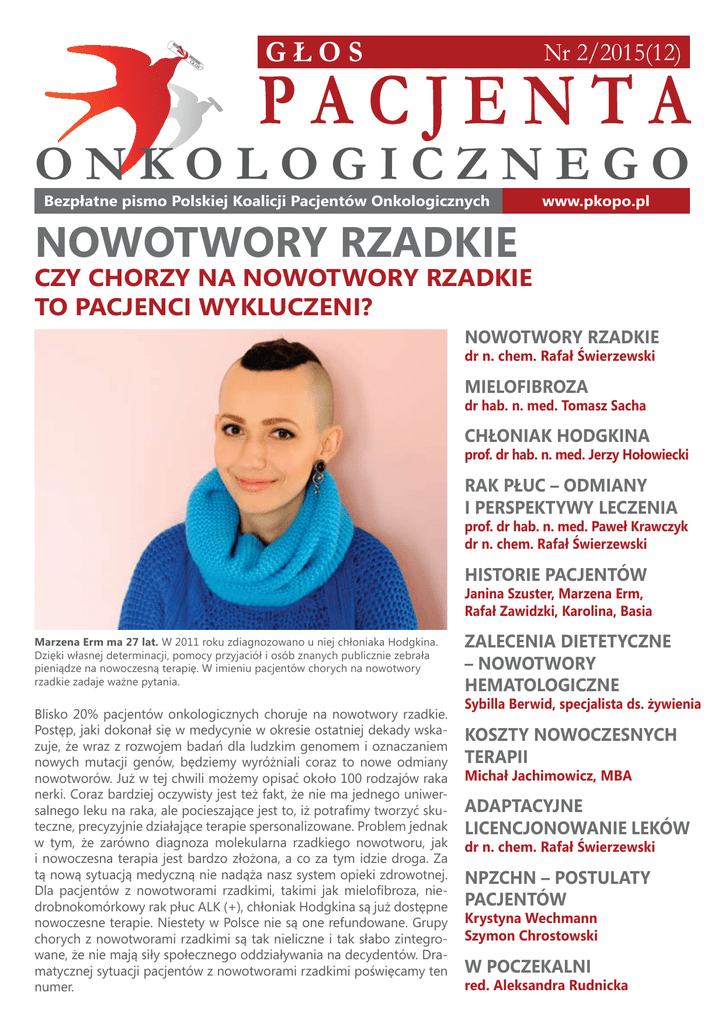 GŁ OS GŁOS Nr 2/2015(12) ONKOLOGICZNEGO Bezpłatne pismo Polskiej Koalicji Pacjentów Onkologicznych www.pkopo.pl Nowotwory rzadkie czy chorzy na nowotwory rzadkie to pacjenci wykluczeni? Nowotwory rzadkie dr n. chem. Rafał Świerzewski Mielofibroza dr hab. n. med. Tomasz Sacha Chłoniak Hodgkina prof. dr hab. n. med. Jerzy Hołowiecki Rak płuc – odmiany i perspektywy leczenia prof. dr hab. n. med. Paweł Krawczyk dr n. chem. Rafał Świerzewski Historie Pacjentów Janina Szuster, Marzena Erm, Rafał Zawidzki, Karolina, Basia Marzena Erm ma 27 lat. W 2011 roku zdiagnozowano u niej chłoniaka Hodgkina. Dzięki własnej determinacji, pomocy przyjaciół i osób znanych publicznie zebrała pieniądze na nowoczesną terapię. W imieniu pacjentów chorych na nowotwory rzadkie zadaje ważne pytania. Blisko 20% pacjentów onkologicznych choruje na nowotwory rzadkie. Postęp, jaki dokonał się w medycynie w okresie ostatniej dekady wskazuje, że wraz z rozwojem badań dla ludzkim genomem i oznaczaniem nowych mutacji genów, będziemy wyróżniali coraz to nowe odmiany nowotworów. Już w tej chwili możemy opisać około 100 rodzajów raka nerki. Coraz bardziej oczywisty jest też fakt, że nie ma jednego uniwersalnego leku na raka, ale pocieszające jest to, iż potrafimy tworzyć skuteczne, precyzyjnie działające terapie spersonalizowane. Problem jednak w tym, że zarówno diagnoza molekularna rzadkiego nowotworu, jak i nowoczesna terapia jest bardzo złożona, a co za tym idzie droga. Za tą nową sytuacją medyczną nie nadąża nasz system opieki zdrowotnej. Dla pacjentów z nowotworami rzadkimi, takimi jak mielofibroza, niedrobnokomórkowy rak płuc ALK (+), chłoniak Hodgkina są już dostępne nowoczesne terapie. Niestety w Polsce nie są one refundowane. Grupy chorych z nowotworami rzadkimi są tak nieliczne i tak słabo zintegrowane, że nie mają siły społecznego oddziaływania na decydentów. Dramatycznej sytuacji pacjentów z nowotworami rzadkimi poświęcamy ten numer. Zalecenia dietetyczne – nowotwory hematologiczne Sybilla Berwid, specjalista ds. żywienia koszty nowoczesnych terapii Michał Jachimowicz, MBA Adaptacyjne licencjonowanie leków dr n. chem. Rafał Świerzewski NPZChN – postulaty pacjentów Krystyna Wechmann Szymon Chrostowski W poczekalni red. Aleksandra Rudnicka Temat numeru Nowotwory rzadkie – sytuacja w Polsce i w Europie Według definicji za rzadką można uznać chorobę wówczas, kiedy występuje ona u jednej na dwa tysiące osób. Statystycznie, każda z chorób rzadkich dotyczy niewielkiej ilości pacjentów. Do tej pory zostało opisanych ponad 8000 chorób rzadkich, co w skali europejskiej daje ponad 30-milionową grupę osób, które cierpią na te choroby[1]. Dlatego od wielu lat problematyka chorób rzadkich nie schodzi z piedestałów europejskich programów zdrowotnych, naukowych i społecznych. Rozwój medycyny i metod diagnostycznych, w tym opartych na badaniach genetycznych, pozwala obecnie na wykrywanie chorób, których istnienia wcześniej nie można było udowodnić. Pacjenci pozostawali w niepewności i niewiedzy, bez szans na jakiejkolwiek leczenie wobec braku prawidłowej i jednoznacznej diagnozy. Rzeczywistość pacjentów onkologicznych, cierpiących na rzadkie odmiany nowotworów, była i nadal jest pełna skrajności. NIEDROBNOKOMÓRKOWY RAK PŁUC ALK (+) – skrajność ilościowa Rak płuc od wielu dekad jest najczęściej występującą odmianą chorób nowotworowych w wielu krajach świata. W 2012 roku, w Europie zanotowano łącznie ponad 410 tys. zachorowań na raka płuc[2]. W Polsce, każdego roku notuje się około 15 tys. nowych przypadków. Najczęściej występującą odmianą raka płuc jest rak niedrobnokomórkowy (NDRP), który jest stwierdzany u około 80% pacjentów, co oznacza ponad 13 tys. chorych rocznie. Dzięki badaniom genetycznym, było możliwe określenie bardzo rzadkiej odmiany niedrobnokomórkowego raka płuca z tzw. mutacją ALK (+) oznaczającą uszkodzenie genu regulującego szlak sygnałowy komórek nowotworowych. Z badań przeprowadzonych 2 w Polsce wynika, iż ta charakterystyczna odmiana NDRP występuje rocznie u 2–5% pacjentów, czyli u 100–160 osób [3], co jednoznacznie kwalifikuje tą konkretną odmianę raka płuc do chorób rzadkich. Paradoksalnie, odmiana ta dotyka najczęściej młodych i niepalących mężczyzn[4]. NDRP ALK (+) jest więc przykładem skrajności ilościowej – dotyczy najmniejszej grupy pacjentów w największej grupie chorych onkologicznie. MIELOFIBROZA – SKRAJNOŚĆ KLASYFIKACYJNA Mielofibroza zaliczana jest do chorób mieloproliferacyjnych, które powodują uszkodzenie procesu wytwarzania komórek krwi w szpiku kostnym. Bez wątpienia mielofibroza jest chorobą rzadką, ponieważ choruje na nią 1 osoba na 100 tysięcy[5]. Z uwagi na objawy komórkowe, mielofibroza, według międzynarodowej klasyfikacji chorób, znajduje się wśród zespołów proliferacyjnych, które stanowią odrębną grupę wśród chorób krwi (oznaczenie ICD-10: D47) i nie należą do chorób nowotworowych (oznaczenie ICD-10: C). Dlatego też, polski Krajowy Rejestr Nowotworów nie uwzględnia mielofibrozy. Zarówno pacjenci z NDRP ALK (+), jak i mielofibrozą nie mają zwykle dobrych rokowań. To trudne do leczenia typy nowotworów rzadkich, dla których mediana średnich przeżyć wynosi od 10 miesięcy do 5 lat. zachorowań[2]. W zależności od stopnia zaawansowania wyleczalność ziarnicy złośliwej wynosi od 50 do 95%[6]. Wśród nowotworowych chorób rzadkich jest to swoistym, bardzo optymistycznym rekordem. Ogólnie chłoniaka Hodgkina można wyleczyć u 9 z 10 pacjentów. SUMMARUM SKRAJNOŚCI Prawie 90% chorób rzadkich, w tym onkologicznych, ma swoją genezę w genetyce. To powoduje, że w przeciwieństwie do chorób populacyjnych, mogą one mieć różne objawy i różny przebieg u różnych pacjentów, nawet u tych z tą samą „diagnostycznie” chorobą rzadką.