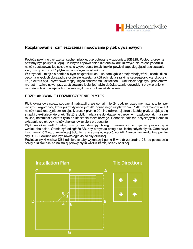 Rozplanowanie rozmieszczenia i mocowanie płytek dywanowych PodłoŜe powinno być czyste, suche i płaskie, przygotowane w zgodnie z BS5325. Podłogi z drewna powinny być pokryte sklejką lub innych odpowiednich materiałów arkuszowych Na całość posadzki naleŜy zastosować lepiszcze w celu wytworzenia trwale lepkiej powłoki zapobiegającej przesuwaniu się „luźno połoŜonych” płytek w normalnym natęŜeniu ruchu. W przypadku miejsc o bardzo silnym natęŜeniu ruchu, np. tam, gdzie przejeŜdŜają wózki, chodzi duŜo osób na wysokich obcasach, stosuje się krzesła na kółkach, stoją szafki na segregatory, kserokopiarki itp., niektóre płytki dywanowe mogą ulegać znacznemu uszkodzeniu. Uniknięcie tego typu problemów nie jest moŜliwe nawet przy zastosowaniu kleju, jednakŜe doświadczenie dowodzi, iŜ przyklejenie ich na stałe w takich miejscach znacznie wydłuŜa ich okres uŜytkowania. ROZPLANOWANIE I ROZMIESZCZENIE PŁYTEK Płytki dywanowe naleŜy poddać klimatyzacji przez co najmniej 24 godziny przed montaŜem, w temperaturze i wilgotności, która przewidywana jest dla normalnego uŜytkowania. Płytki Heckmondwike FB naleŜy kłaść rotacyjnie zmieniając kierunek płytki o 90º. Na odwrotnej stronie kaŜdej płytki znajdują się strzałki określające kierunek Niektóre płytki nadają się do kładzenie zarówno mozaikowo jak i na szerokość, natomiast niektóre tylko do kładzenia mozaikowego. Odnośnie zaleceń dotyczących kierunku układania się okrywy naleŜy skonsultować się z producentem. Płytki rozłoŜyć wzdłuŜ jednej ściany pozostawiając brzeg o szerokości co najmniej połowy płytki wzdłuŜ obu ścian. Odmierzyć odległość AB, aby otrzymać brzeg plus liczbę całych płytek. Odmierzyć i zaznaczyć CD na przeciwległej ścianie na tę samą odległość, co AB. Narysować kredą linię pomiędzy D i B. Powinna ona być równoległa do ściany dłuŜszej. RozłoŜyć płytki wzdłuŜ DB i odmierzyć, aby wyznaczyć punkt E w pobliŜu środka DB, co pozostawia brzeg o szerokości co najmniej połowy płytki wzdłuŜ kaŜdej ściany bocznej. Za pomocą przykładnicy lub odmierzając trójkąt 3:4:5, tak jak na schemacie, wyznaczyć linię FEG w taki sposób, aby była ona dokładnie pod kątem prostym do DB. NałoŜyć na powierzchnię, którą jest się w stanie obsłuŜyć, klej STYCCOBOND F41 i pozostawić do pełnego wyschnięcia. Kłaść płytki dokładnie brzegami wzdłuŜ linii rozpoczynając od punktu E. Kłaść kolejne rzędy upewniając się, Ŝe pierwsza płytka przylega dokładnie brzegiem do linii EF. Kłaść do końca tej części podłogi. Kładąc płytki mocno dociskać dłonią i przejeŜdŜać kciukiem dookoła krawędzi, aby zapewnić całkowitą styczność z klejem i pozbyć się powietrza. Kłaść płytki na kolejnych częściach podłogi w taki sam sposób. MOCOWANIE PŁYTEK BRZEGOWYCH PołoŜyć płytkę, która ma być przycięta, zgodnie z jej prawidłowym kierunkiem wzoru i umieścić ją dokładnie na ostatniej płytce w rzędzie. Przytknąć drugą płytkę od ściany i połoŜyć tak, aby zachodziła na płytkę, która ma być przycięta. Zaznaczyć miejsce, w którym tylna krawędź górnej płytki zachodzi na płytkę spodnią. Usunąć płytki i równo uciąć płytkę brzegową ostrym noŜem. Część znajdująca się dalej od ściany powinna teraz przesunąć się do przodu i dokładnie pasować do pozostawionego brzegu. Tę samą metodę moŜna zastosować do dopasowania płytek wokół framug drzwi, ościeŜnic itp. MoŜna teŜ zrobić dokładny szablon ze sztywnego kartonu i przenieść ten kształt na płytkę, która ma być przycięta. Po umieszczeniu szablonu we właściwej pozycji na podłodze przykleić na wierzchu kilka kawałków dwustronnej taśmy. PołoŜyć płytkę brzegową we właściwej pozycji i obniŜać ją do taśmy klejącej, aby dokładnie umieścić szablon na spodzie płytki. MoŜna ją następnie podnieść i przyciąć odpowiednio do kształtu szablonu. Po połoŜeniu płytek na całej podłodze docisnąć w obie strony wałkiem lub łopatką, zgodnie z zaleceniami producenta wykładziny. Przedstawiciel na terenie Polski: Polyflor Polska Sp. z o.o. Ul. Gronowa 22/506-510, 61-680 Poznań Tel. 061-8203155, fax: 061-8203135, e-mail: [email protected]