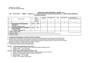 Załącznik Nr 4 do SIWZ NS :SPSW/NZ-2263/60/PN/2008 CPV Lp. 33.14.16.25-7 FORMULARZ ASORTYMENTOWO - CENOWY Nr 1 PAKIET I Zadanie nr 1 - Testy do oznaczania autoprzeciwciał ANA-HEp 2 i ANCA metodą szkiełkowej immunofluorescencji Nazwa artykułu 1 2 1. Przeciwciała przeciwjądrowe ANA-HEp 2 (metoda: szkiełkowa FIA) 2. Przeciwciała przeciw antygenom neutrofili ANCA (metoda: szkiełkowa FIA) Wartość netto i brutto : Słownie zł netto : Słownie zł brutto: J.m. 3 Ilość testów na Okres 24 miesięcy 4 testy 3 000 testy 200 Cena jedn. netto zł Wartość netto zł VAT % 5 6 7 Wartość brutto zł 8 1. Wymagania Zamawiającego w zakresie przedmiotu zamówienia: 1/ Kompletne zestawy diagnostyczne do oznaczania w surowicy przeciwciał metodą szkiełkowej immunofluorescencji pośredniej (IFA) 2/ Zestawy testowe muszą zawierać komplet reagentów potrzebnych do wykonania badania: preparat tkankowy lub rozmaz komórek utrwalony na szkiełku mikroskopowym (substrat), surowice kontrolne pozytywne i negatywne (gotowe do użycia), surowica anty-ludzka znakowana FITC (gotowa do użycia), PBS, Tweed, szkiełka nakrywkowe. 3/ Na każdym polu reakcyjnym znajduje się kilka substratów. 4/ W razie potrzeby Wykonawca zapewni bezpłatne szkolenie. Ad. poz. 1 Przeciwciała przeciwjądrowe ANA - HEp 2 Substrat: komórki HEp-2 i wątroba MAŁPY NA JEDNYM OKIENKU DIAGNOSTYCZNYM Wielkość zestawu: max. 100 testów Trwałość: min. 3 miesiące od daty dostawy Ad. poz. 2 Przeciwciała przeciw antygenom neutrofili ANCA: Substrat: ludzkie granulocyty utrwalone etanolem, ludzkie granulocyty utrwalone formaliną, Komórki HEp-2 i wątroba małpy na jednym okienku diagnostycznym, Kontrole pozytywne: cANCA, pANCA Wielkość zestawu: max. 50 testów Trwałość: min. 6 miesięcy od daty dostawy Numer katalogowy oferowanego asortymentu 9 2. Wymagana dokumentacja ofertowa i oświadczenia Wykonawcy - zgodnie z opisem zawartym w rozdz. III SIWZ. 3. Wykonawca dołączy do oferty: Ulotki metodyczno – techniczne oferowanych zestawów diagnostycznych – testów, zawierające: opis metody badawczej, skład zestawu diagnostycznego oraz szczegółową instrukcją wykonywania testów. …………………………………… dnia …………………………………..2008r …………………………………………… (pieczątka i podpis Wykonawcy) Załącznik Nr 4 do SIWZ NS :SPSW/NZ-2263/60/PN/2008 CPV Lp. 33.14.16.25-7 FORMULARZ ASORTYMENTOWO - CENOWY Nr 2 PAKIET I Zadanie nr 2 - Testy do diagnostyki chorób zakaźnych i autoimmunologicznych metodą ELISA Oraz dzierżawa sprzętu i oprogramowania umożliwiającego wykonanie testów ELISA Nazwa artykułu 1 2 1. 2. 3. Przeciwciała anty- CCP w klasie IgG (przeciwciała przeciw białkom bogatym w cytrulinę) Przeciwciała przeciw Borrelia w klasie IgM (obejmujący gatunki B. Burgdorferi, B. Afzelii, B. Garinii Przeciwciała przeciw Borrelia w klasie IgG (obejmujący gatunki B. Burgdorferi, B. Afzelii, B. Garinii 4. Przeciwciała przeciw transglutaminazie tkankowej w klasie IgA 5. Przeciwciała przeciw transglutaminazie tkankowej w klasie IgG 6. Przeciwciała przeciw Toxocara canis w klasie IgG Wartość netto i brutto : Słownie zł netto : Słownie zł brutto: J.m. 3 Ilość testów na Okres 24 miesięcy 4 testy 1 344 testy 1 728 testy 1 728 testy 576 testy 384 testy 384 Cena jedn. netto zł Wartość netto zł VAT % 5 6 7 Wartość brutto zł 1. Wymagania Zamawiającego w zakresie przedmiotu zamówienia. Kompletne zestawy diagnostyczne do ilościowego oznaczania surowicy krwi przeciwciał metodą ELISA na mikropłytkach 8 Numer katalogowy oferowanego asortymentu 9 Ad. poz. 1/ przeciwciała anty- CCP w klasie IgG – test ilościowy, antygen: rekombinowany peptyd Ad. poz. 2/ przeciwciała przeciw Borrelia w klasie IgM – test ilościowy, antygen: pełen ekstrakt Borrelia ( B. Burgdorferi, B. Afzelii, B. Garinii) Ad. poz. 3/ przeciwciała przeciw Borrelia w klasie IgG – test ilościowy, antygen: pełen ekstrakt Borrelia (B. Burgdorferi, B. Afzelii, B. Garinii plus rekombinant VisE) Ad. poz. 4/ przeciwciała przeciw transglutaminazie tkankowej w klasie IgA (tTG IgA) – test ilościowy lub półilościowy, antygen: rekombinowany ludzka transglutaminaza Ad. poz. 5/ przeciwciała przeciw transglutaminazie tkankowej w klasie IgG (tTG IgG) – test ilościowy lub półilościowy, antygen: rekombinowany ludzka transglutaminaza Ad. poz. 6/ przeciwciała przeciw Toxocara canis w klasie IgG – test ilościowy lub półilościowy, antygen: Toxocara canis. 2. Zestaw powinien zawierać: Mikropłytki opłaszczone antygenem typu beak- off ( dzielone studzienki ), kalibratory, surowice kontrolne : pozytywna i negatywna, koniugat enzymatyczny, bufor do rozcieńczania próbek, substrat i roztwór stopujący ( gotowe do użycia ), bufor do płukania. Badanie poszczególnych klas Ig przeciwciał na oddzielnych płytkach - oddzielne zestawy. Wielkość zestawu : 96 testów Trwałość : minimum 10 miesiący od daty dostawy, minimum 4. miesiące płytka mikrotitracyjna po otwarciu opakowania. 3. Wymagana dokumentacja ofertowa i oświadczenia Wykonawcy - zgodnie z opisem zawartym w rozdz. III SIWZ. 4. Wykonawca dołączy do oferty: Ulotki metodyczno – techniczne oferowanych zestawów diagnostycznych - testów, zawierające : opis metody badawczej, skład zestawu diagnostycznego oraz szczegółową instrukcję wykonywania testów. …………………………………… dnia …………………………………..2008r …………………………………………… (pieczątka i podpis Wykonawcy) Załącznik Nr 4 do SIWZ NS: SPSW/EZ-2263/60/PN/2008 FORMULARZ ASORTYMENTOWO – CENOWY Nr 3 CPV Lp 1. 93.90.00.00 -0 PAKIET I Zadanie nr 2 - Dzierżawa sprzętu i oprogramowania do wykonywania testów ELISA Nazwa Czytnik mikropłytek ELISA Wymagania Zamawiającego Czytnik mikropłytek Sterowany za pomocą komputera PC Zakres długości fali minimum 400-800 mm Zakres po
