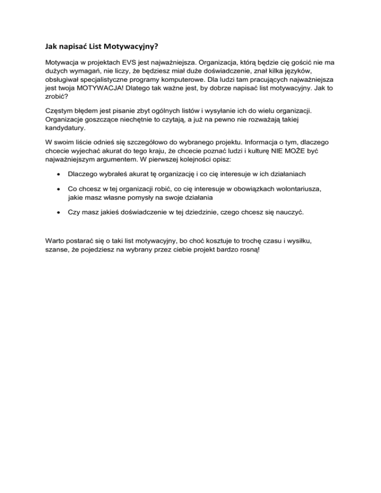 Jak napisać List Motywacyjny? Motywacja w projektach EVS jest najważniejsza. Organizacja, którą będzie cię gościć nie ma dużych wymagań, nie liczy, że będziesz miał duże doświadczenie, znał kilka języków, obsługiwał specjalistyczne programy komputerowe. Dla ludzi tam pracujących najważniejsza jest twoja MOTYWACJA! Dlatego tak ważne jest, by dobrze napisać list motywacyjny. Jak to zrobić? Częstym błędem jest pisanie zbyt ogólnych listów i wysyłanie ich do wielu organizacji. Organizacje goszczące niechętnie to czytają, a już na pewno nie rozważają takiej kandydatury. W swoim liście odnieś się szczegółowo do wybranego projektu. Informacja o tym, dlaczego chcecie wyjechać akurat do tego kraju, że chcecie poznać ludzi i kulturę NIE MOŻE być najważniejszym argumentem. W pierwszej kolejności opisz: Dlaczego wybrałeś akurat tę organizację i co cię interesuje w ich działaniach Co chcesz w tej organizacji robić, co cię interesuje w obowiązkach wolontariusza, jakie masz własne pomysły na swoje działania Czy masz jakieś doświadczenie w tej dziedzinie, czego chcesz się nauczyć. Warto postarać się o taki list motywacyjny, bo choć kosztuje to trochę czasu i wysiłku, szanse, że pojedziesz na wybrany przez ciebie projekt bardzo rosną!